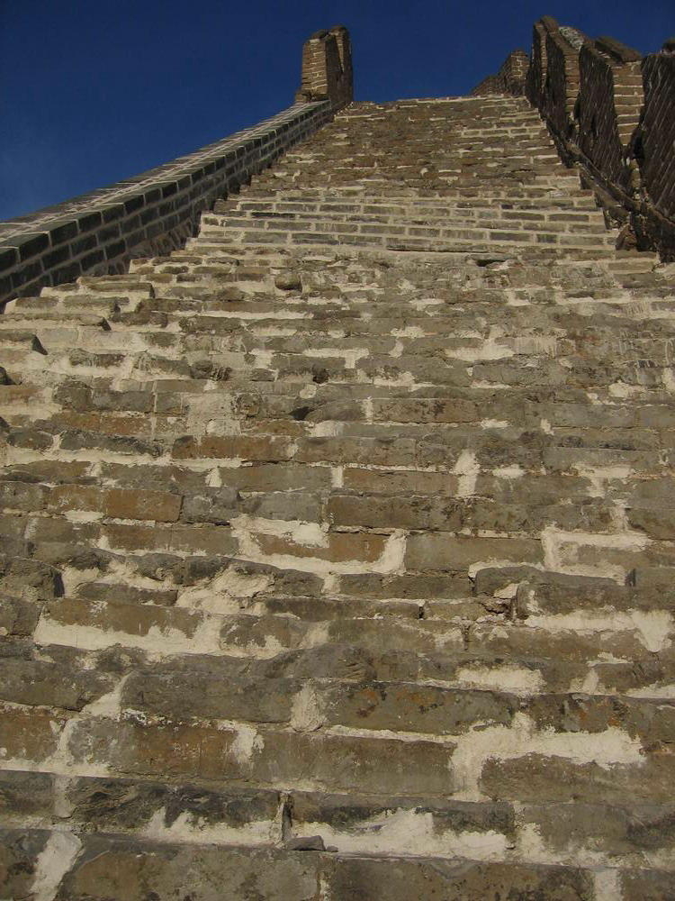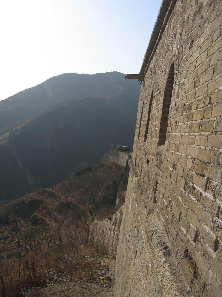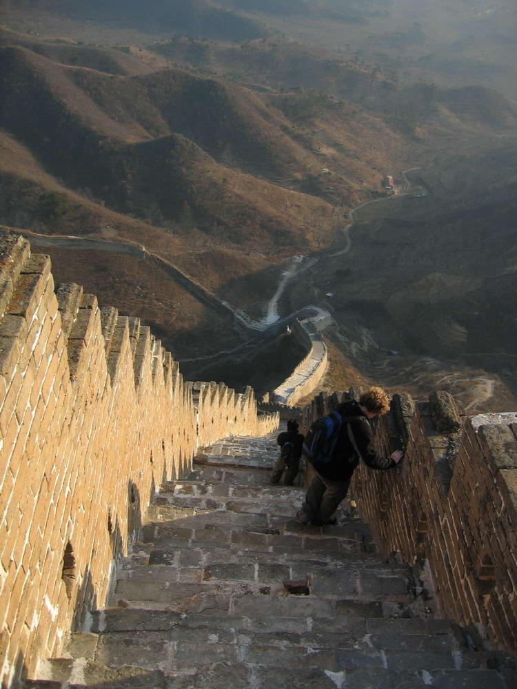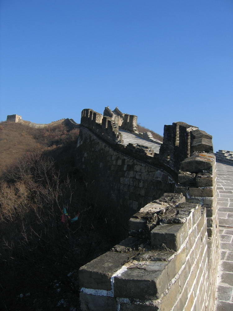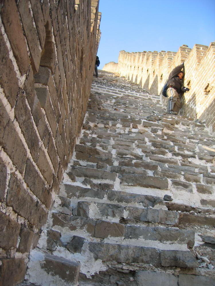 I got up on the wall and saw it went pretty much straight up. After passing two hawkers it seemed like clear sailing. At the first guard tower I heard plastic flapping and thought it’d be another ’toll.’ It was another old lady, sqwaking and holding up her five fingers and a crappy piece of cardboard with writing on it. I paid the money. The two guys I had passed came in and they started arguing with her about paying the toll. They eventually got through without paying anything. Guess it pays to know Chinese.