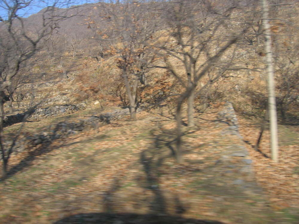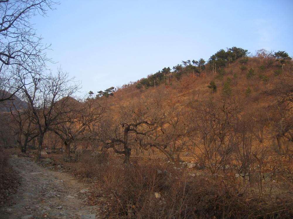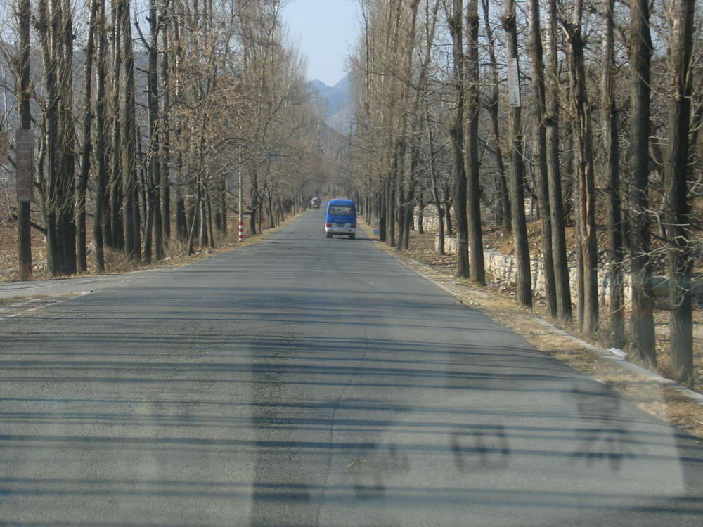After that I went to his mini-bus and we drove out towards the wall. It was a neat 2 lane road that had trees arching over the roadway and people riding their bikes along. Most of the leaves had fallen and the land was just orangish yellow from the dust and sunlight. It looked a bit like how I’d think Sleepy Hollow would look like, minus all of the Chinese people carting around branches and charcoal.