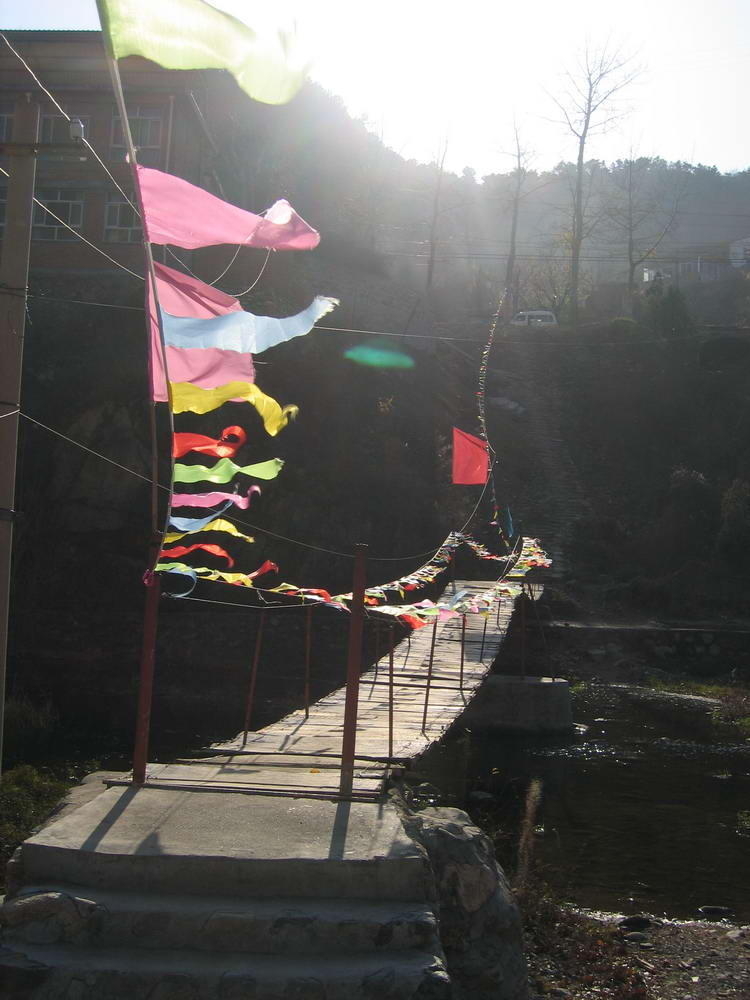 To get to the wall I went down some stairs, crossed a rickety cable bridge with scrappy looking wood slats and small cables for a guard rail. Very cool. Then I had to pay some guy 4 yuan to walk through his yard to the trail. As I went up the trail I heard some lady talking to two guys in front of me. I came up to her and she had a cardboard sign with “2 yuan” on it. And an axe on the ground. So I paid up.