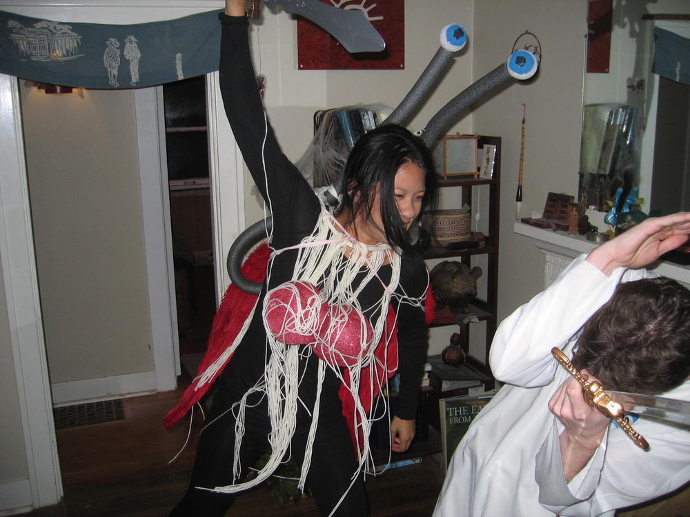We had such guests as the Flying Spaghetti Monster, Jesus and his old man God. Also had another Paul Bunyan (we had an axe fight after I chopped down an Ent.) Daisy Duke and May West were there. Along with a Salmon, a Ninja, some Pirates, Romans, Middle Age Zorro, Tooth Fairy and others. It got hazy pretty early.