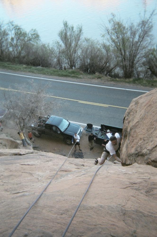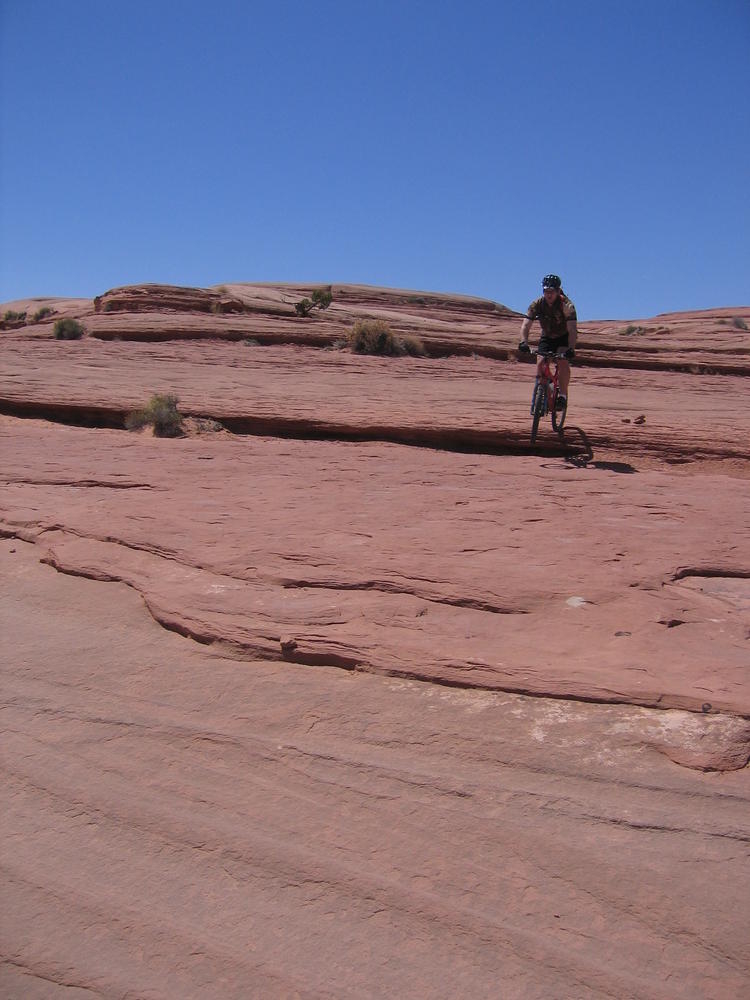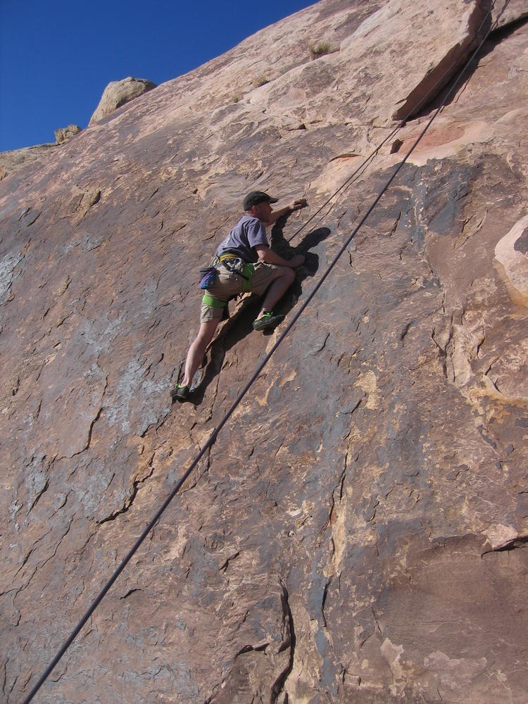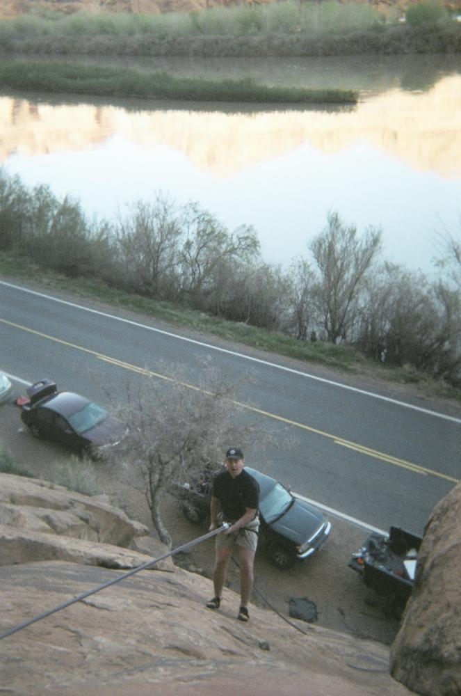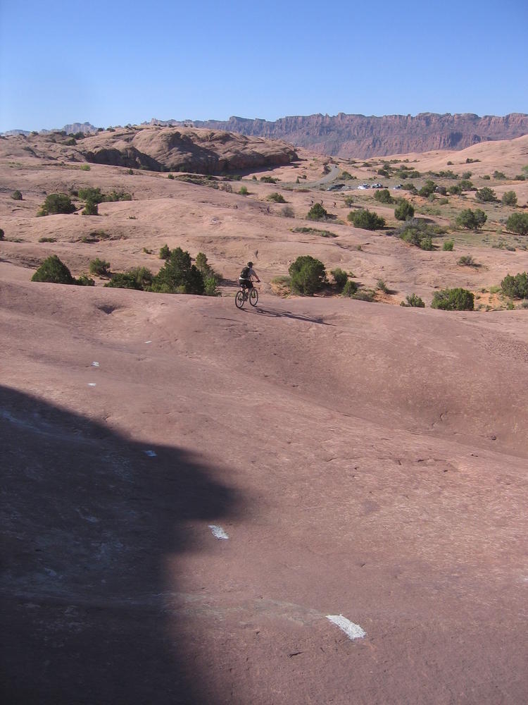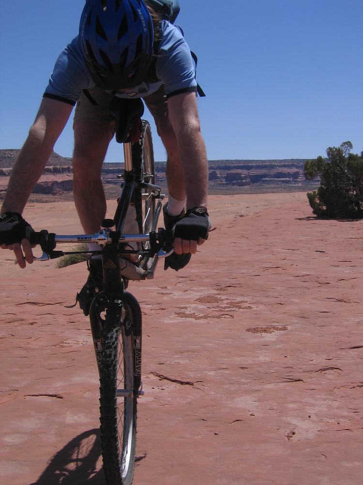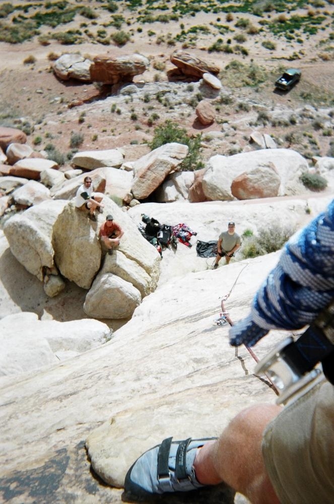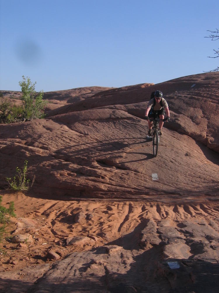 Trey, Henry and Dan came down to Moab this Tuesday and joined up with Ron and I. We started off with Monitor Merimack - as per custom, and then did Bartlet Slickrock and Amasa Back. After riding we’ve gone climbing twice so far. The first was a warm up on Potash Road (Wall Street). Dan and I went up the Fist Full Of Potash (5.10). Yesterday we drove out to Sunshine Wall and put up some top ropes on a nice slab with some 5.9s and 5.10s.