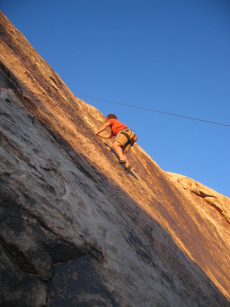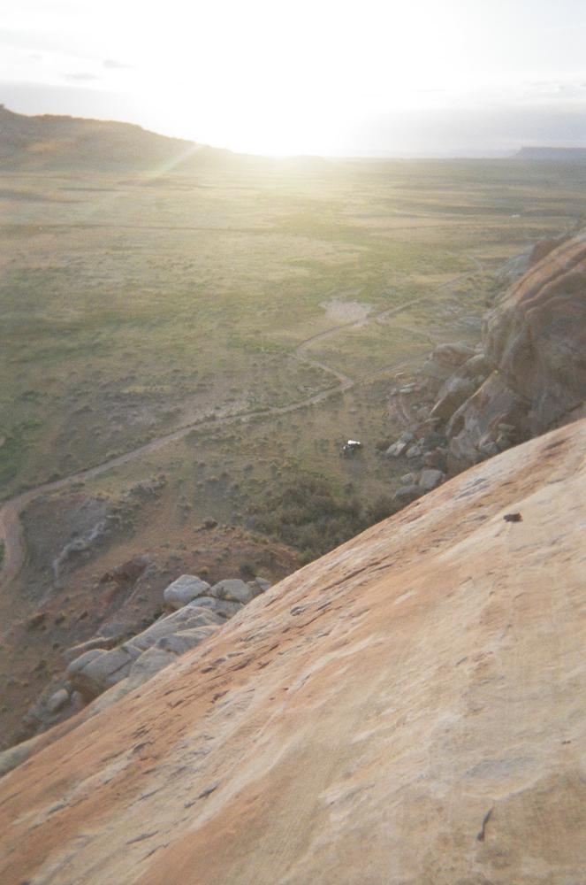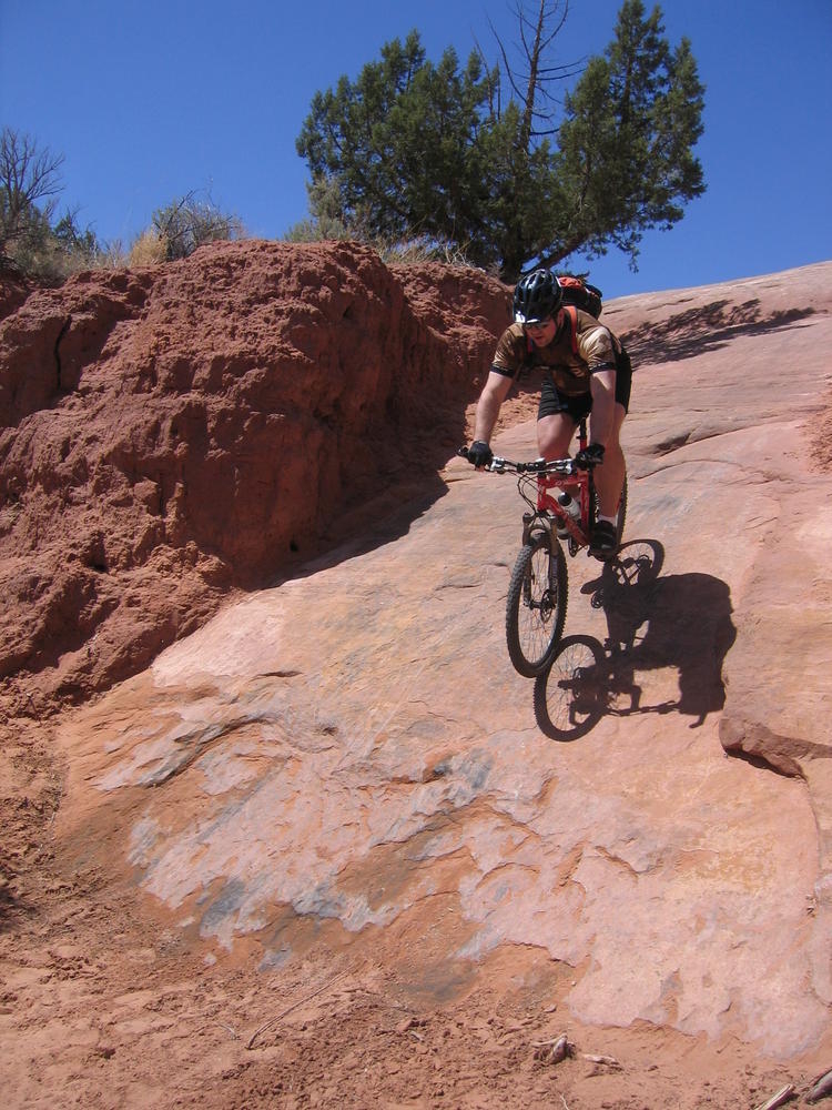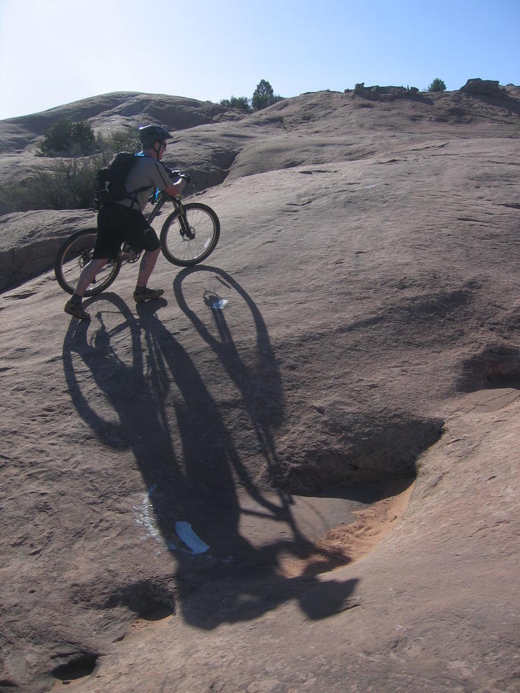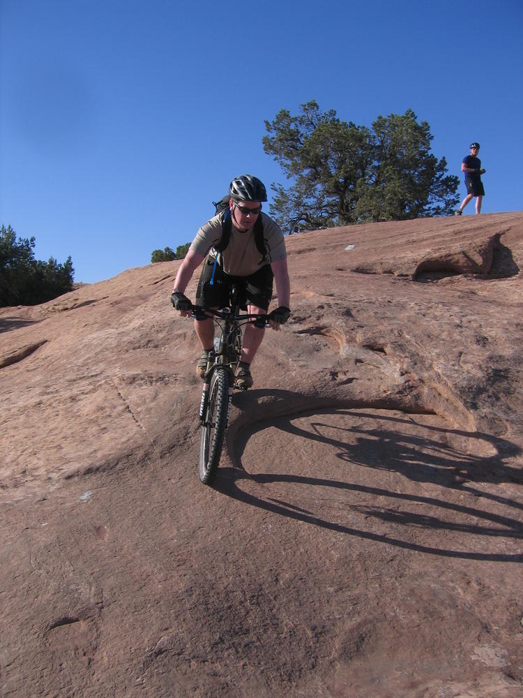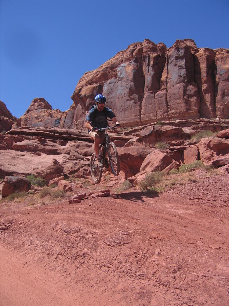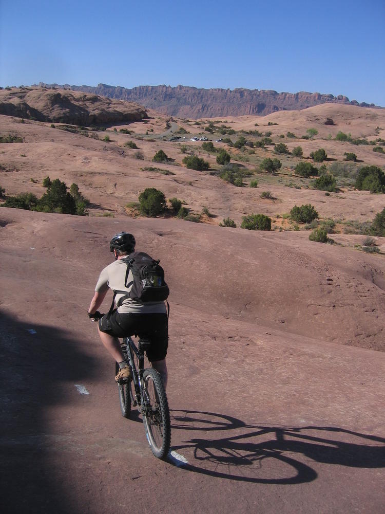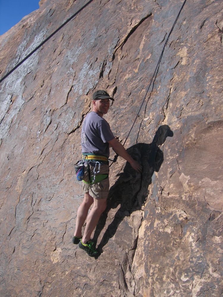 Trey, Henry and Dan came down to Moab this Tuesday and joined up with Ron and I. We started off with Monitor Merimack - as per custom, and then did Bartlet Slickrock and Amasa Back. After riding we’ve gone climbing twice so far. The first was a warm up on Potash Road (Wall Street). Dan and I went up the Fist Full Of Potash (5.10). Yesterday we drove out to Sunshine Wall and put up some top ropes on a nice slab with some 5.9s and 5.10s.