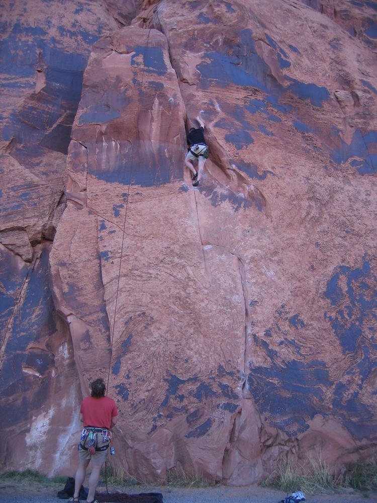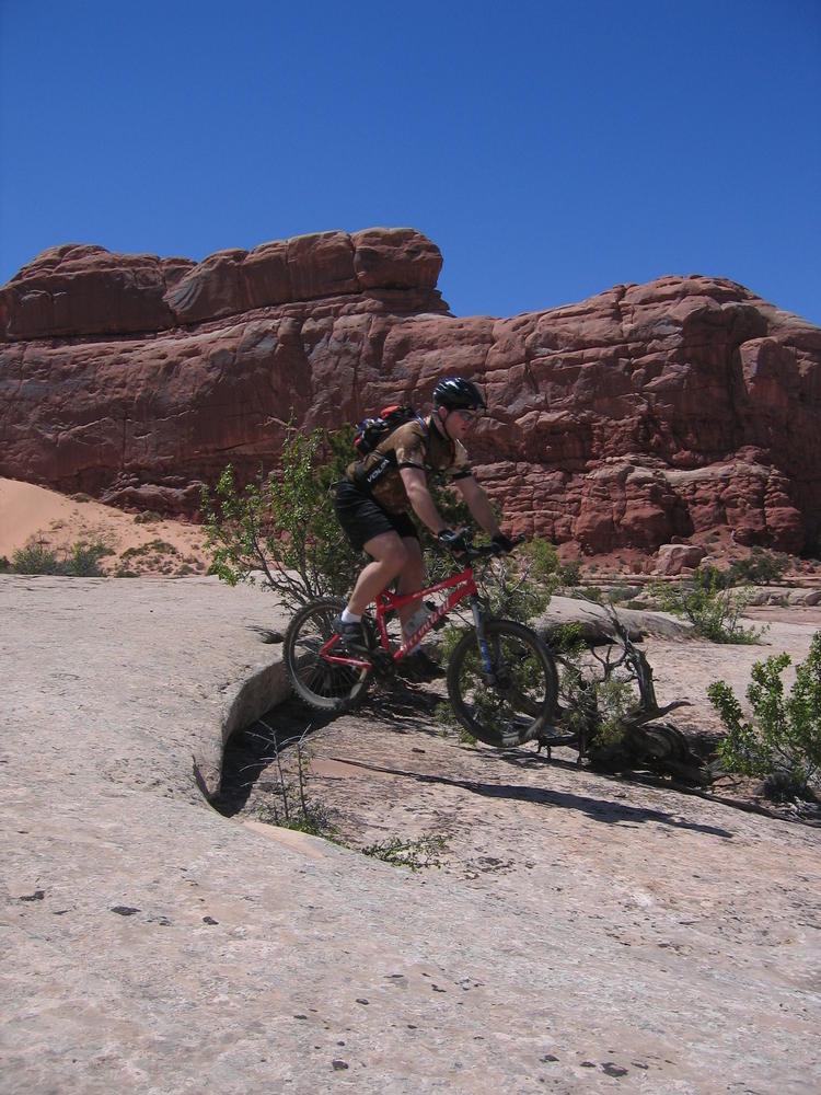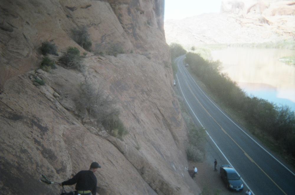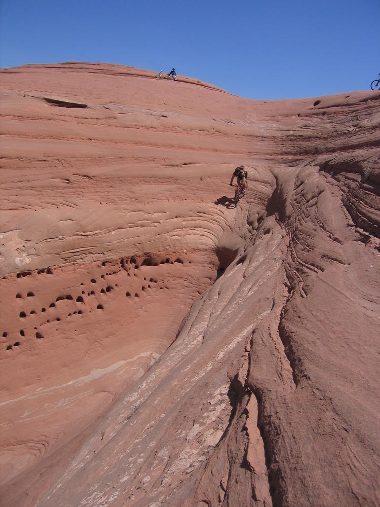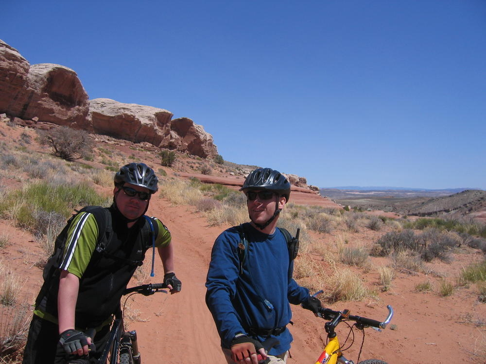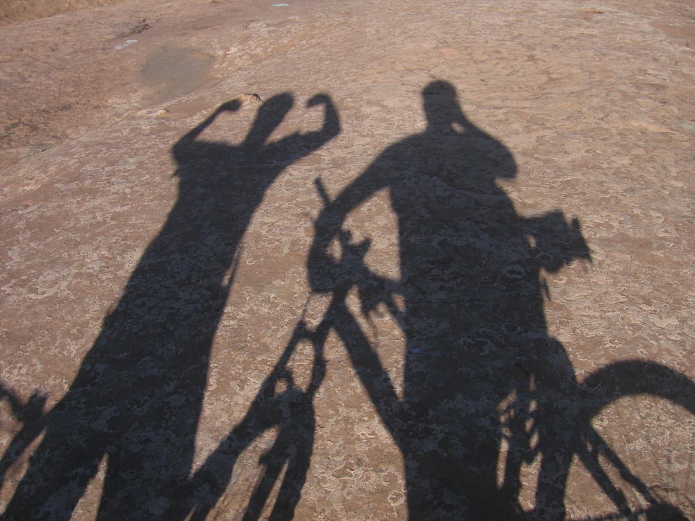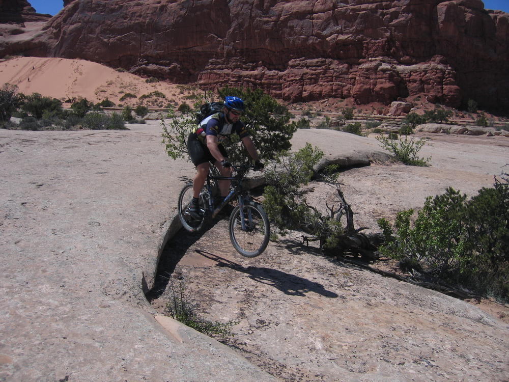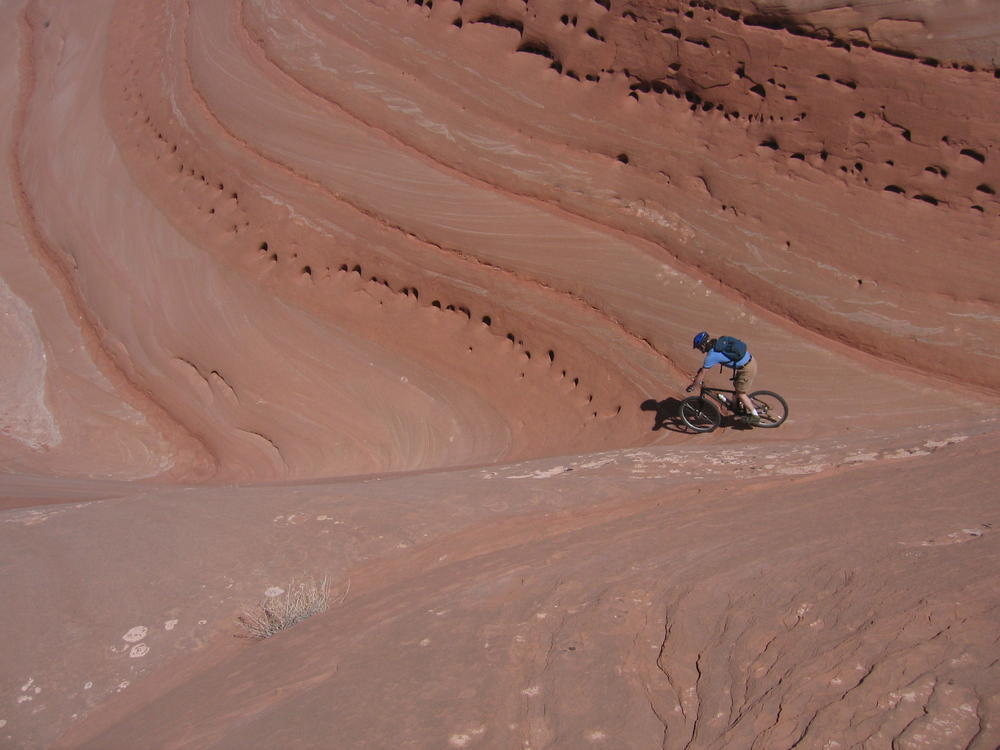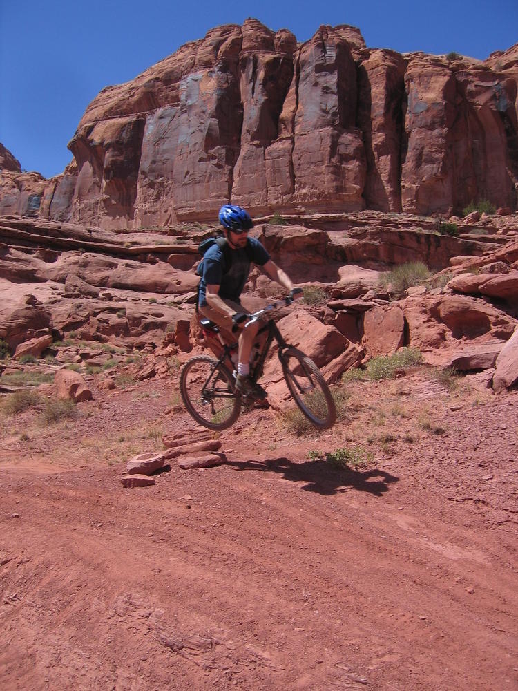 Trey, Henry and Dan came down to Moab this Tuesday and joined up with Ron and I. We started off with Monitor Merimack - as per custom, and then did Bartlet Slickrock and Amasa Back. After riding we’ve gone climbing twice so far. The first was a warm up on Potash Road (Wall Street). Dan and I went up the Fist Full Of Potash (5.10). Yesterday we drove out to Sunshine Wall and put up some top ropes on a nice slab with some 5.9s and 5.10s.