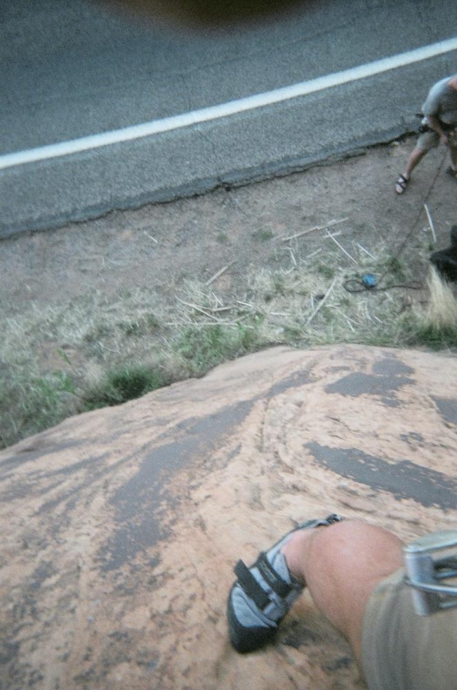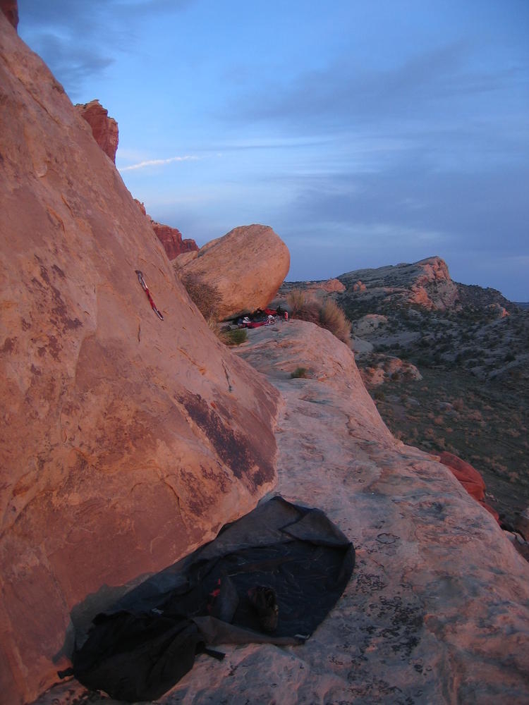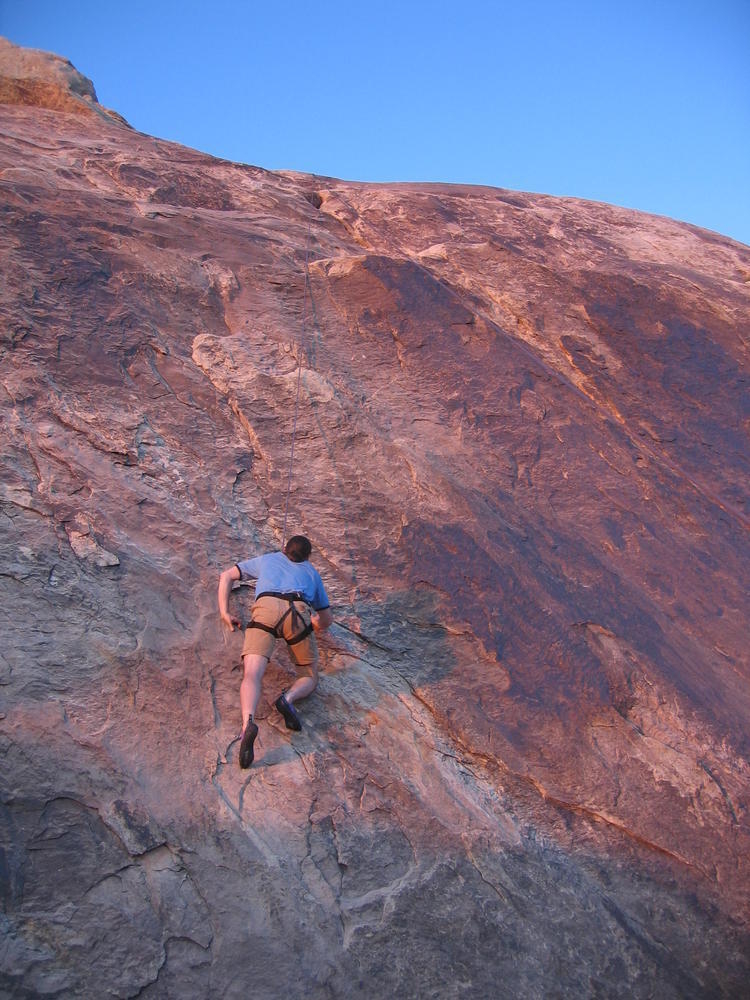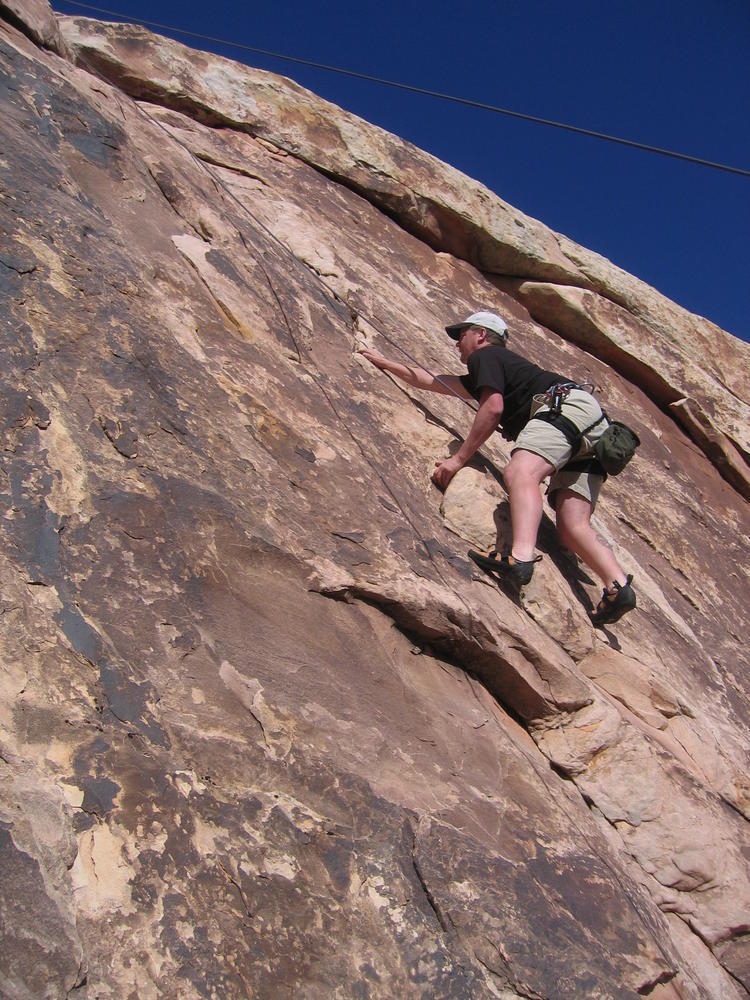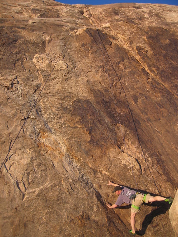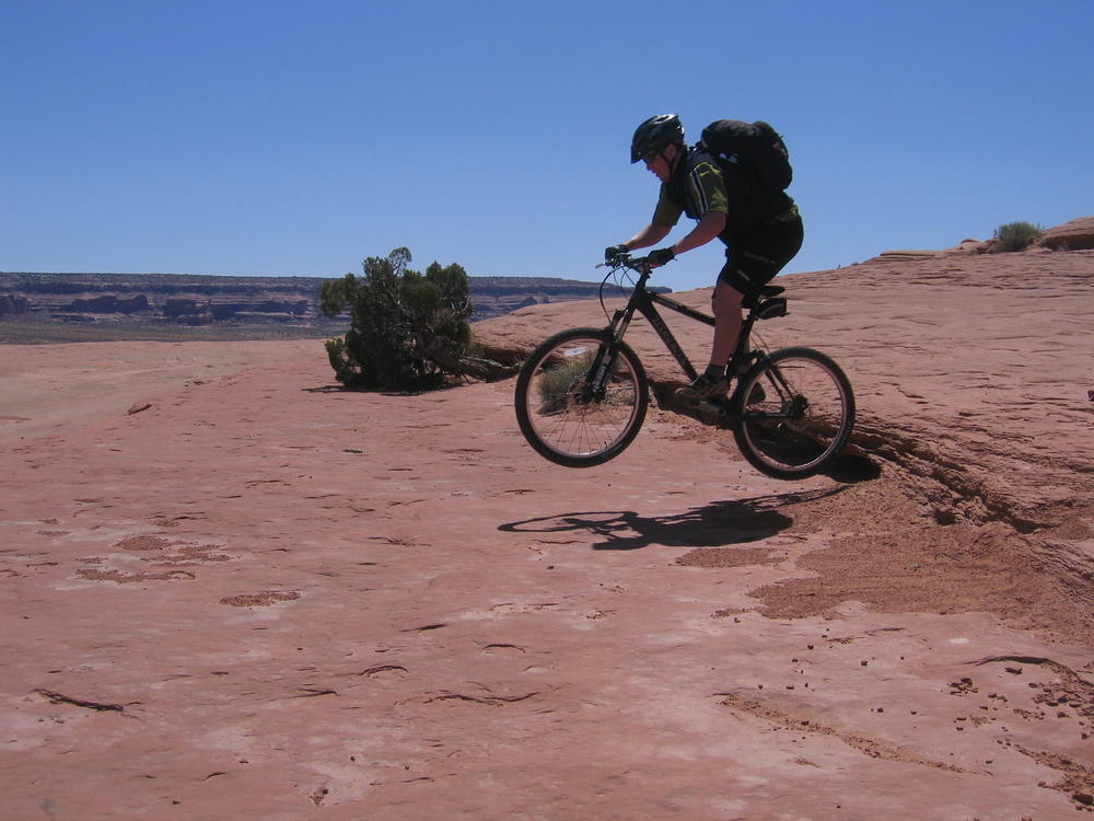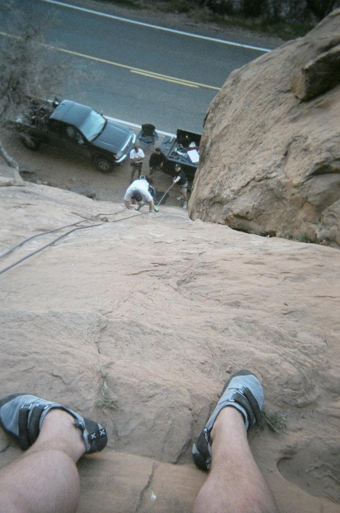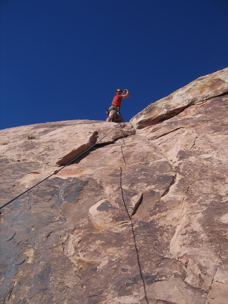 Trey, Henry and Dan came down to Moab this Tuesday and joined up with Ron and I. We started off with Monitor Merimack - as per custom, and then did Bartlet Slickrock and Amasa Back. After riding we’ve gone climbing twice so far. The first was a warm up on Potash Road (Wall Street). Dan and I went up the Fist Full Of Potash (5.10). Yesterday we drove out to Sunshine Wall and put up some top ropes on a nice slab with some 5.9s and 5.10s.