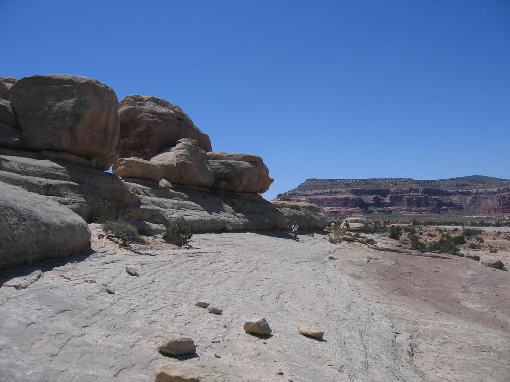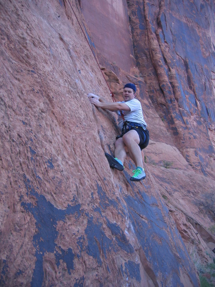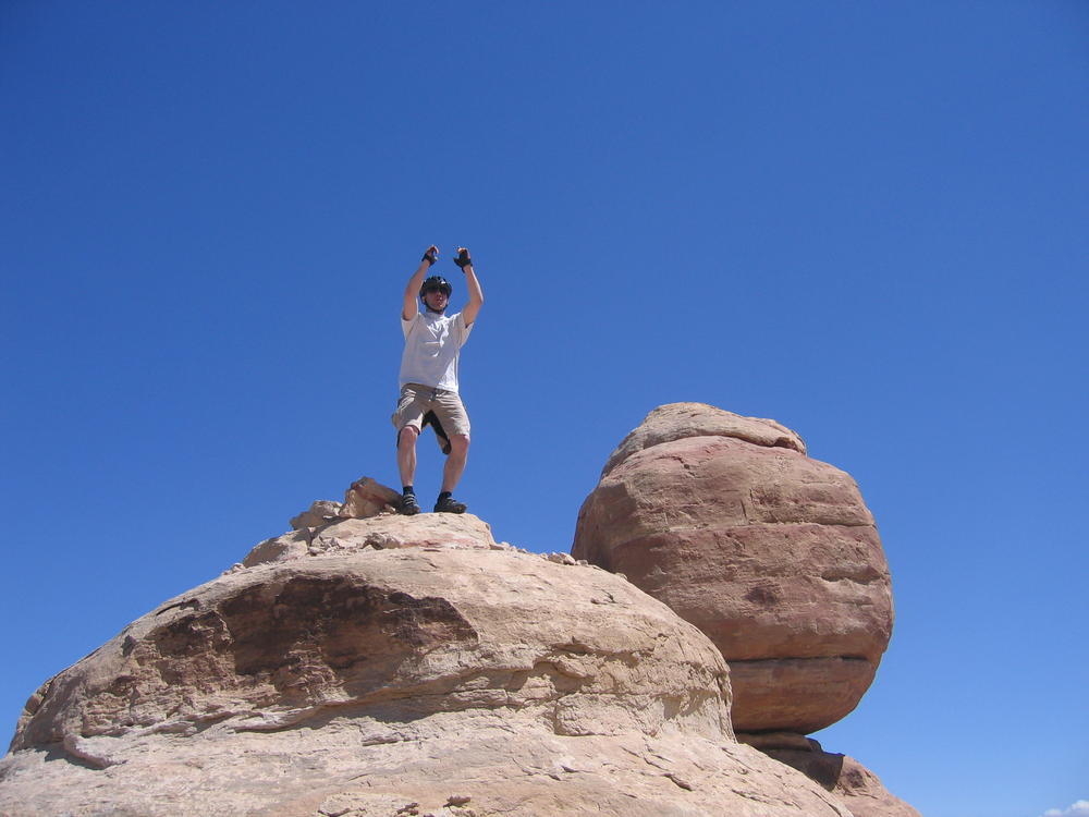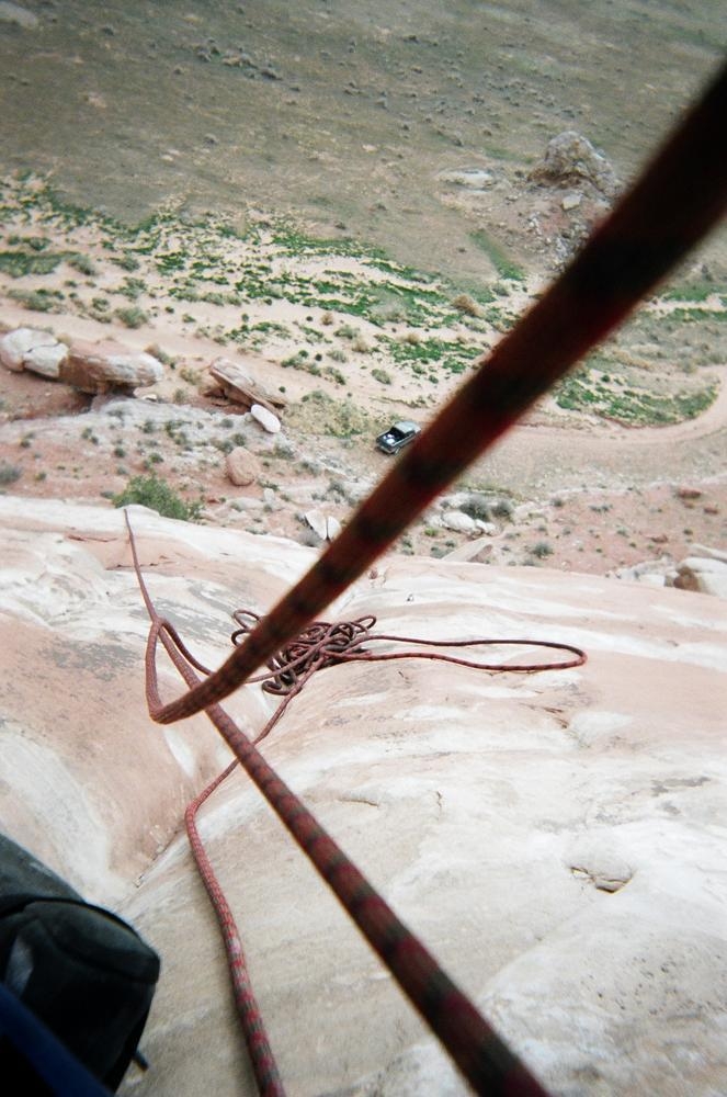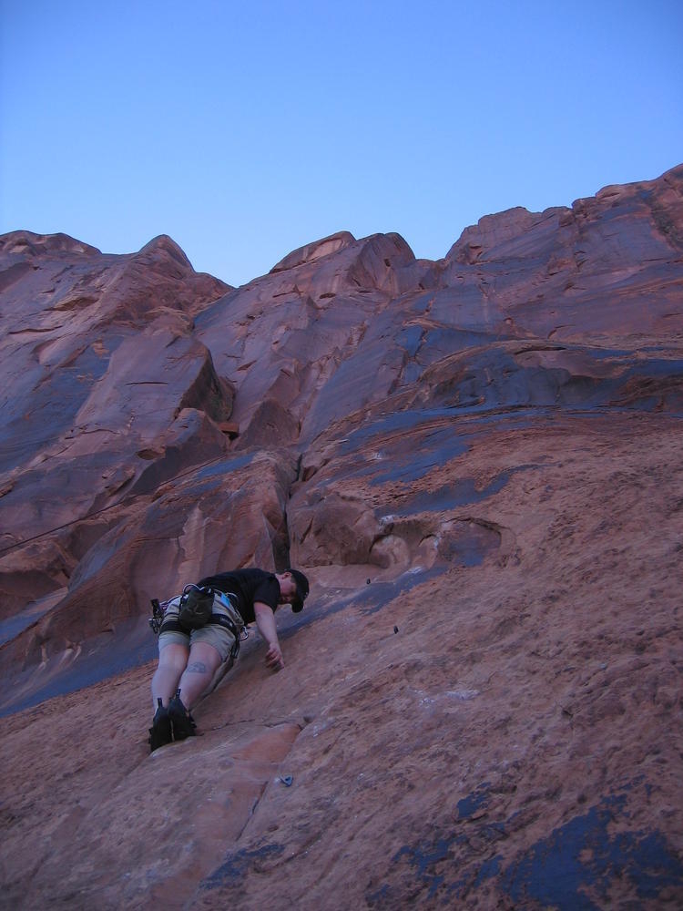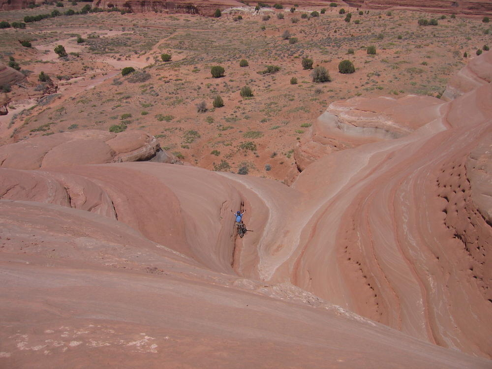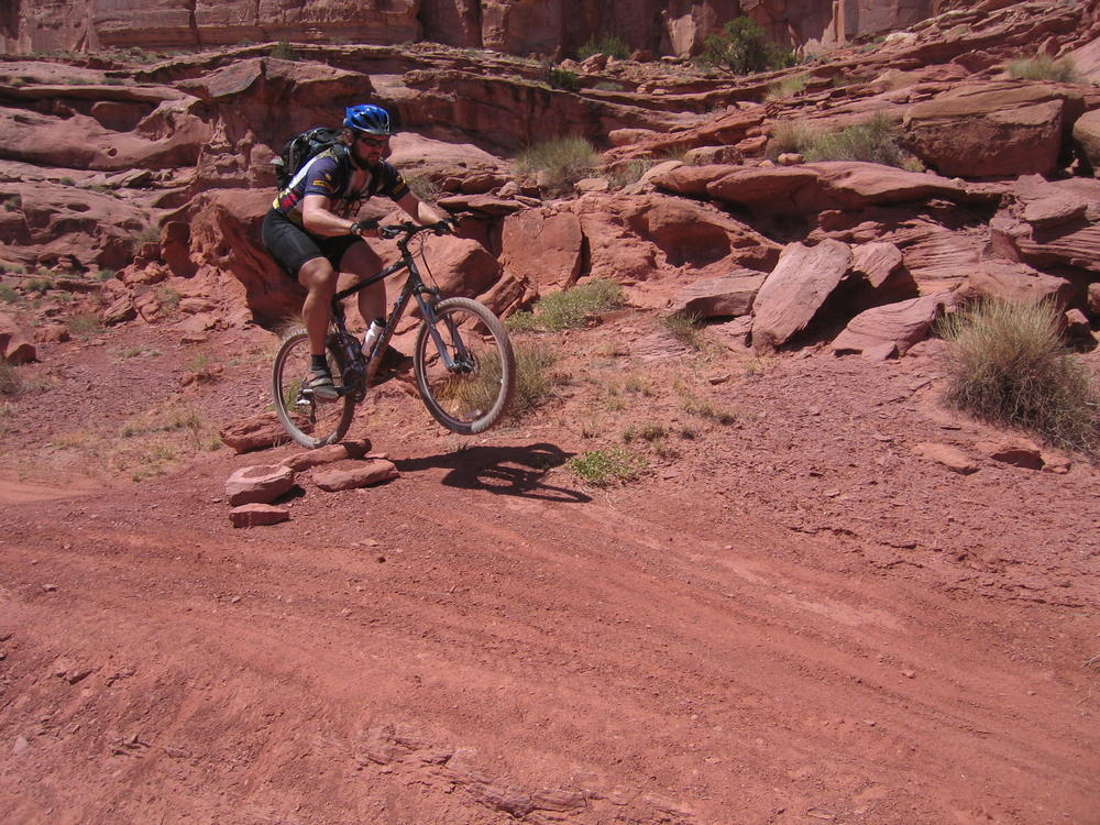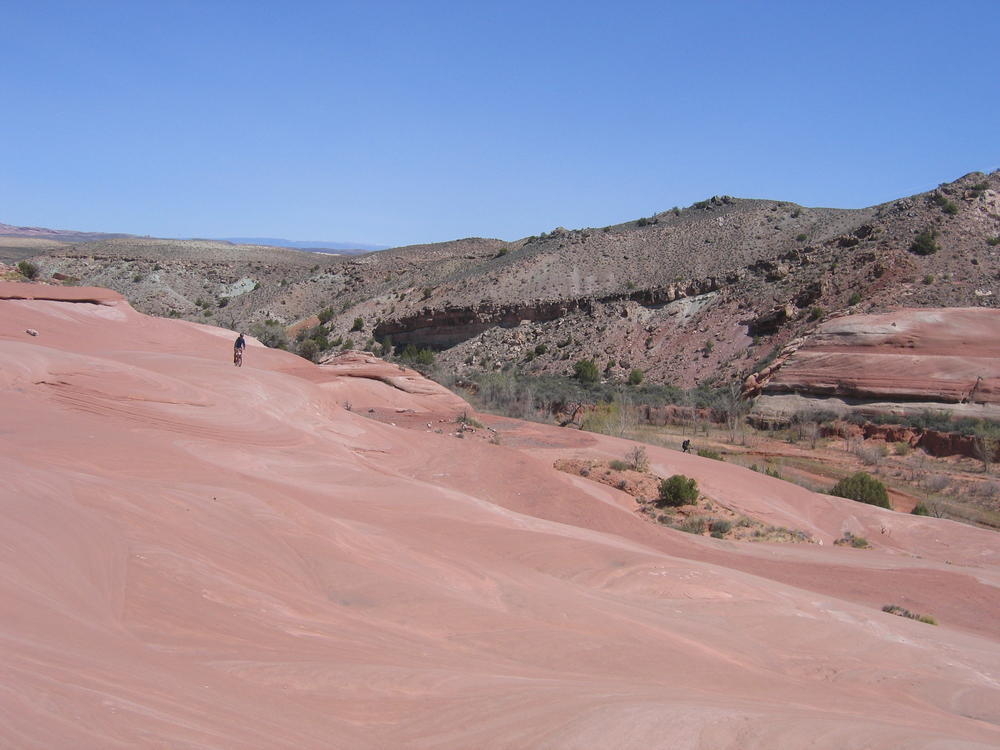 Trey, Henry and Dan came down to Moab this Tuesday and joined up with Ron and I. We started off with Monitor Merimack - as per custom, and then did Bartlet Slickrock and Amasa Back. After riding we’ve gone climbing twice so far. The first was a warm up on Potash Road (Wall Street). Dan and I went up the Fist Full Of Potash (5.10). Yesterday we drove out to Sunshine Wall and put up some top ropes on a nice slab with some 5.9s and 5.10s.