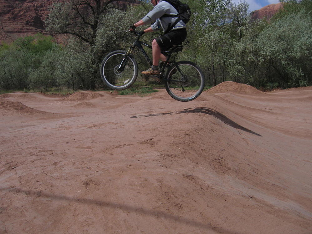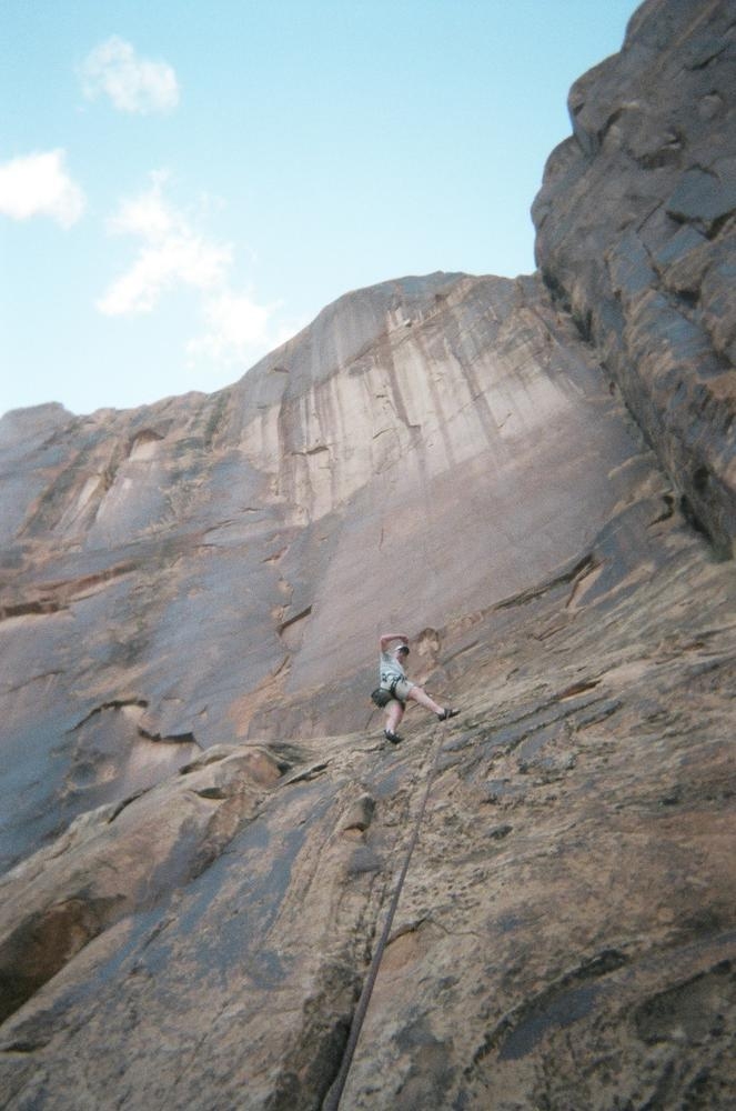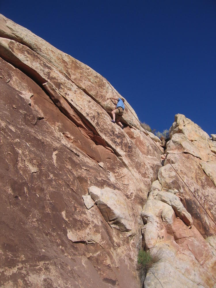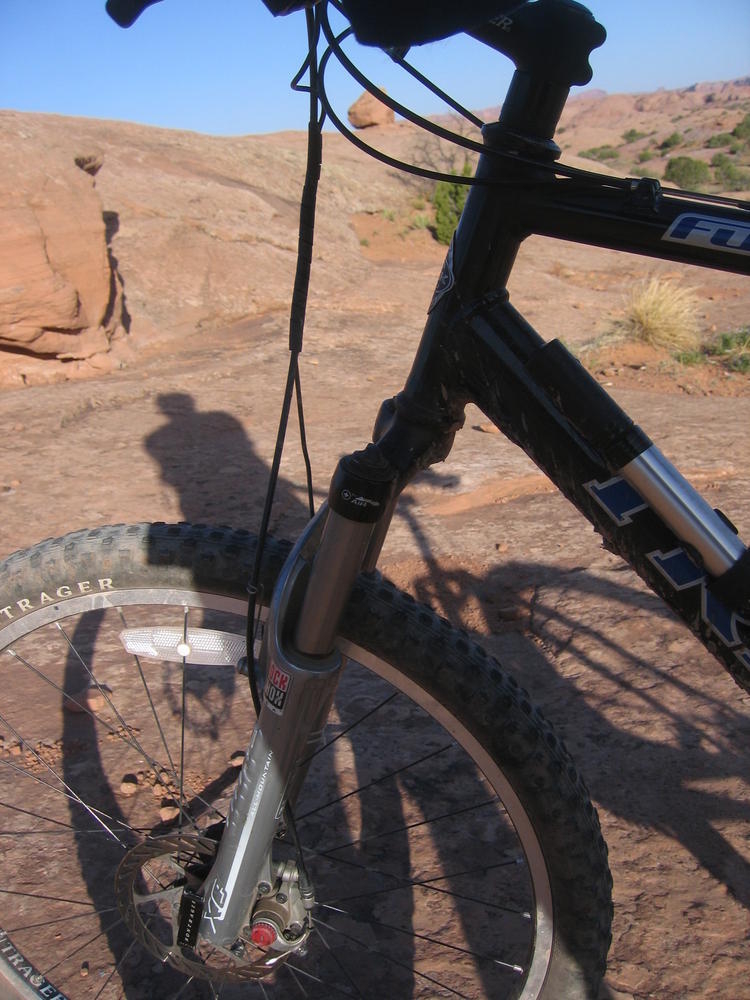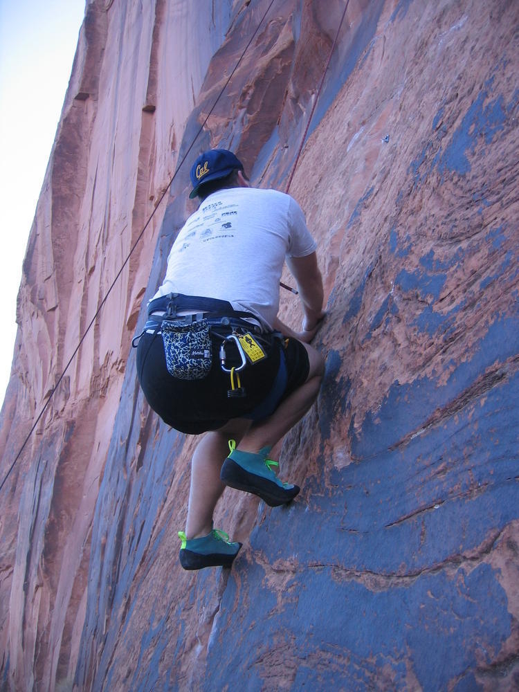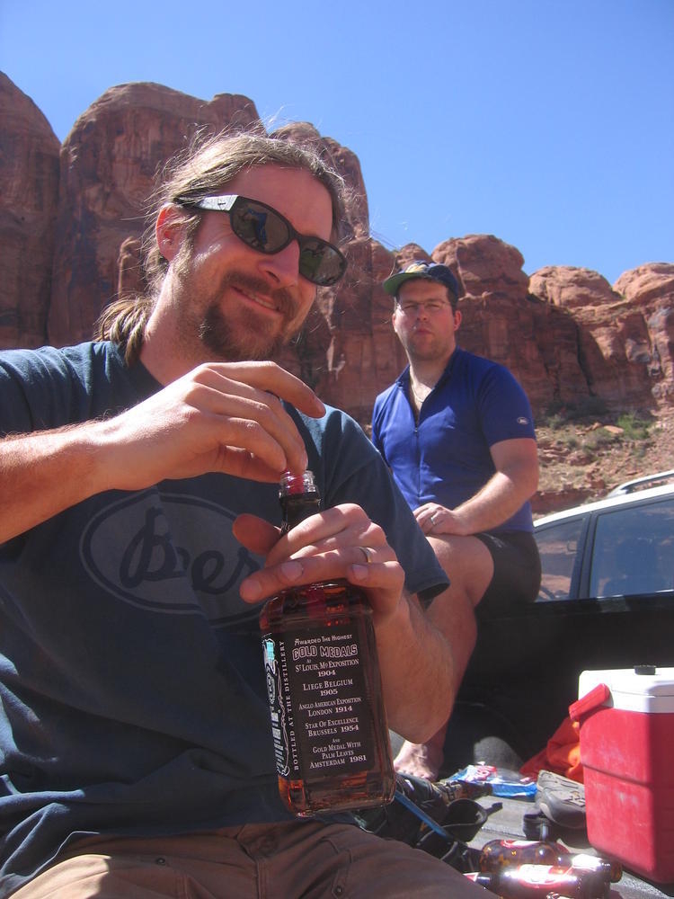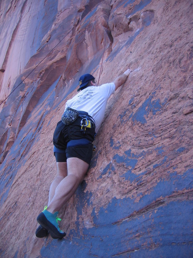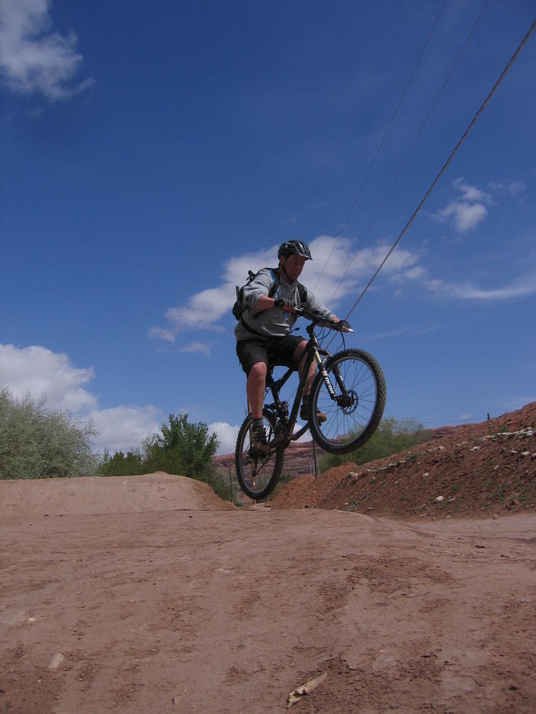 Trey, Henry and Dan came down to Moab this Tuesday and joined up with Ron and I. We started off with Monitor Merimack - as per custom, and then did Bartlet Slickrock and Amasa Back. After riding we’ve gone climbing twice so far. The first was a warm up on Potash Road (Wall Street). Dan and I went up the Fist Full Of Potash (5.10). Yesterday we drove out to Sunshine Wall and put up some top ropes on a nice slab with some 5.9s and 5.10s.