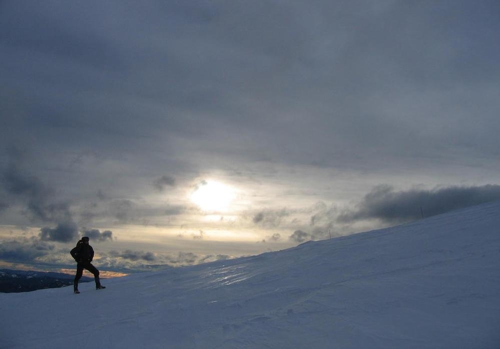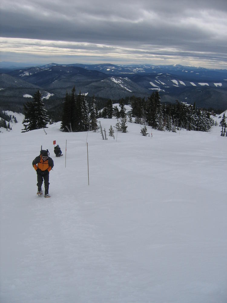 Today Matt, Keevin and I went up to Timberline Lodge to get in a little hike at altitude and practiceour basic snow technique. We went above Palmer almost to Illumation Rock, but it was blowing snow pretty hard, so we took off back down. We spent about 2 hours practicing self arrest, belaying on the snow and catching each others falls on rope. It was a pretty kick ass time.