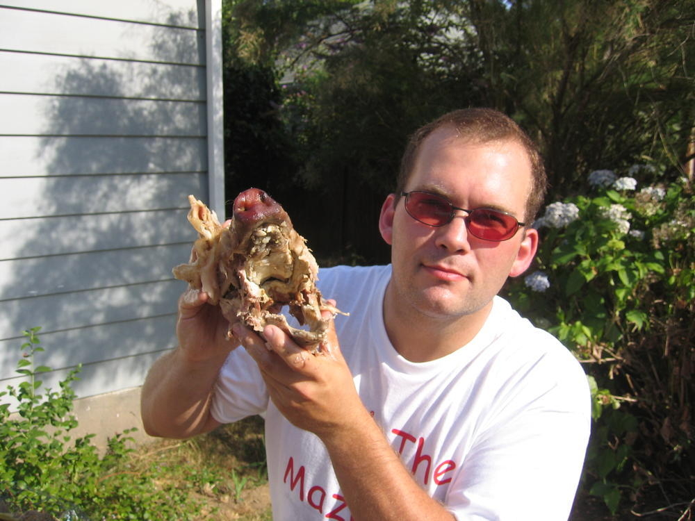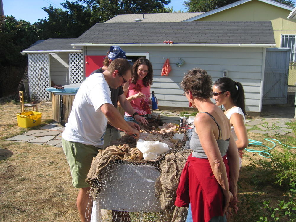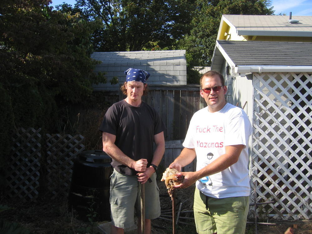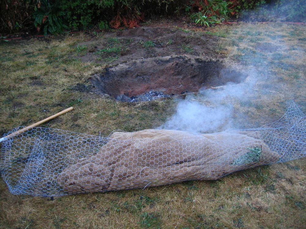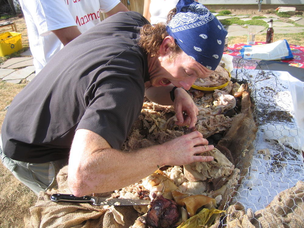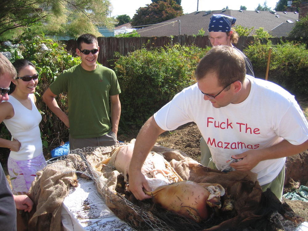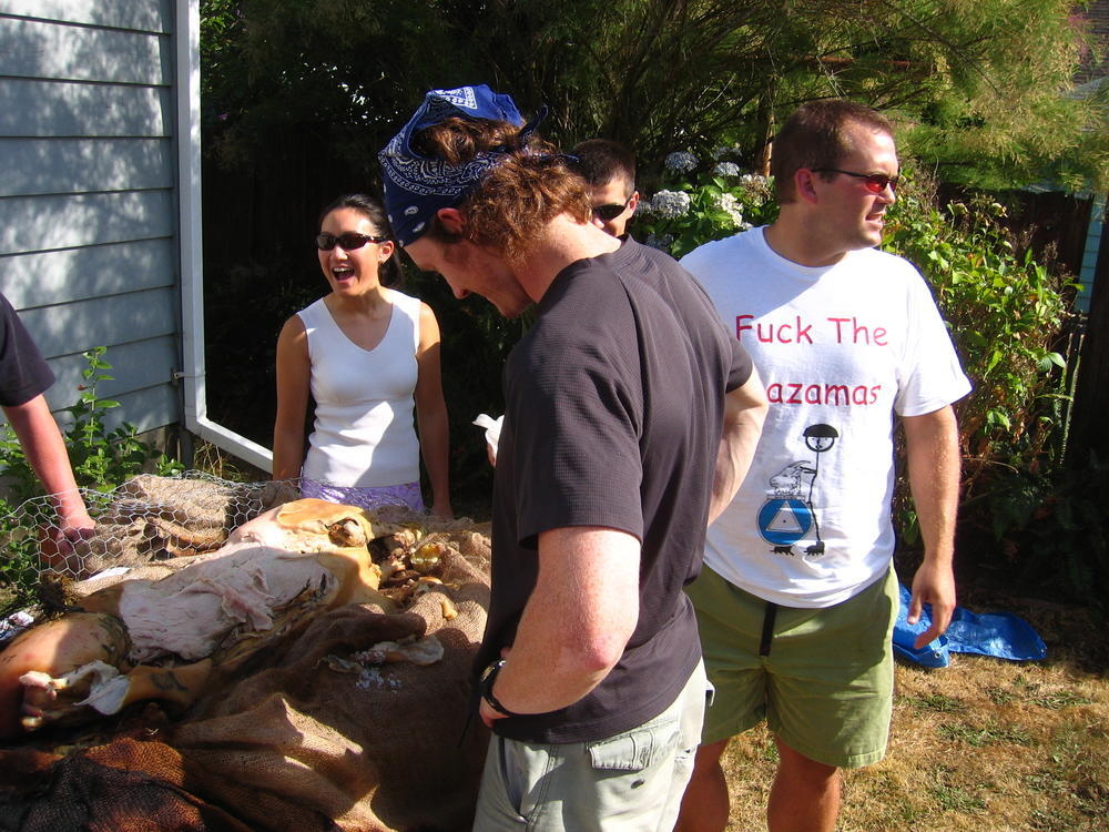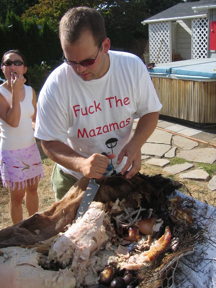 Last weekend I threw another pig roast. We learned a few things from the last years roast, namely to start drinking beer earlier. This year I got larger lava rock from the Cascades and we started the fire earlier and had about 8 hours of rock cook time. The pig ended up getting cooked to 160 degrees by 1pm, in just 5 hours. Where as last year it took at least 10 hours to get to 140. So it was more sucessful with the hotter rock. Steve (the pig) came out nicely cooked at 173 degrees and the skin just fell off and it was very easy to get the meat off of Steve.