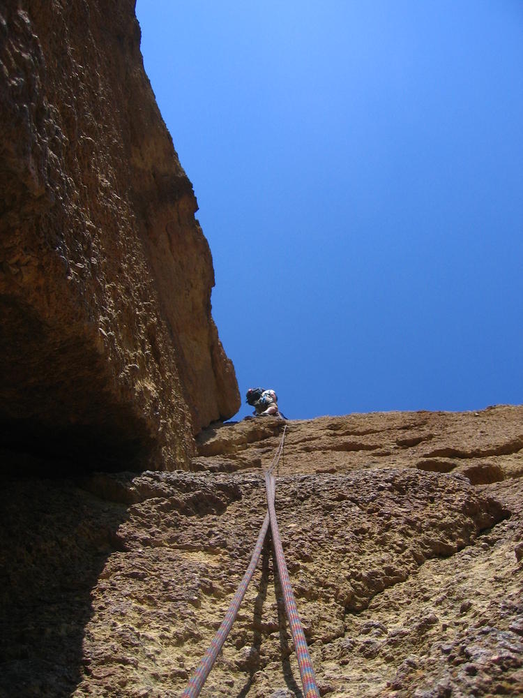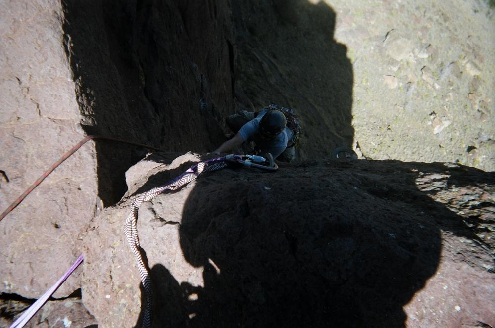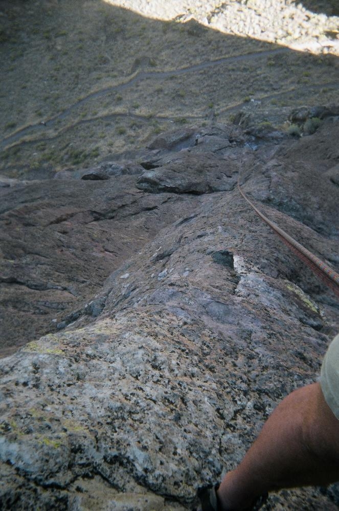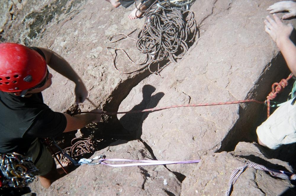 On Sunday Ron and I got up earlish and ran over to Spiderman. We were going to do it “quickly” so we could meet up with Jen and Angel over near Cinnamon Slab and get them up a few routes. It took us like 4 hours to top out and walk over to rapell down to the ladies who were waiting in the heat. The climb was great going up and Ron was psyched to do it.
