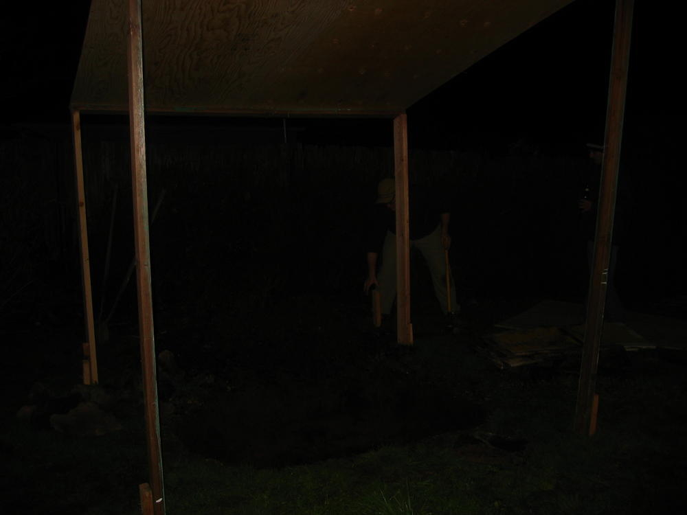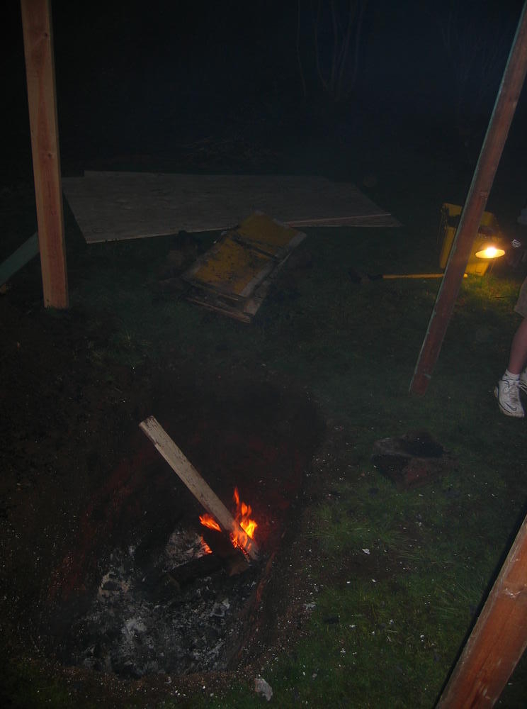 In preparations for the lamb roast this weekend we (Dan, Ron and I) built a little hut over the pit. Hopefully if it rains the roof will keep most of the water off of the fire while we run around like pagans drinking beer and burning wood.