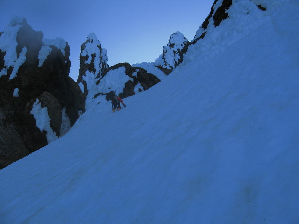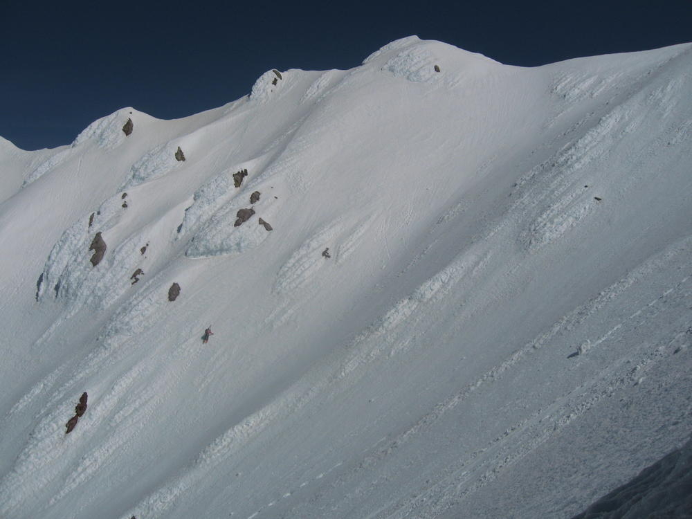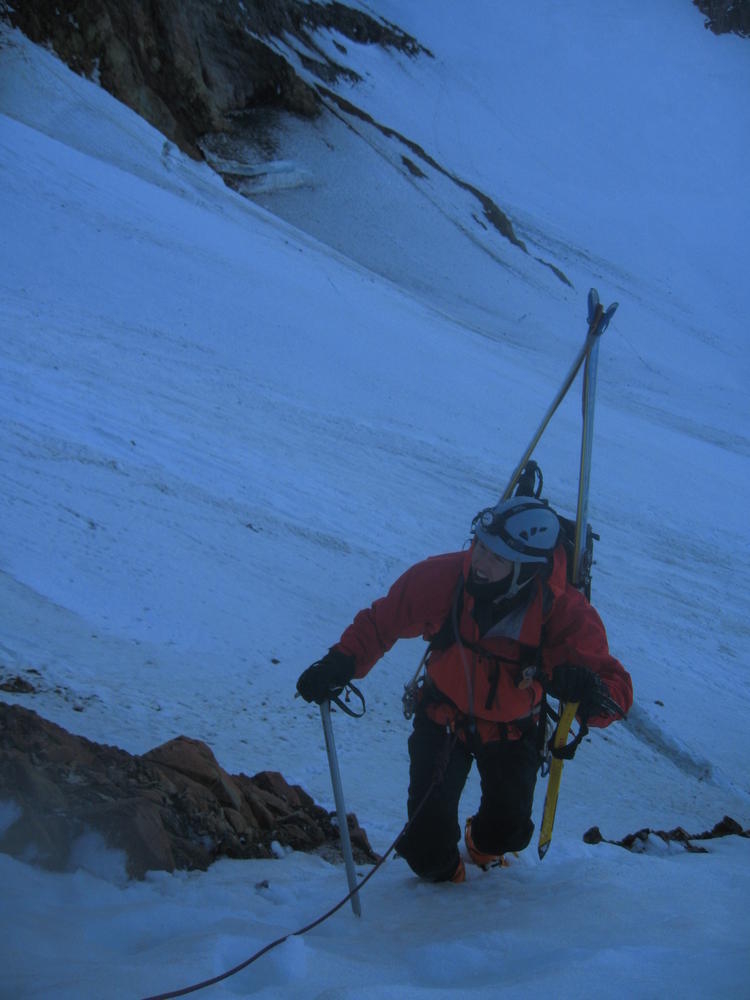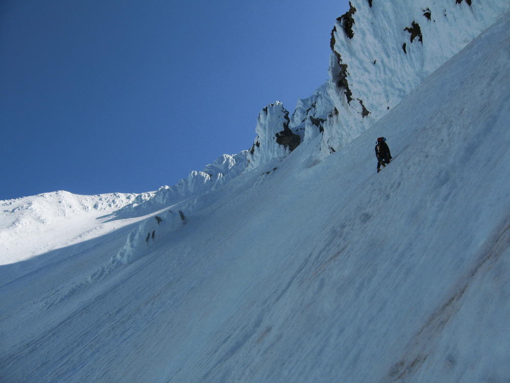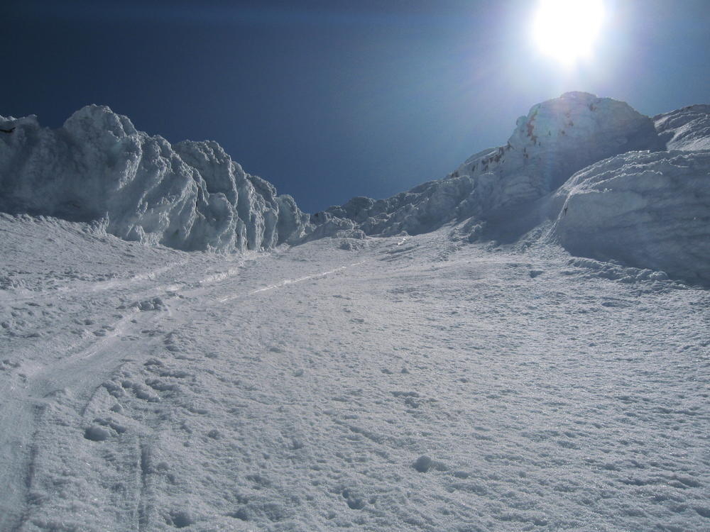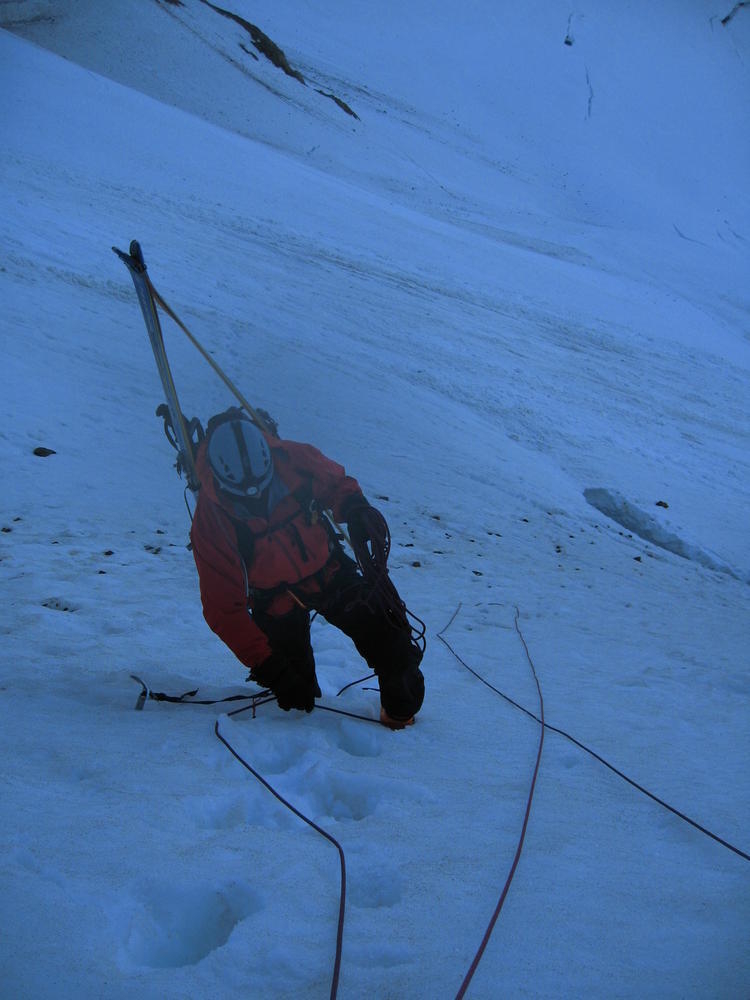 We stayed on the summit for about 2 minutes before heading down the Pearly Gates. Keevin got hit on the head twice with ice in the Gates. I followed last and went the wrong way around the Bergshrund before doubling back. As I followed the boot pack across below the Bergshrund my left leg broke through the snow and was in the air. I was up to my waist and fumbled around for a while until I could fan out on the snow and get myself out. I made it over to Keevin who was passed out on the Hogsback and shared the last of my water and I threw on sunscreen - about 4 hours too late.