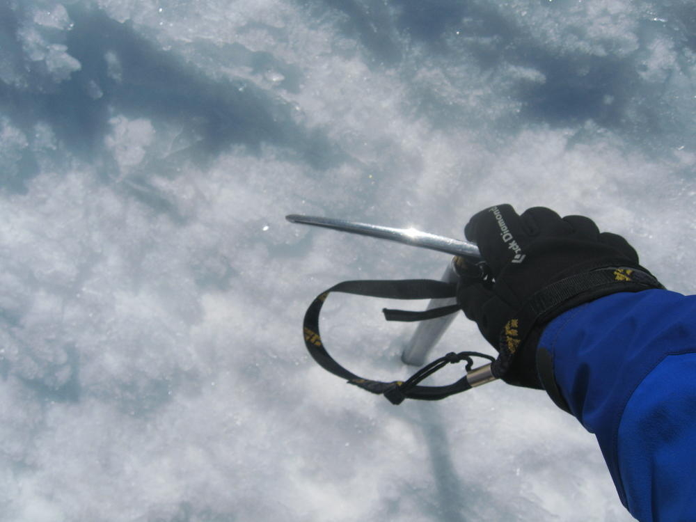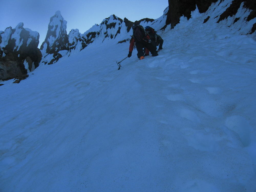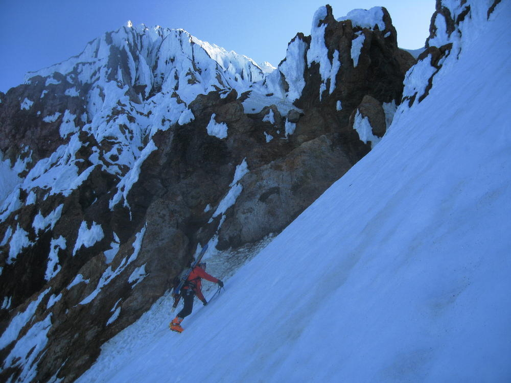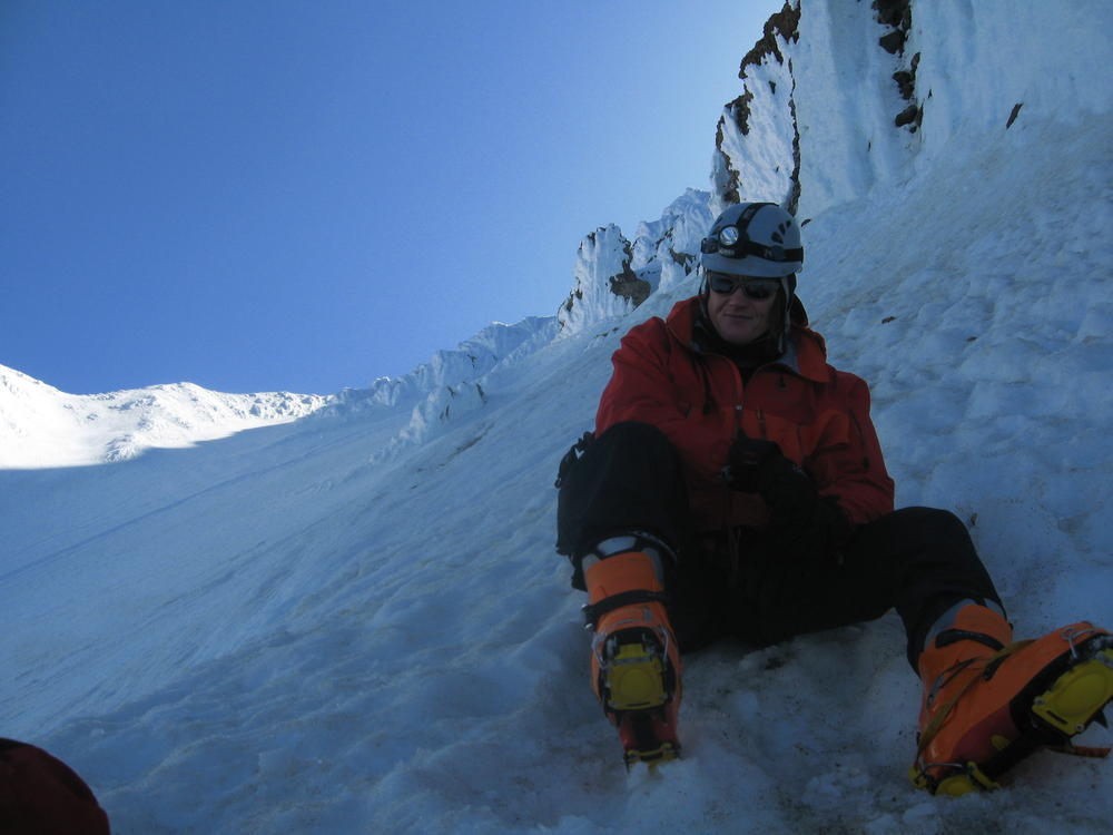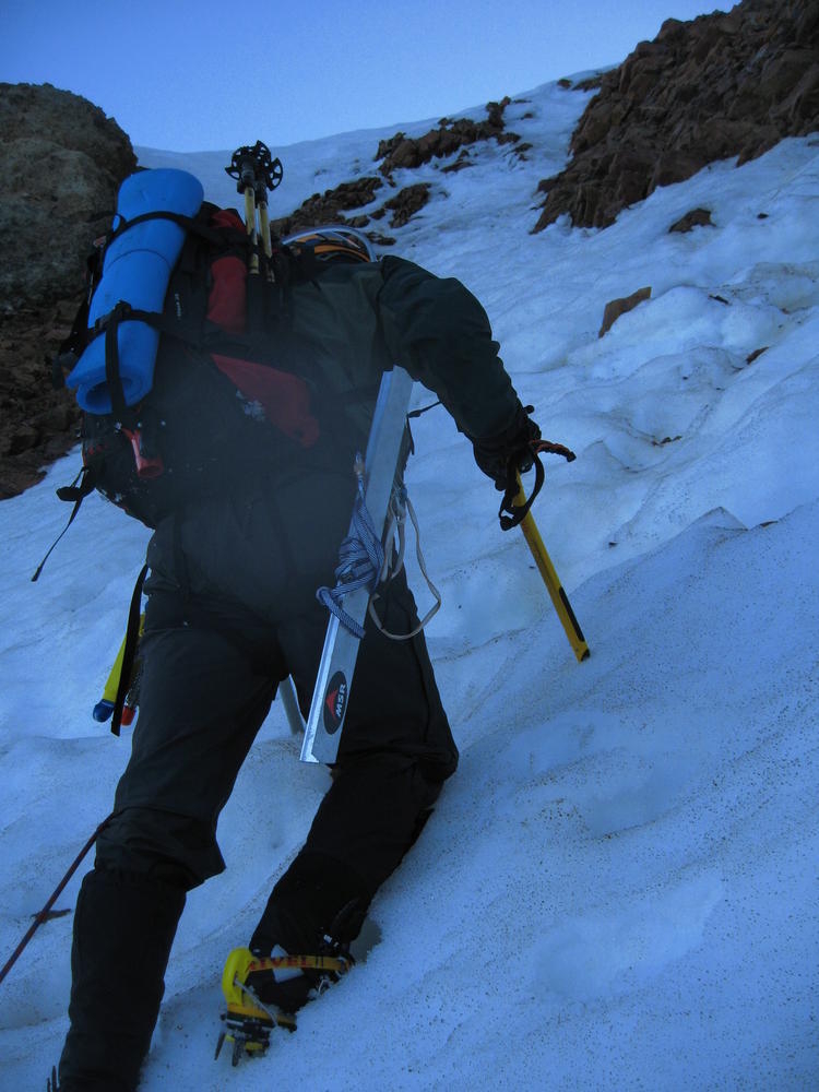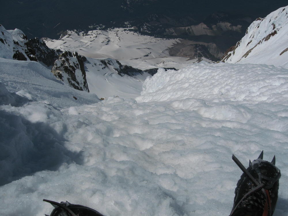 We stayed on the summit for about 2 minutes before heading down the Pearly Gates. Keevin got hit on the head twice with ice in the Gates. I followed last and went the wrong way around the Bergshrund before doubling back. As I followed the boot pack across below the Bergshrund my left leg broke through the snow and was in the air. I was up to my waist and fumbled around for a while until I could fan out on the snow and get myself out. I made it over to Keevin who was passed out on the Hogsback and shared the last of my water and I threw on sunscreen - about 4 hours too late.