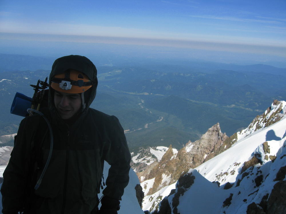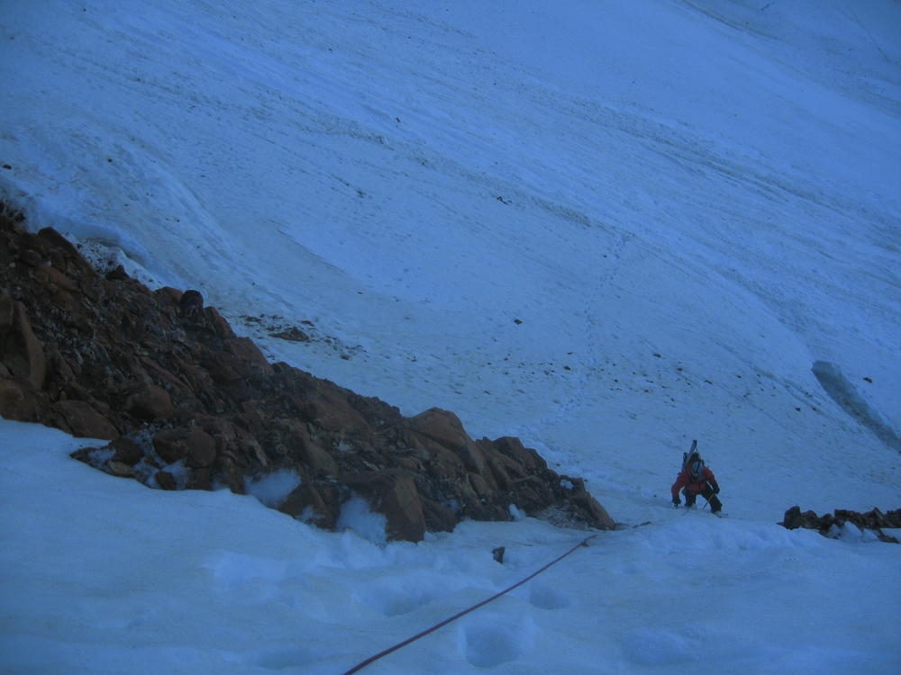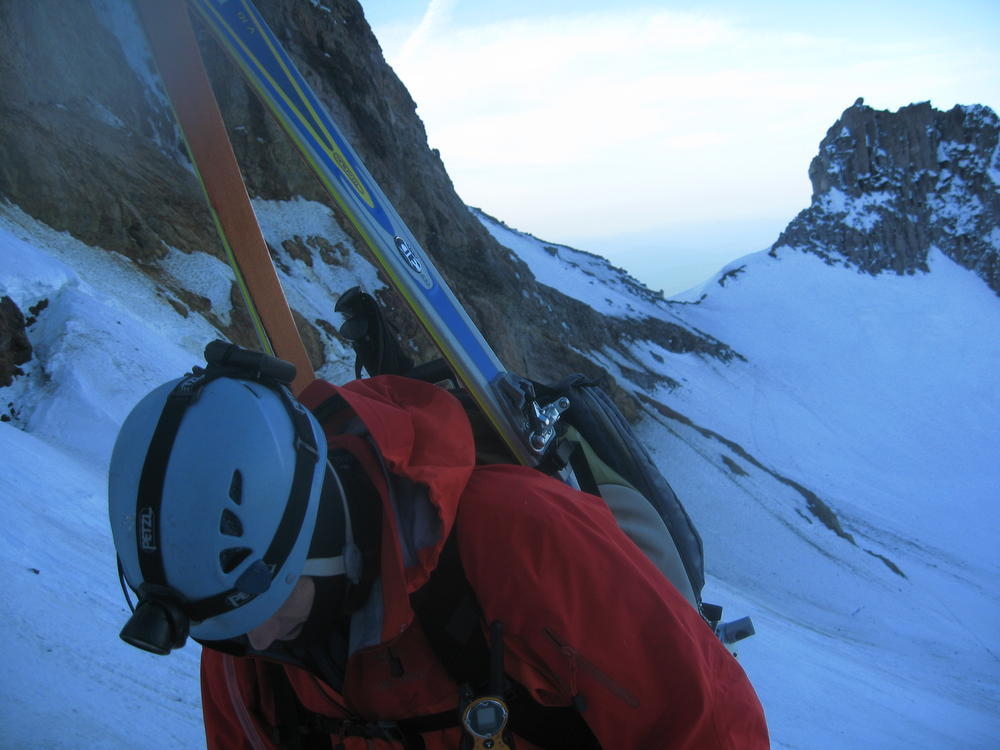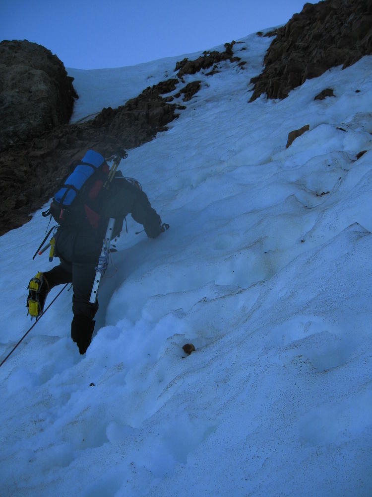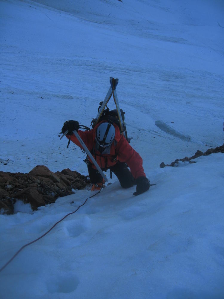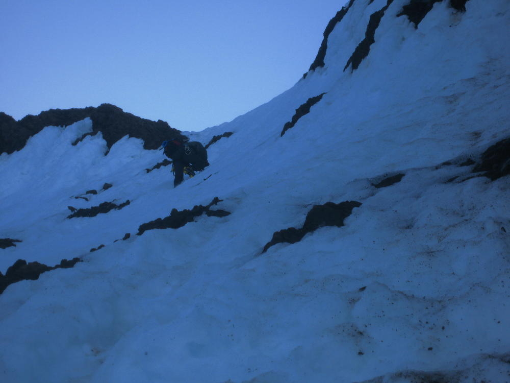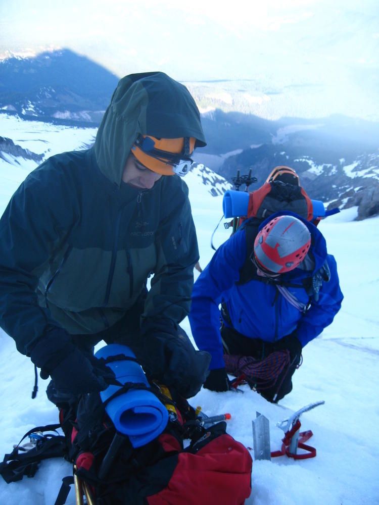 Keevin, Matt and I went up on Hood to do the Luthold Couloir. We made awesome time to the top of the Palmer lift and then headed over towards Illumination Rock. From here on the snow was pretty loose and we postholed everywhere. We cramponed up at Illumination where Keevin lost his blue butt pad. We went over the saddle and took the wrong way over to the route we wanted. We ended up going up the Reid Glacier Headwall. We got in a cool section of mixed climbing that was pretty thin in parts. This was last fun part of the climb. I promptly took off my helmet to remove my hat and dropped my headlamp down the glacier. Keevin said it was gettable, but it had taken 30 minutes to get from where the lamp now was. So I called it an expensive lesson.
