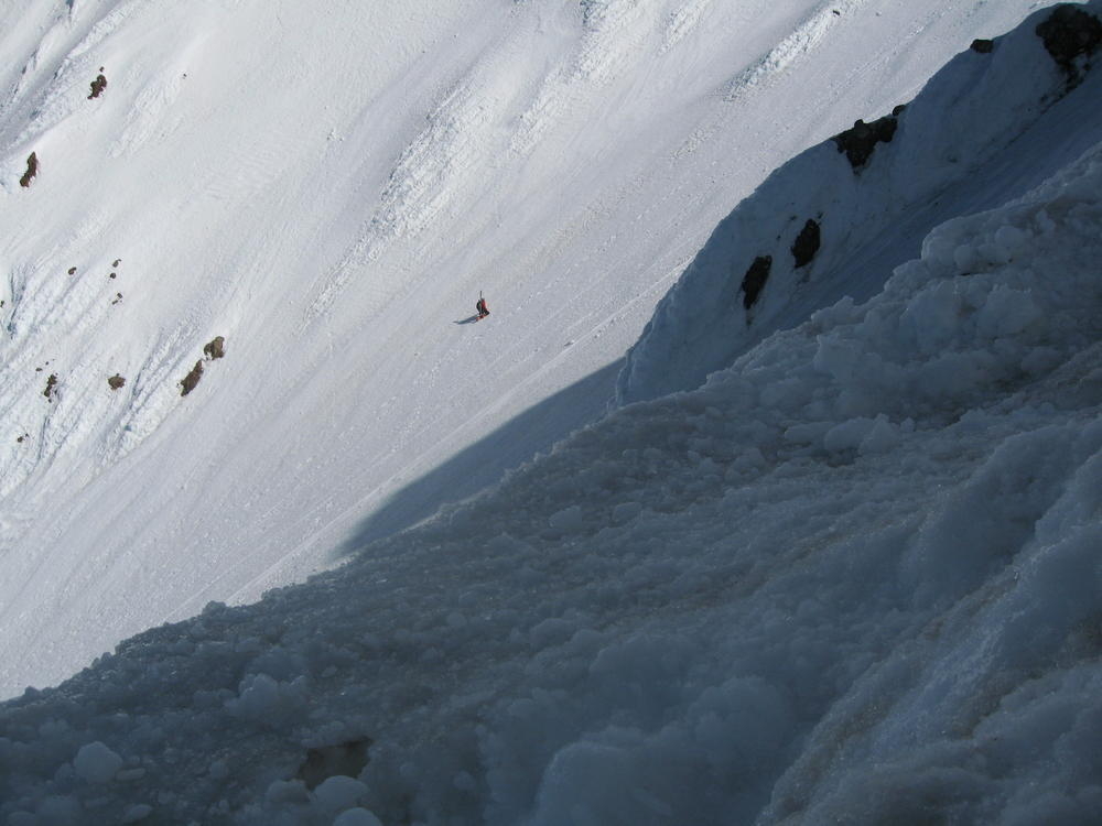 Keevin took a different route up to the summit ridge than Matt and I. I just followed Matt as I was too tired to make my own plan. We saw Keevin off to the north taking a route in the sun. I was a little concerned about avalanches as the sun was on the already warm snow. We could hear him swearing as he slowly made his way up. Once on the ridge I hung out and saw Keevin lying down on his ridge. I radioed for him to meet me up higher on the next ridge so we could split some gatorade and M&Ms.