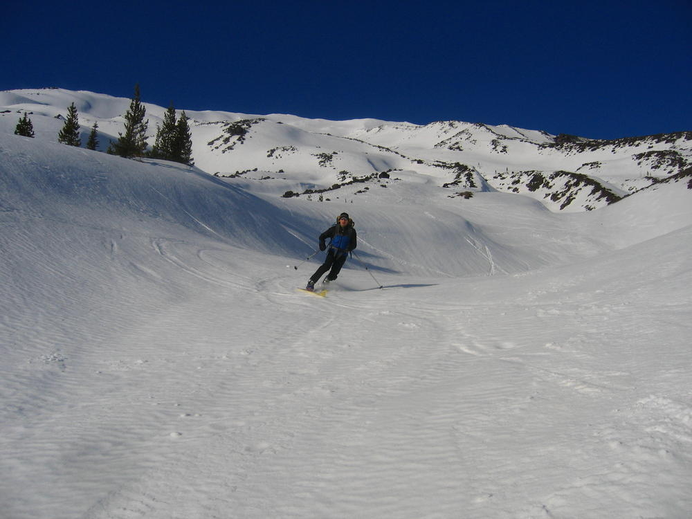 I made one successful turn and then fell on every turn after that. My best was falling head down hill and then flipping over my head.So I took off the skiis and carried them down with my broken pole (from fall #8).