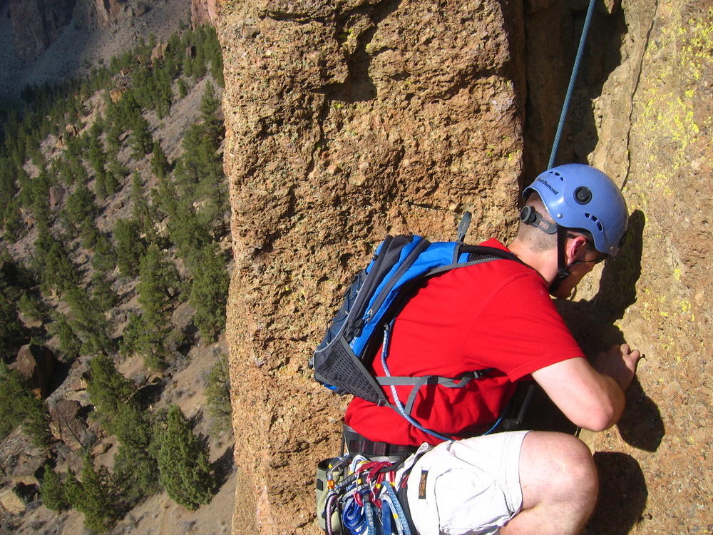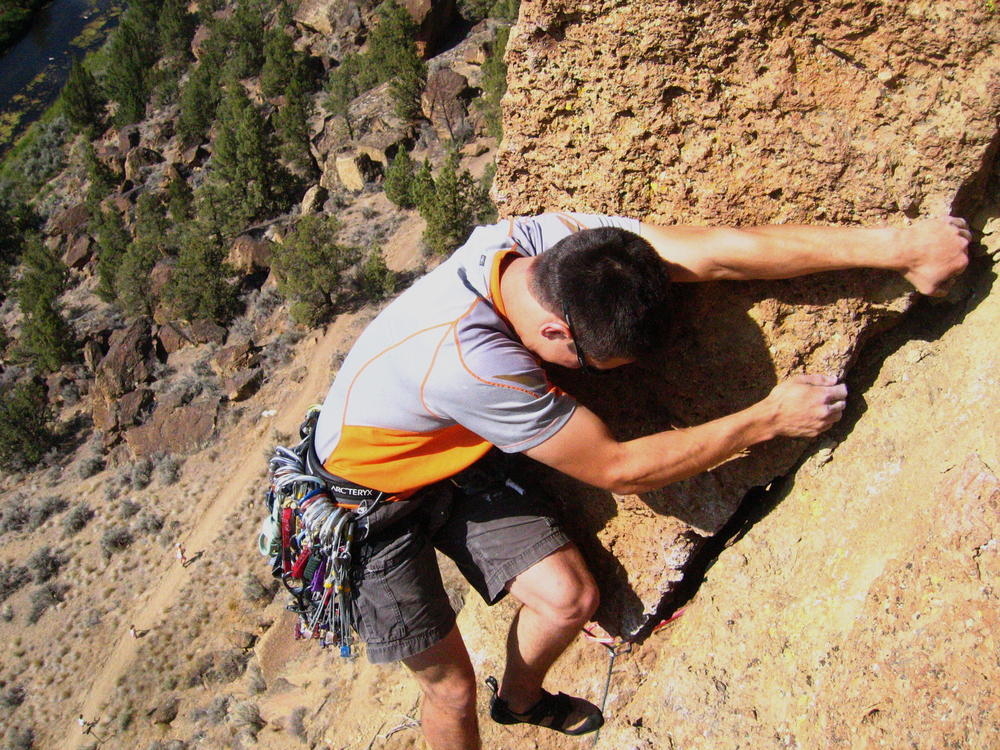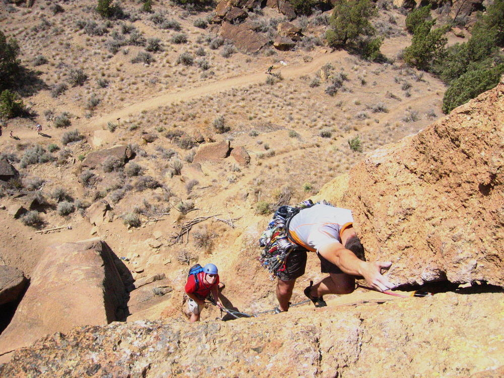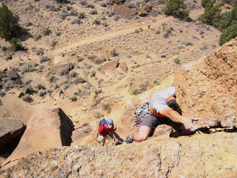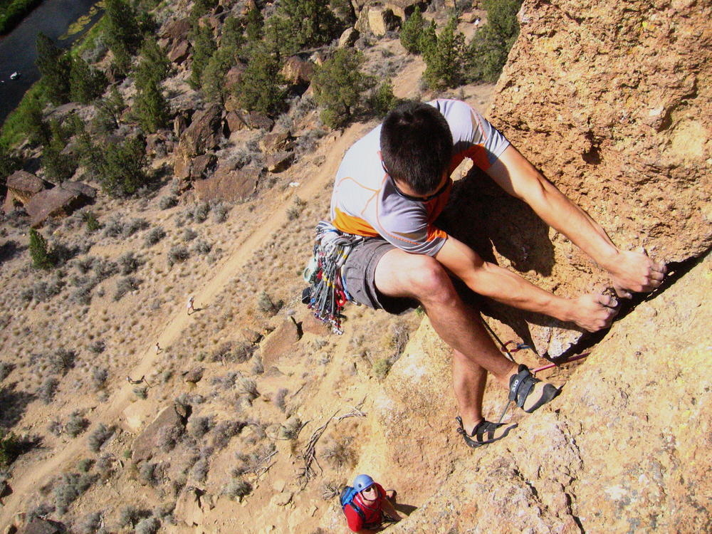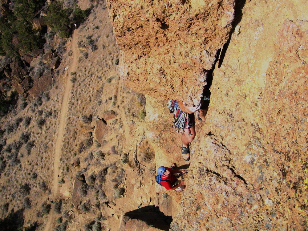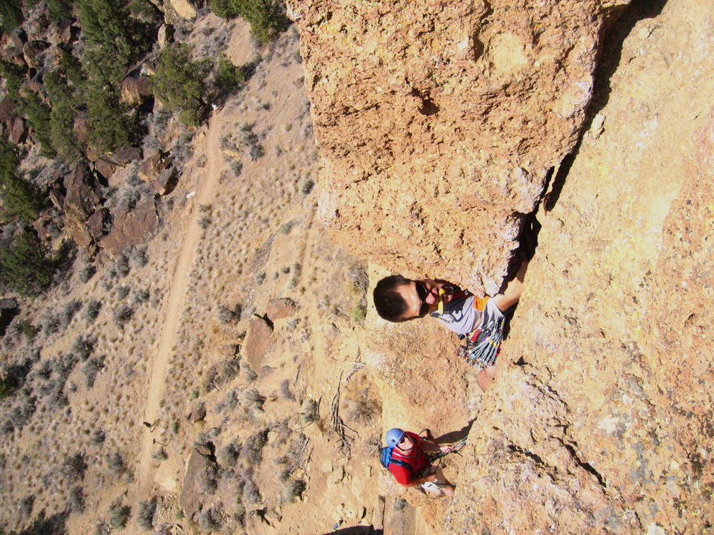 Last weekend we went over to Smith Rock and climbed on Spiderman. I freaked out at the crux, again, when my feet blew and I was hanging by my hands above my gear. So that sucked. After Ingrid and I got to the top, I rapped down to take pictures of Matt and Jeremy pulling the roof. That was badass and made up for the cruxy screaming and swearing.