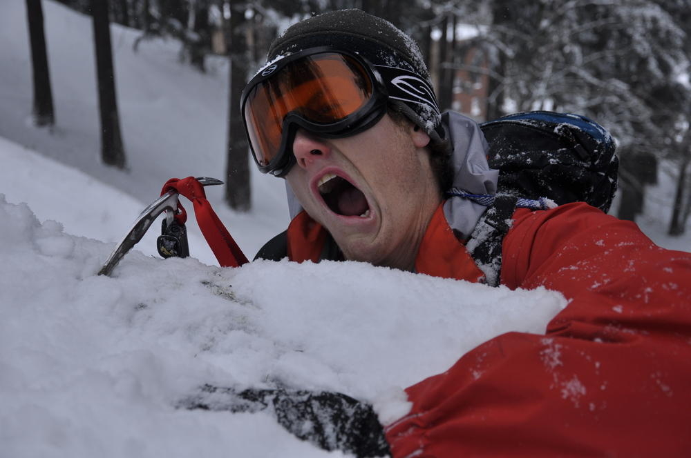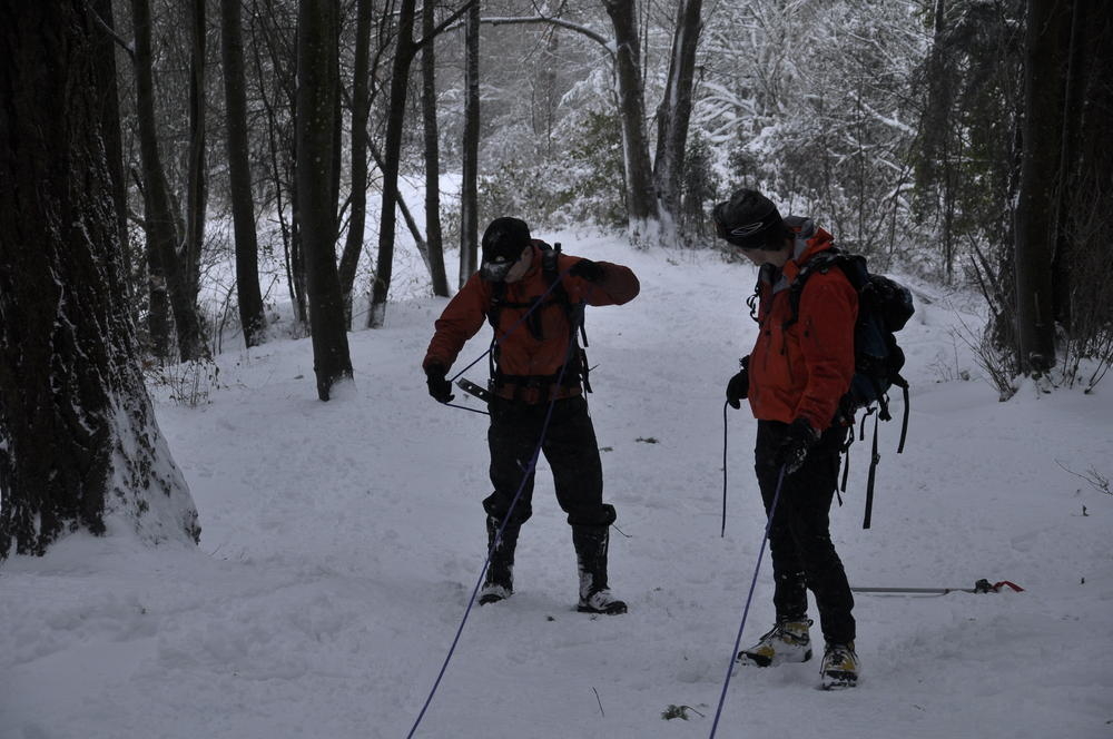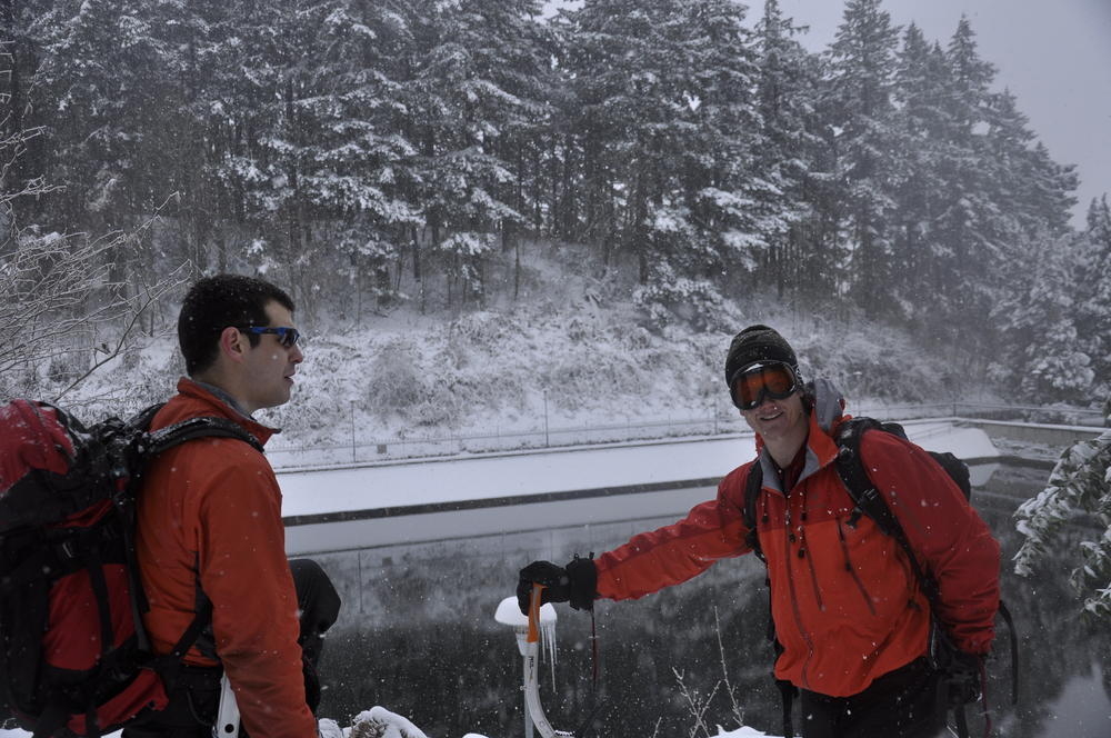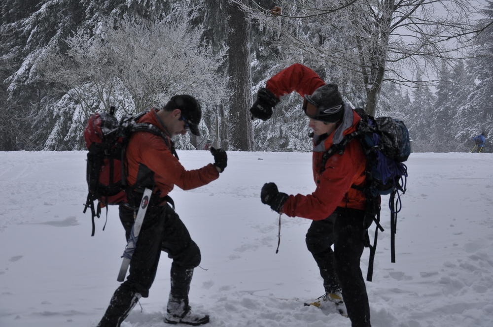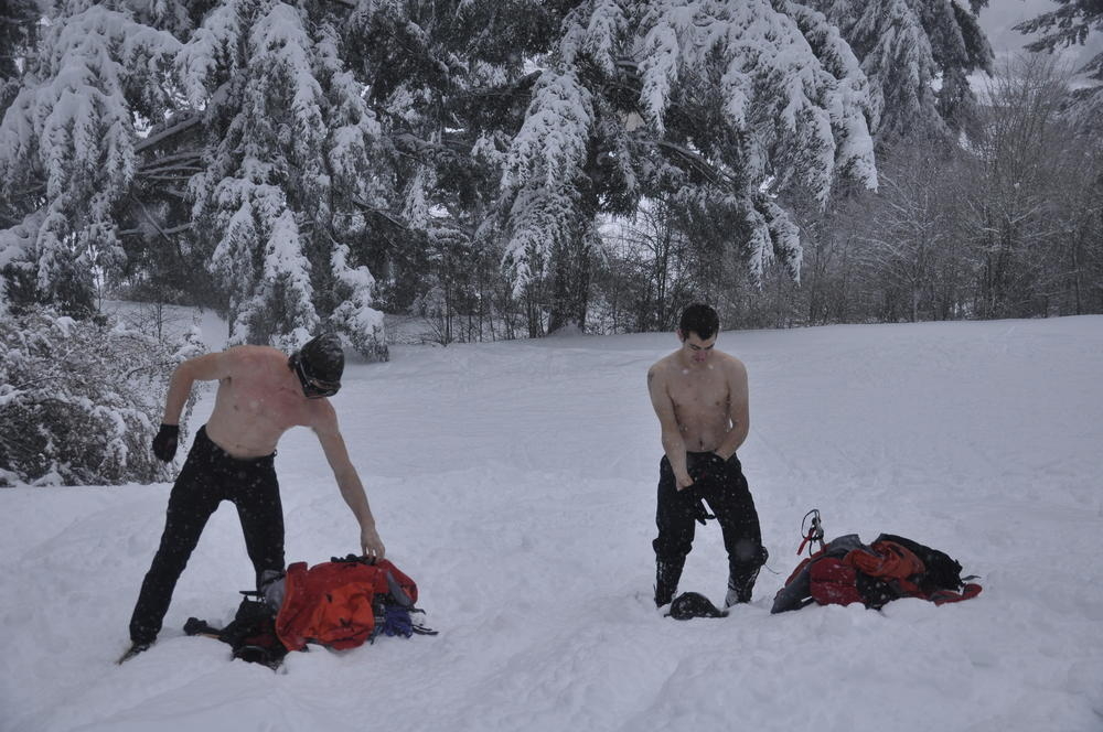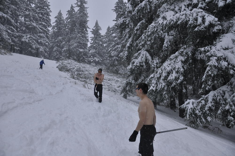 Mt. Tabor finally got enough snow for Matt, Keevin and I to make a West face summit attempt. It took us all day and we barely eeked up some of the upper sections, but we finally summited after a gallant race up shirtless by Keevin and Matt. We got to practice techniques learned by the Mazamas and invent our own as well.