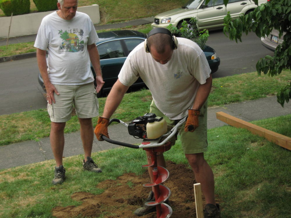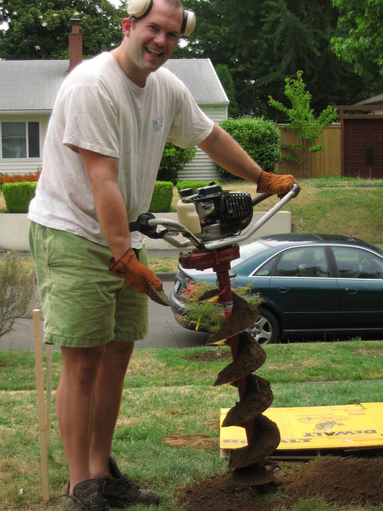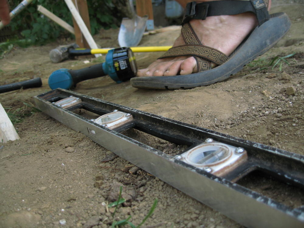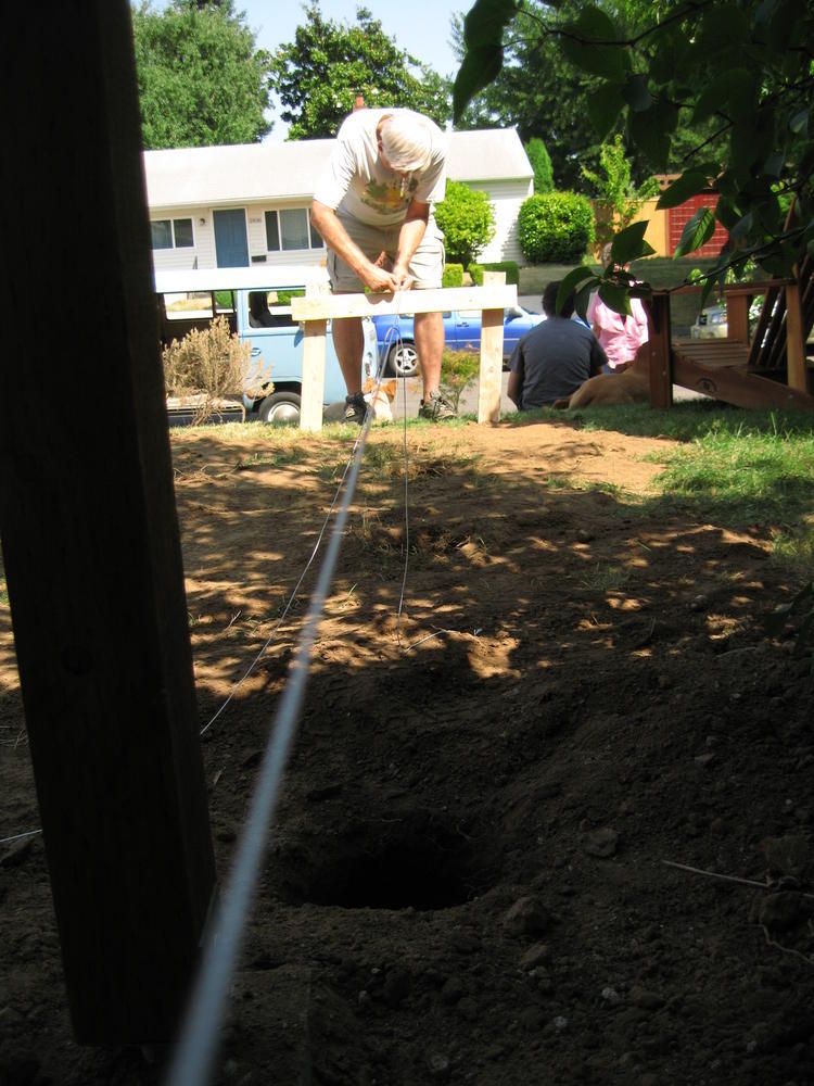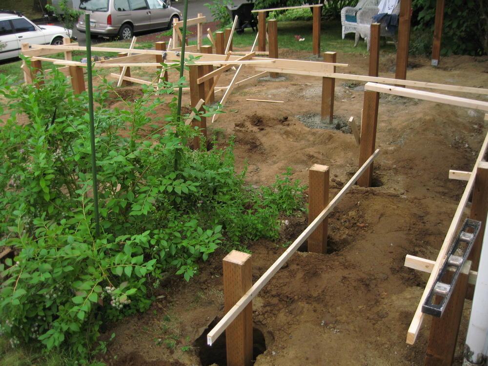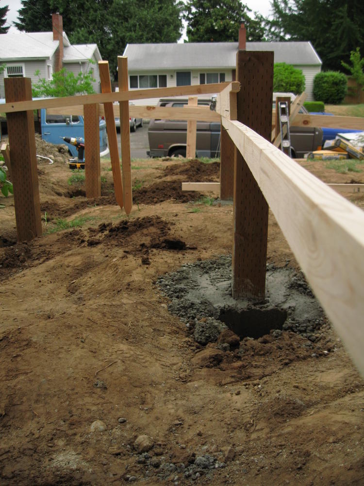 The deck work has continued. Last weekend we got all of the old porch out and this weekend we staked out the new posts and put them in. 40 bags of concrete later we are now ready for the joists.