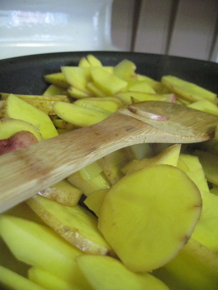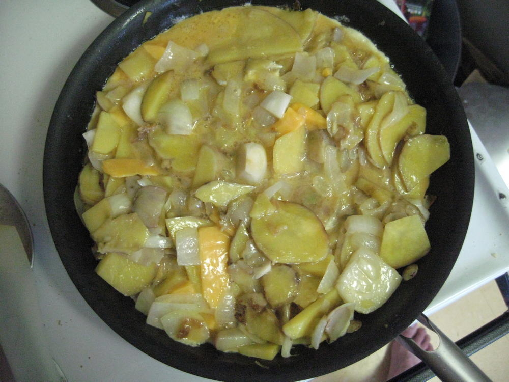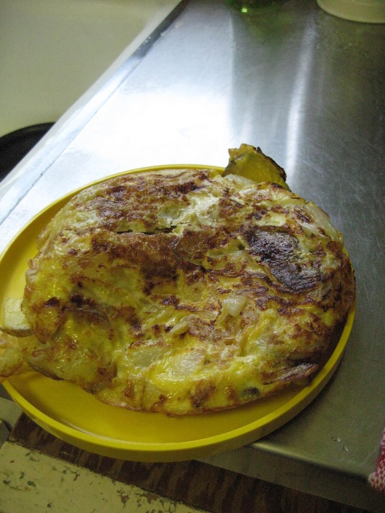 I saw we had actual potatos in the yard after throwing a few spuds in the ground instead of the compost. I tried out making Spanish Tortilla with them. The potatos resisted being dug up, but in the end the oil, the knife and I won out and a Tortilla was made.
