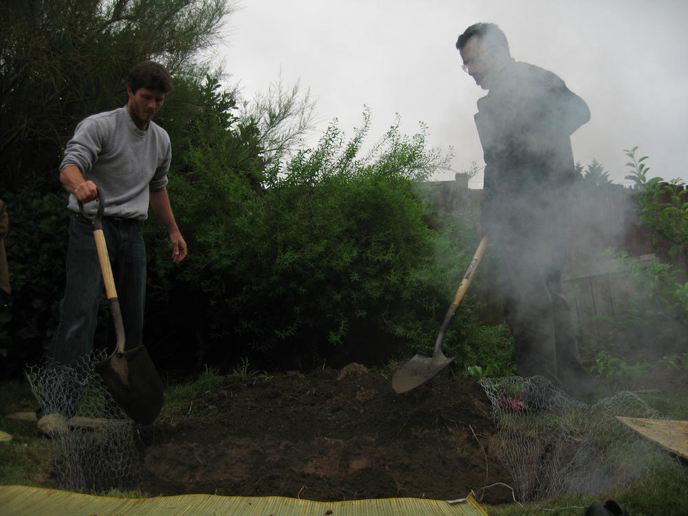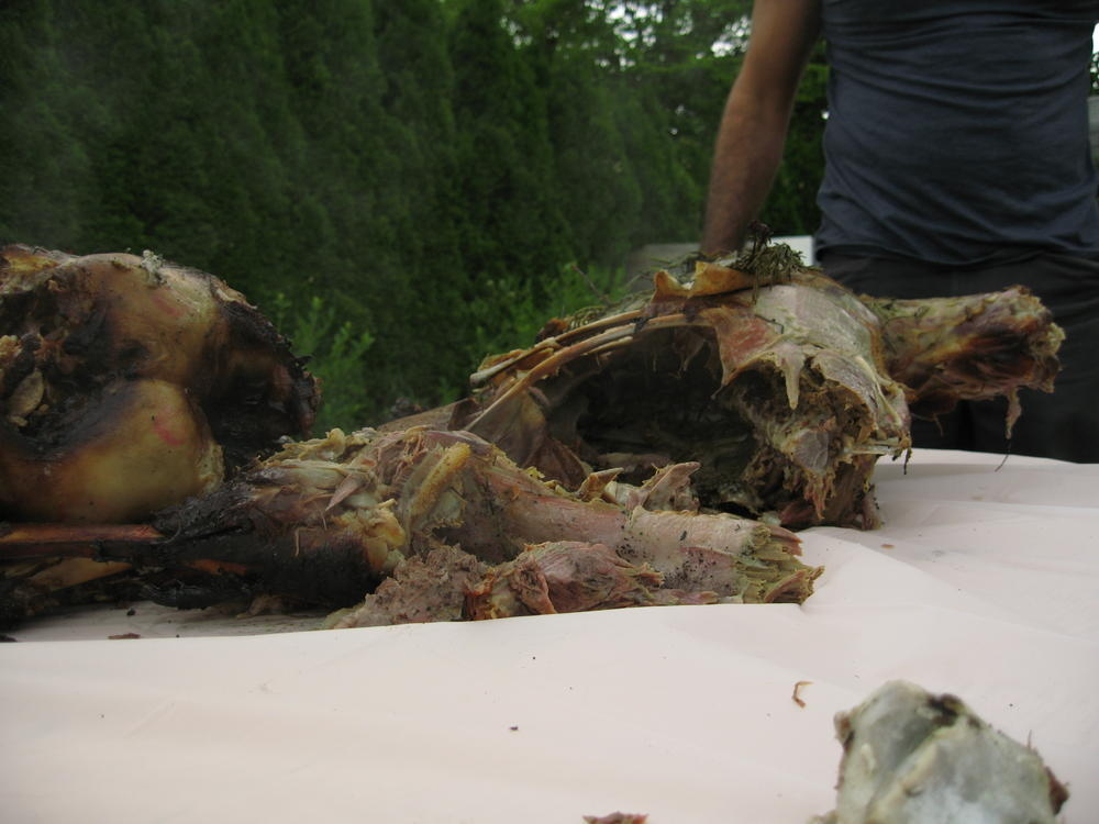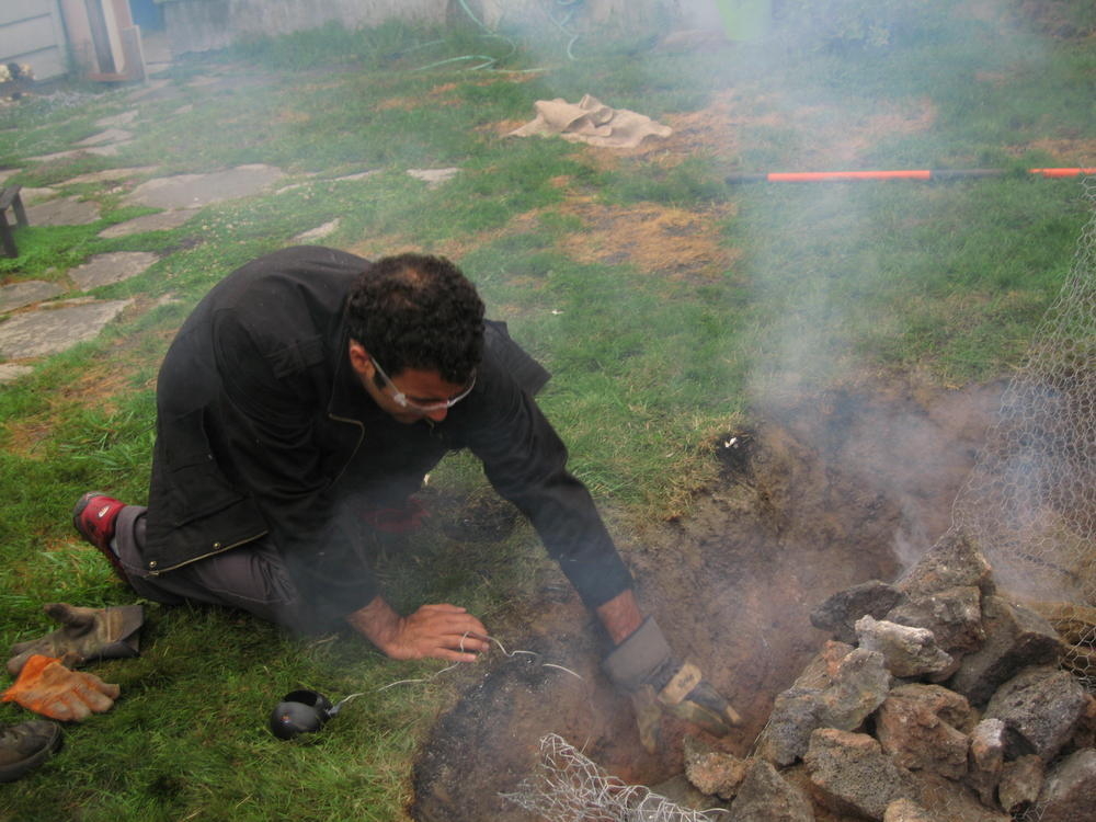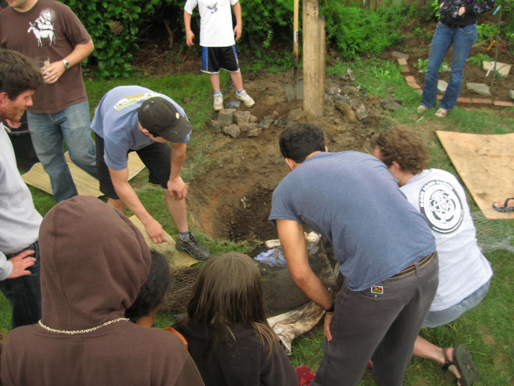 We had a lamb roast to celebrate Dan & Kate coming back home and to mourn Keevin & Sylvia going to the midwest for medical school. And to drink beer and eat lamb. My buddy John from Brown came up from SF and helped try and melt rock for roasting. I decided we could sleep in until 3am and then start the fire so the meat would be ready by 5. We had the beast in the ground at 9:30, and by 11 it was done. Next time we’ll have to get a later start or a larger beast.