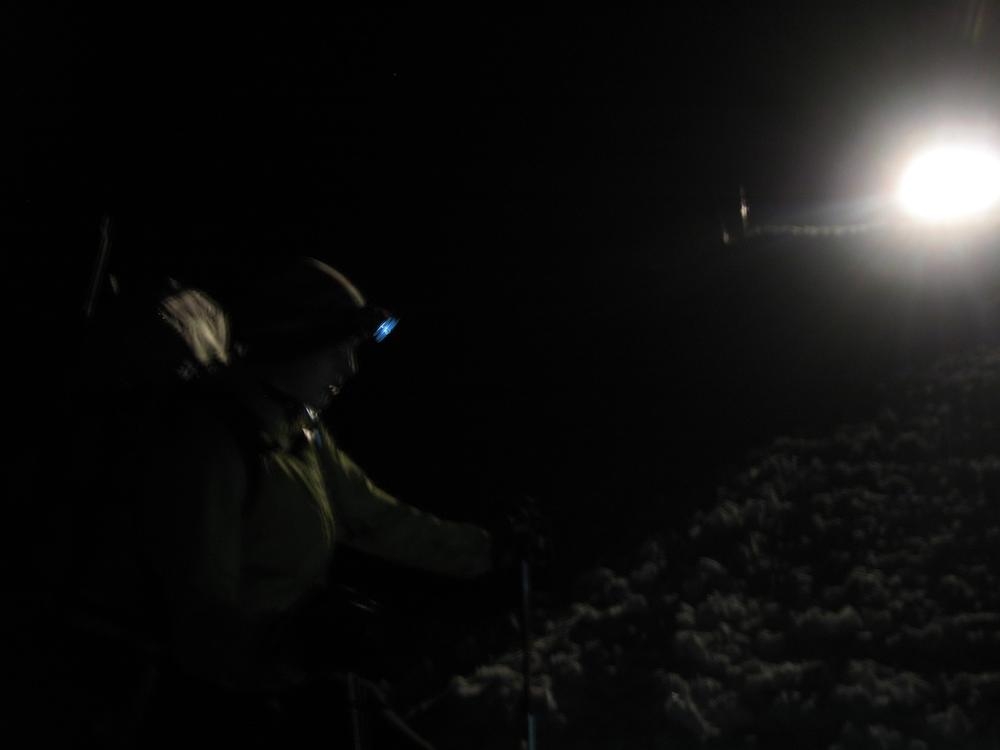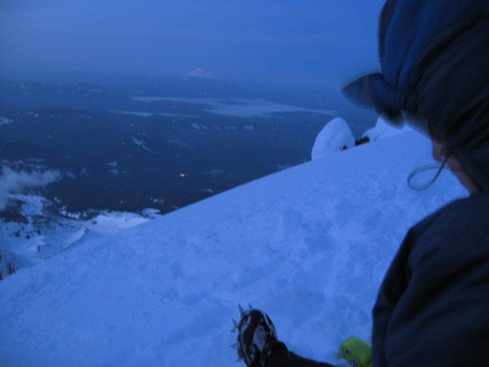 I took Ingrid up the south side of Mt. Hood on Sunday morning via the Old Chute route. I had ambitions of taking us up West Crater Rim, but my paranoia and lazyness took us to the right to the Hogsback. We made good time all the way to the Hogsback, though it’s disheartening to see the Cat ferry people up the ski slopes in 15 minutes what took us 2 hours. The weather was nice, clear and chilly with not too much wind. We could see tons of stars and even a shooting star halfway up. I made a wish but no hot tub and pizza appeared in front of us.