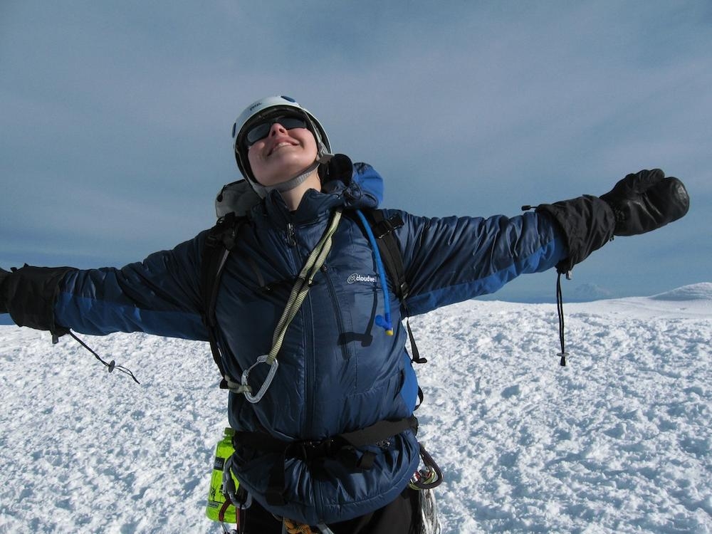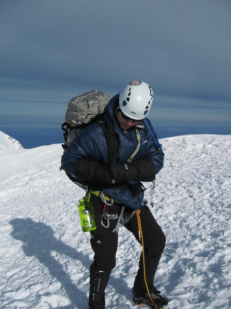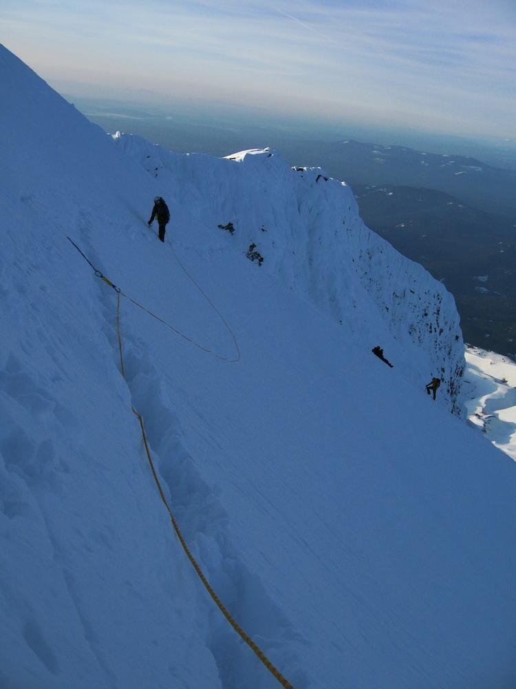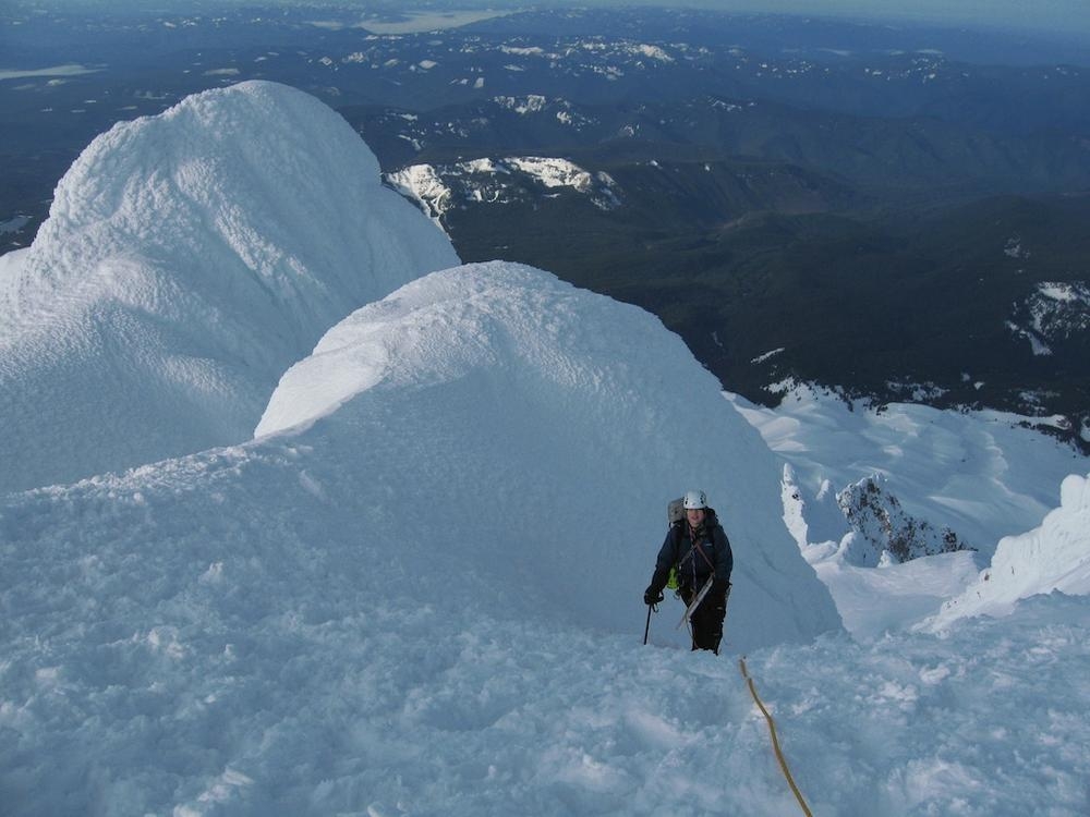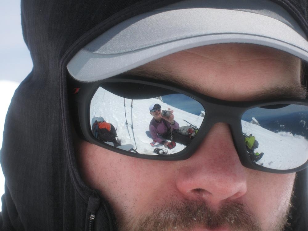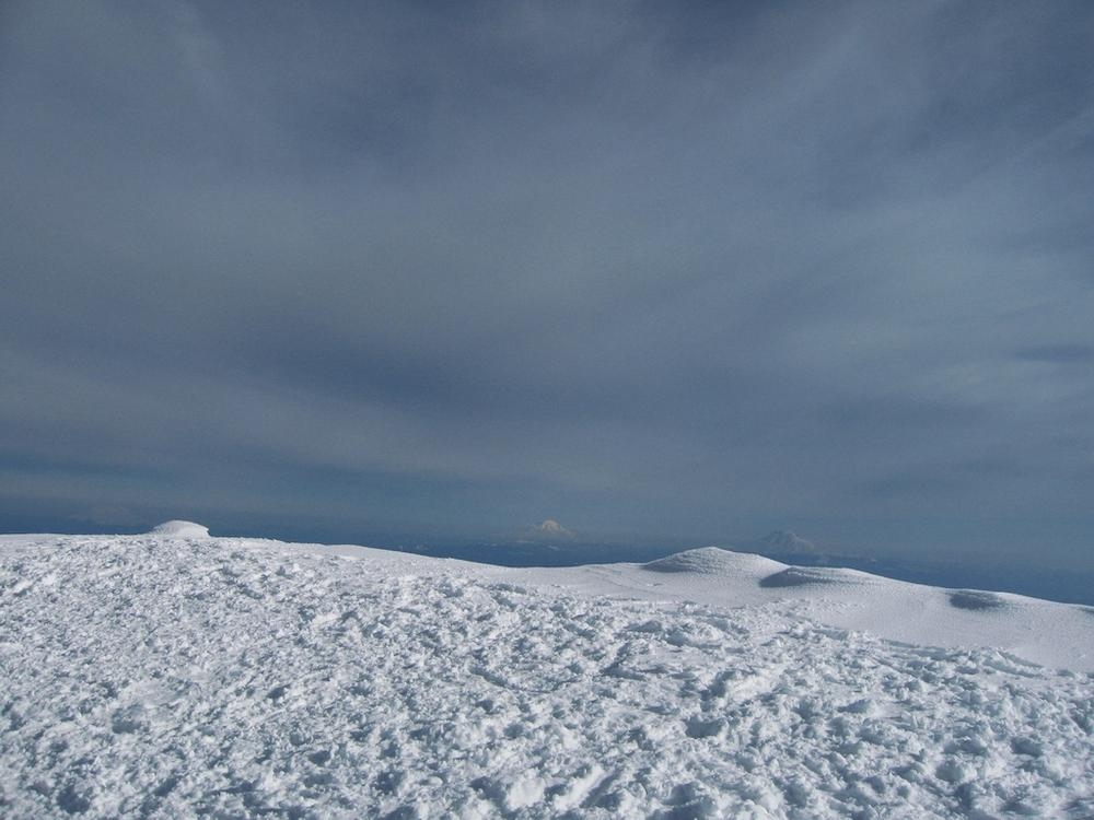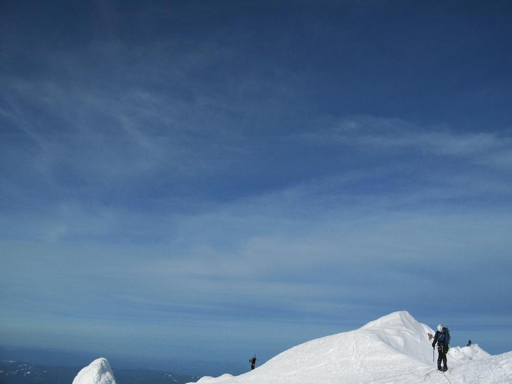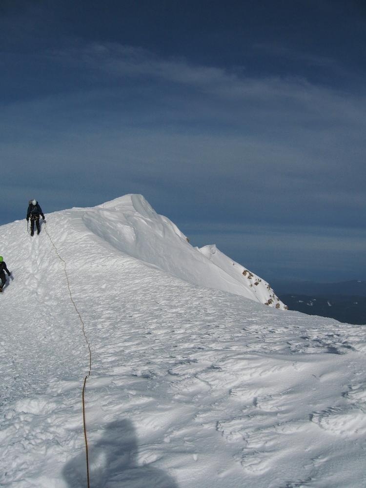 All issues of snow and such were gone once we topped out into the sun on the summit ridge. It was a short walk over to the proper summit where we untangled the rope, drank some hot cocoa and dropped M&Ms into the snow. We were alone for about 10 minutes and it was pretty cool to be the highest people in all of Oregon. Ingrid had to pee and I would guess she had the highest bathroom of anyone that week.