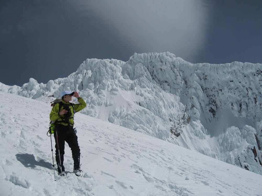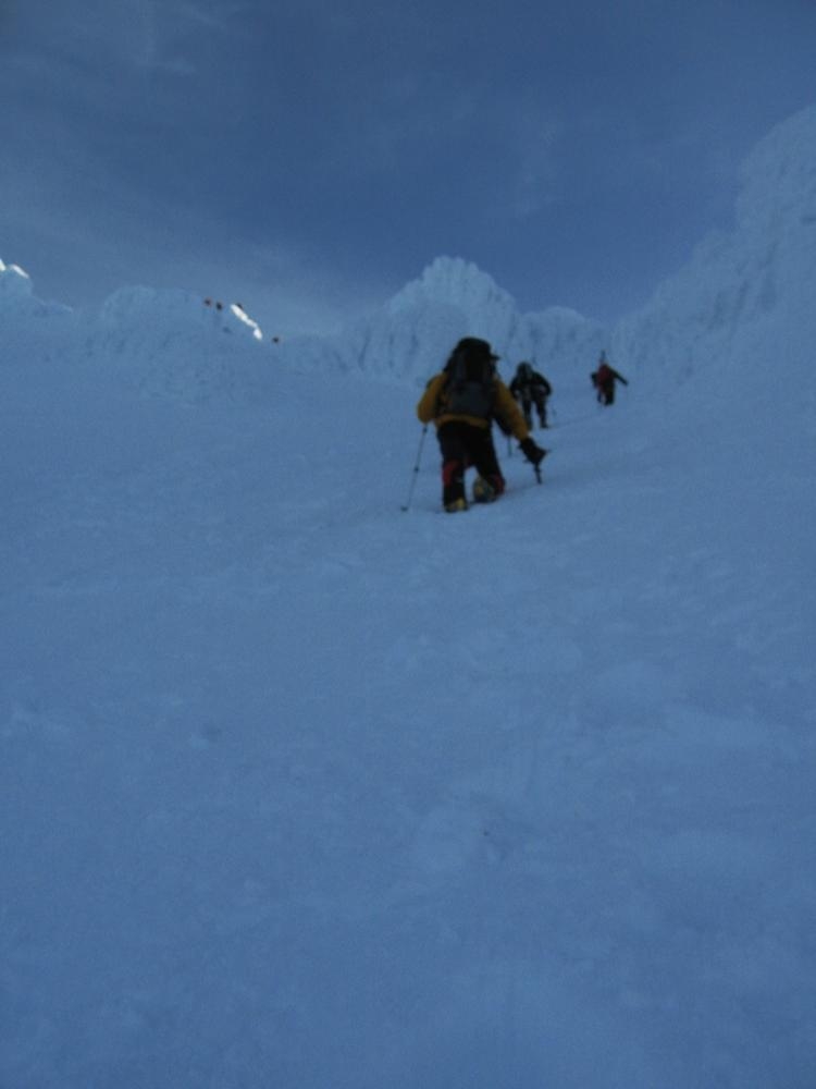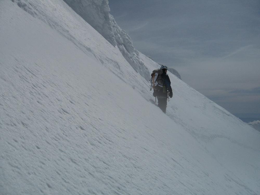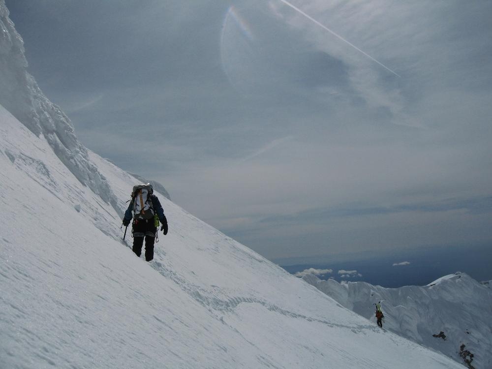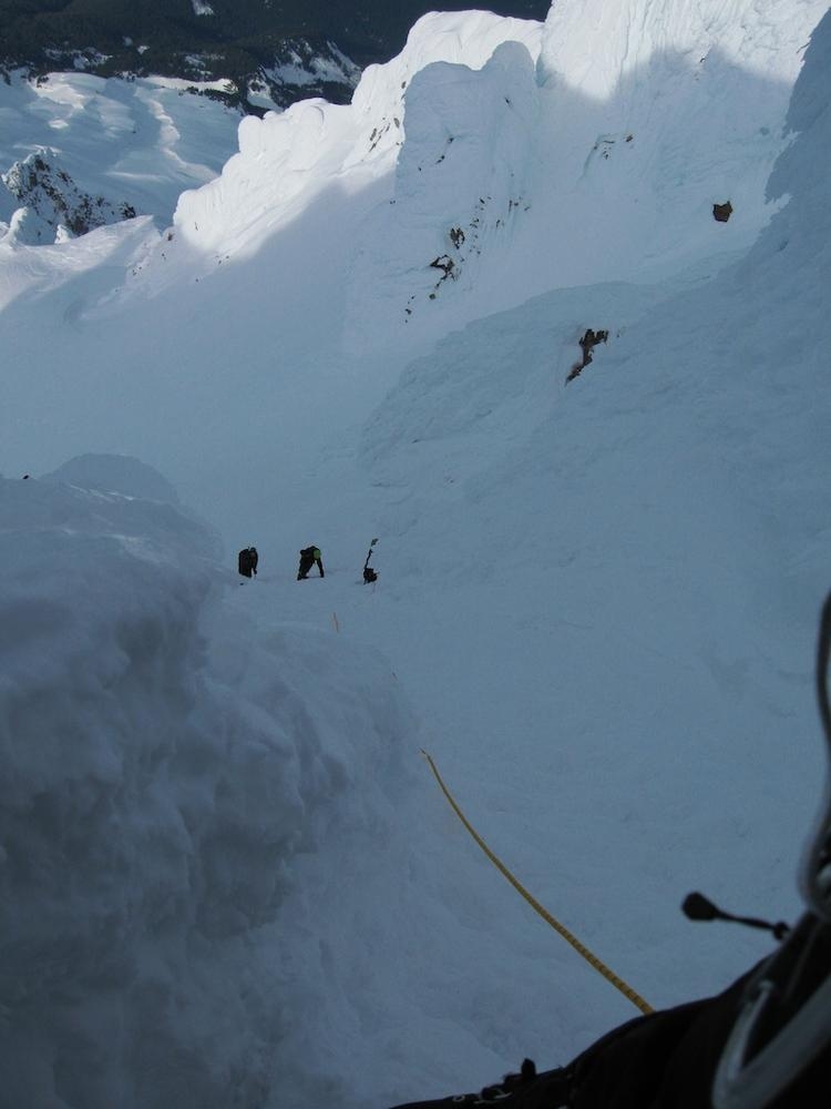 I had the big idea of going down the Pearly Gates by rapelling, which would shorten our way down and get us away from the crowds. We downclimbed to just above the gates and I made a snow bollard to do the rapell. Unfortunately I totally monkey f***ed the rope up and also couldn’t see if the rope made it through the ice section. I didn’t want to end up being one of ’those people’, so I belayed Ingrid back up a ways, tore down my anchor and followed her back up to the summit ridge. So that took about an hour or so of our time.