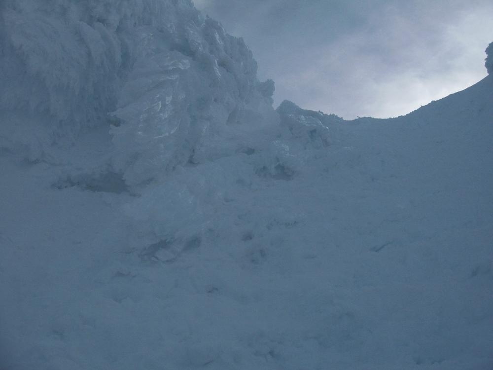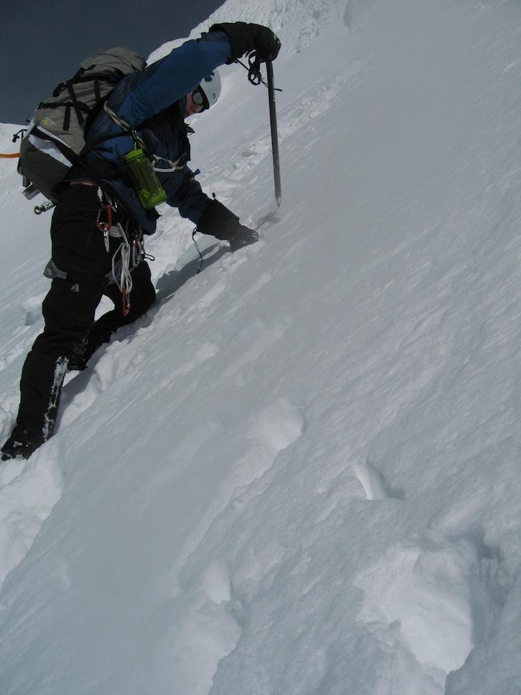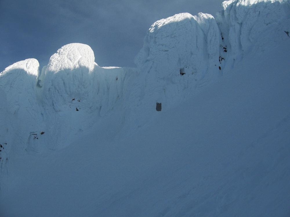 After forcing food down at the Hogsback, we scuttled up the Old Chute. Ingrid was nice enough to humour me by dealing with running belays and rope tangles all in the name of practice. I got in two deadman pickets and they seemed pretty bomber, though I wouldn’t want to fall on them anyway. The snow turned to crap after starting up the slope: some sections had 2 inch crust over soft snow, others were junky snow with bits of ice in them. We got surrounded by a bunch of people in the chute, which was the opposite of what we wanted, but I wasn’t moving fast to do anything other than drip snot out my nose (turned out our packs way too heavy.)
