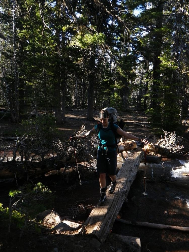 For the 4th of July weekend Ingrid and I went over to the Three Sisters to climb Middle Sister. We went in through the Pole Creek trailhead and headed up through the dust. In a few miles we crossed a beautiful creek on a log and came into the snow. We followed the boot track and pink ribbons up towards the Middle Sister. Skull and crossbones flags would be more bad ass and forboding than pink, but it might scare the hippies.
