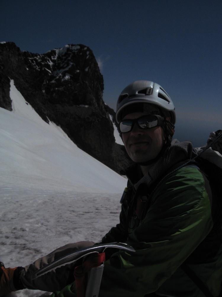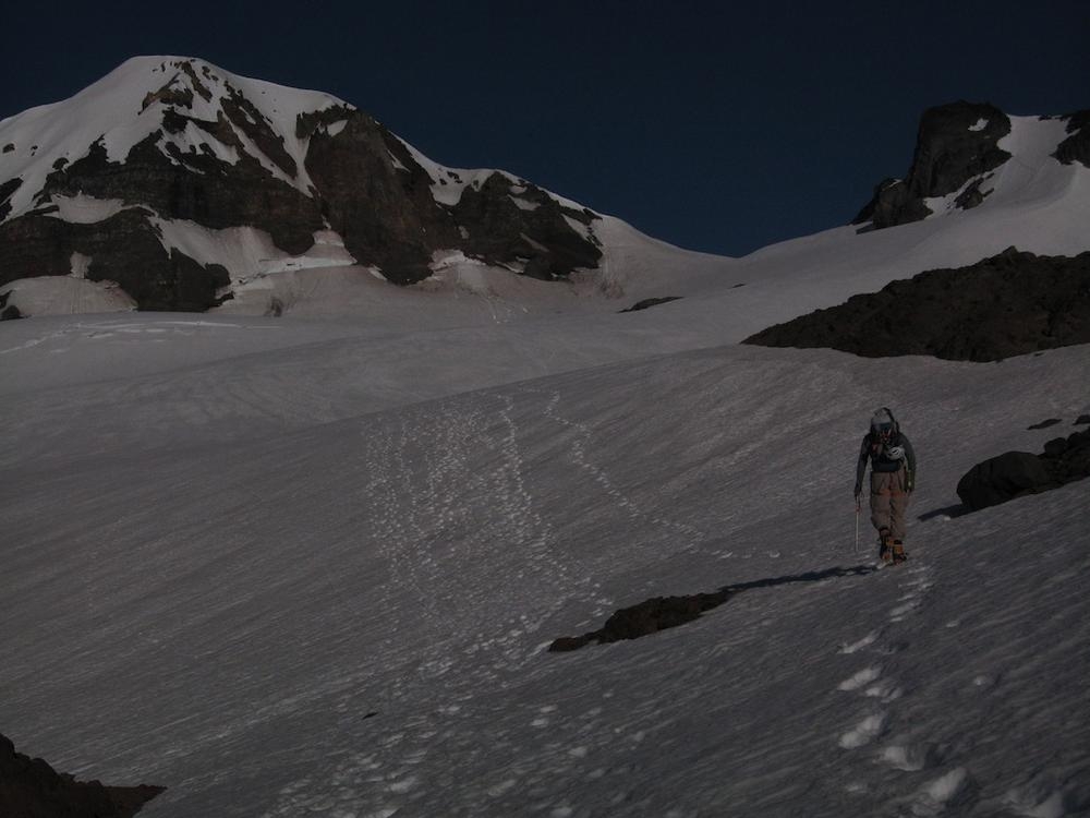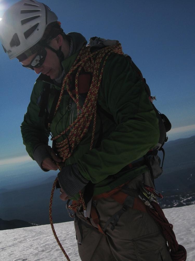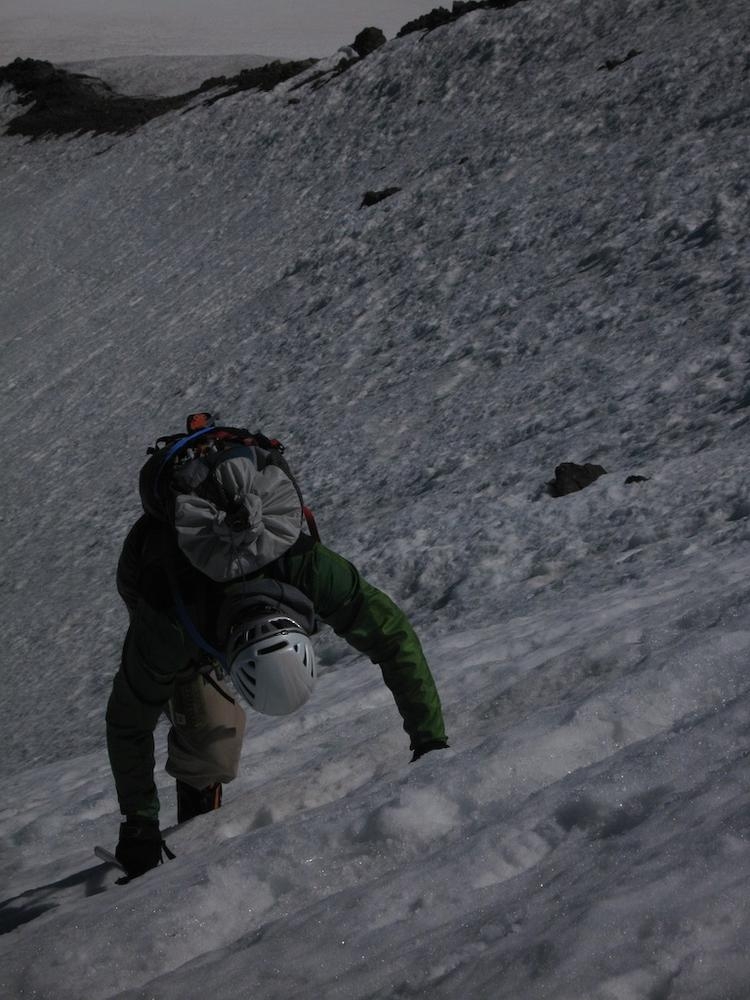 The majority of the climb is glacier trudging with great views. We discussed EPO and blood doping as a way to make it more enjoyable but decided the costs and ethical implications outweighed the benefits. We had our harnesses and I broke out the glacier rope in case we wanted to belay any sections of the steep stuff. That and I think the rope looks cool.