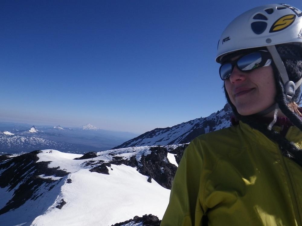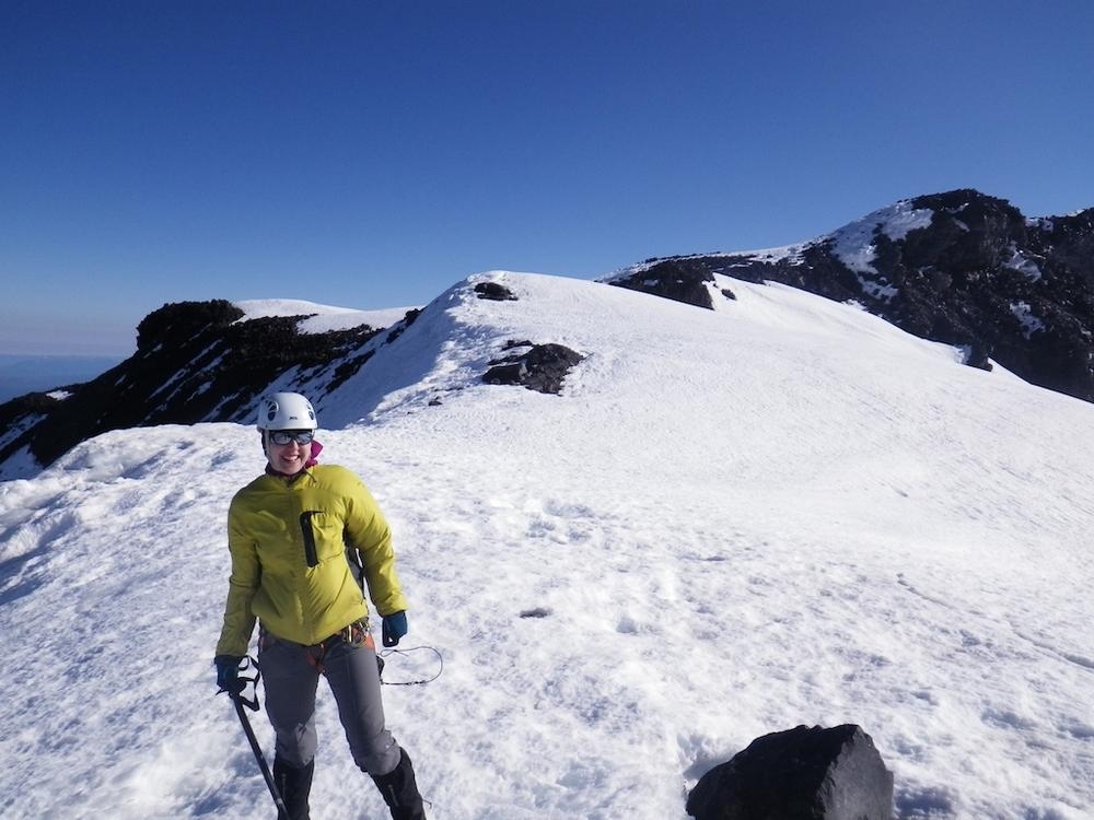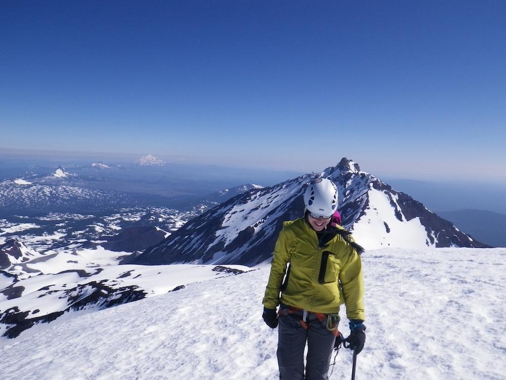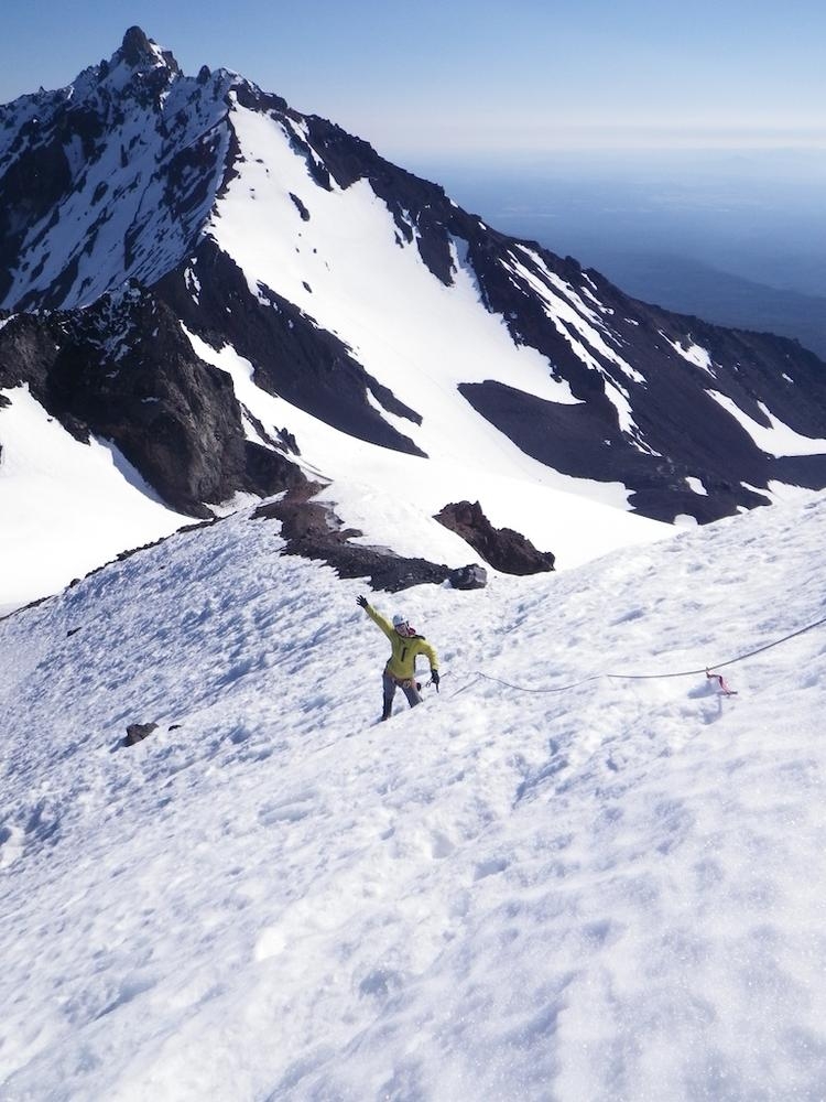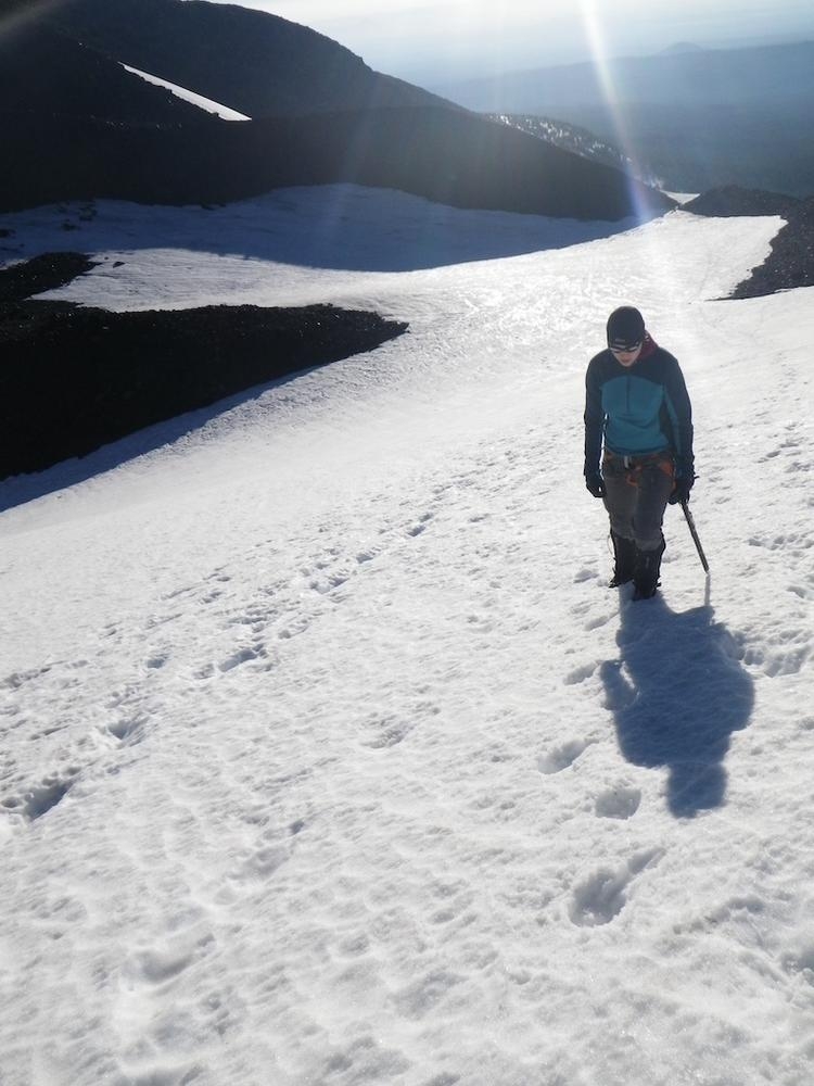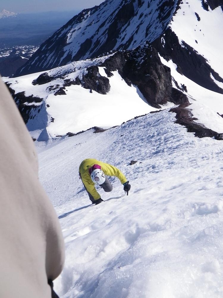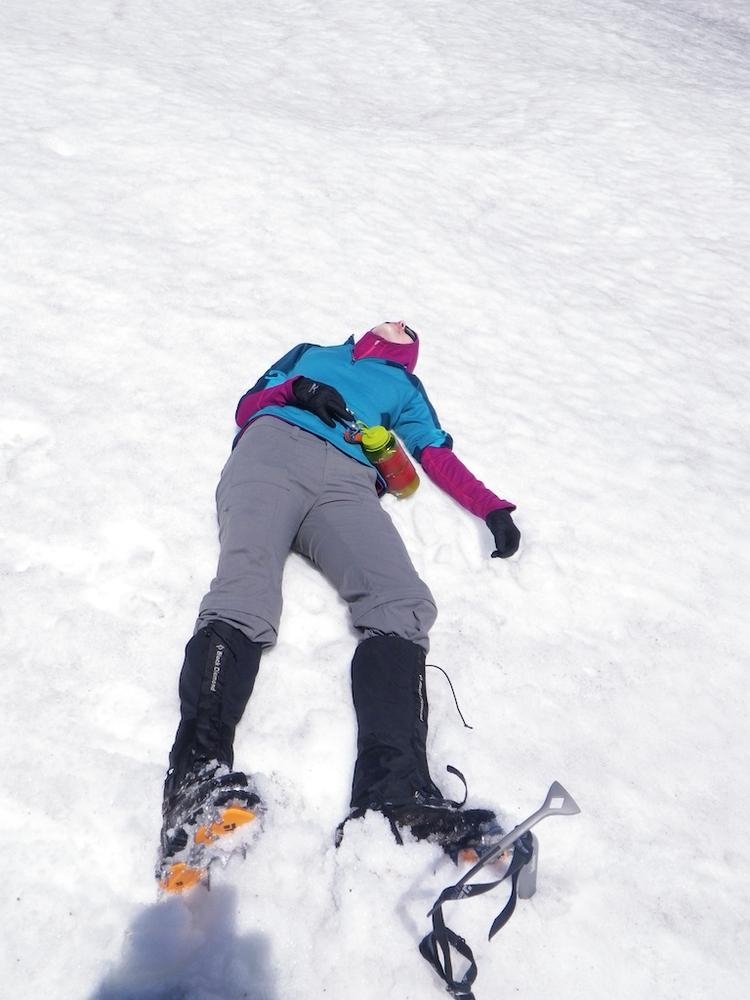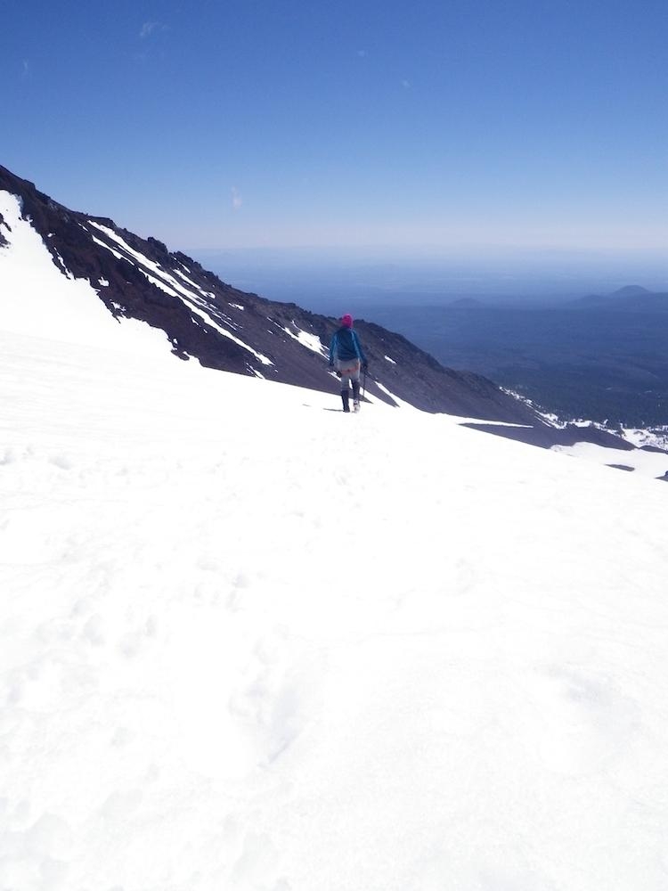 The Mazamas headed down and we were lonely so we followed them. Ingrid showed off her downclimbing skills while I tried not to fall off in front of everyone. We boogied past the fixed rope and made it down to the saddle fairly quickly. We drank water and ate more gu and nasty food while shedding layers and putting away gear. Now the sun was for sure fully out and we tried to stay fully covered to not too burnt.