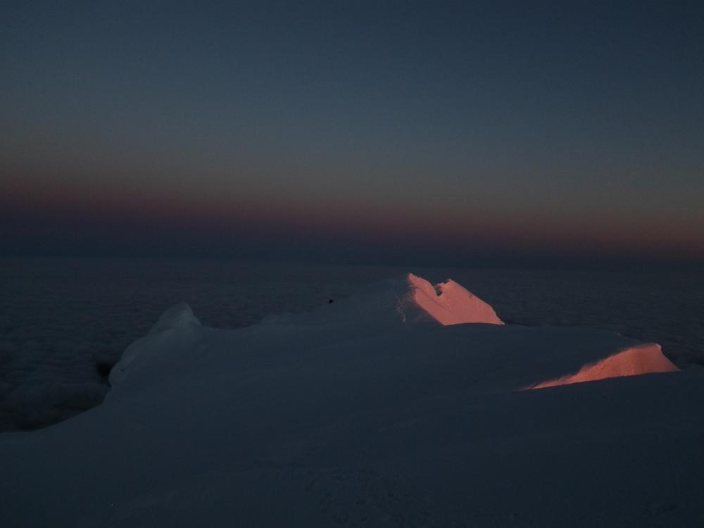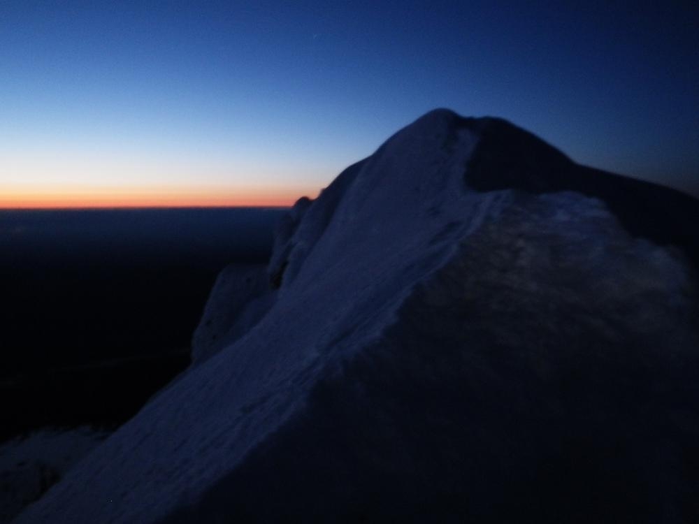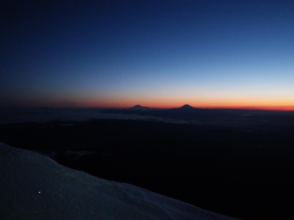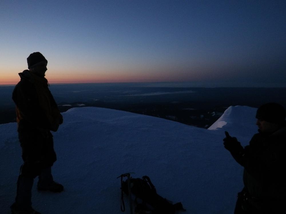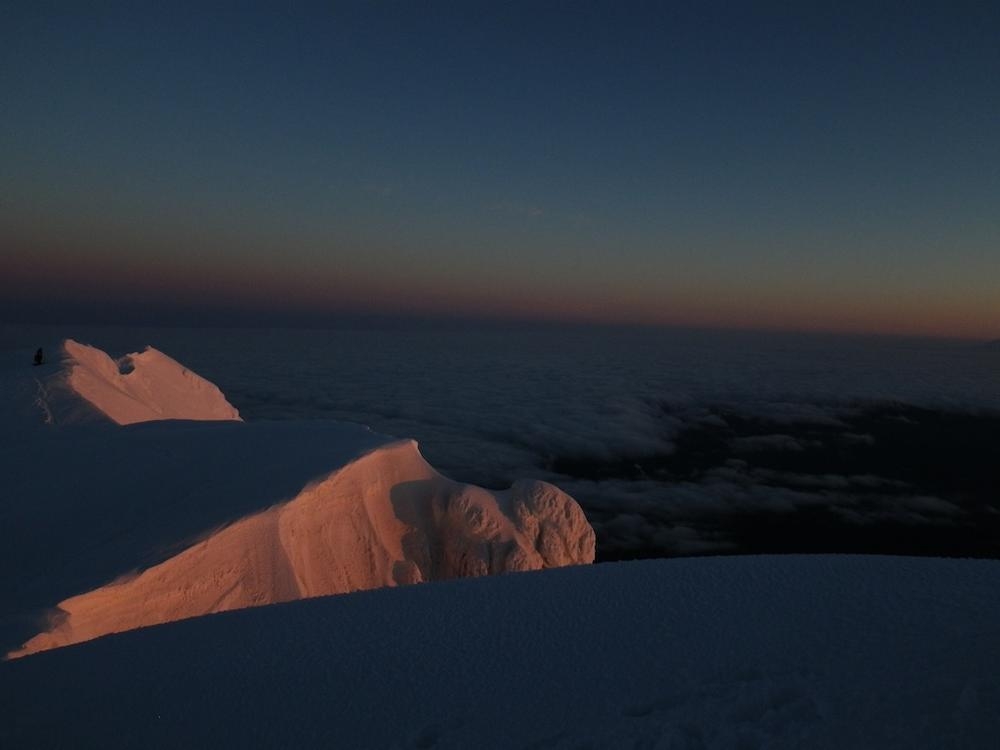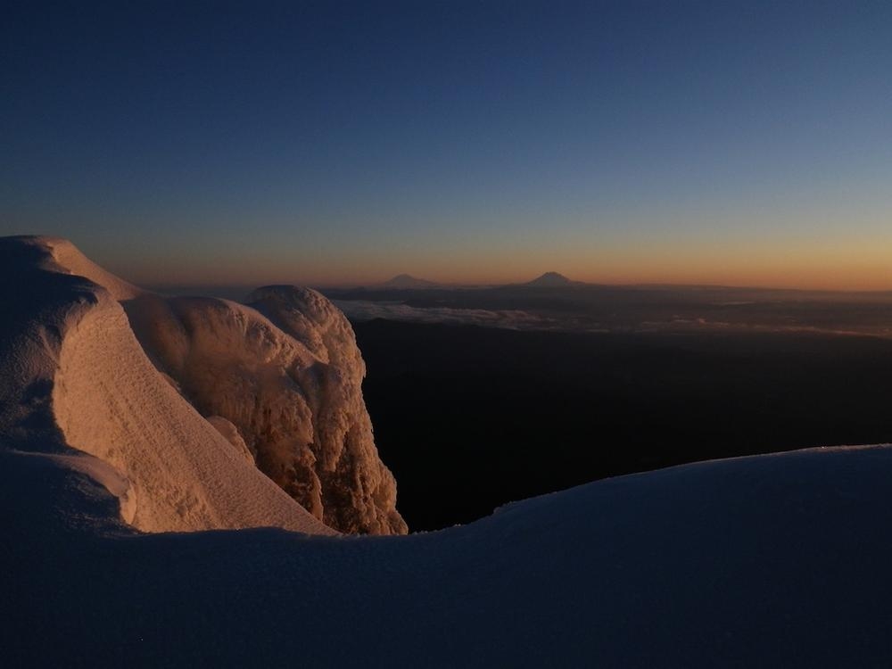 It was still dark when we roped up on the Hogsback and had to use our high beams to see the route. We somehow were the first up there, which never happens. I went up the Hogsback walk for a bit and then hooked left to go straight up the old chute. Trey followed the tiny indentations I kicked into the firm snow and we made great time up to the rim of the mountain. We were greeted by an awesome view of Mt. Rainier and Mt. Adams standing in front of the coming orange and red light. Once on the ridge proper we hoofed it over to the summit to enjoy our thermos of half & half hot cocoa. The time was 4:50 and we were the first on the summit and had it all to ourselves for a while.