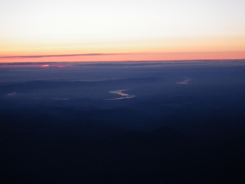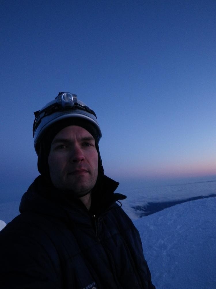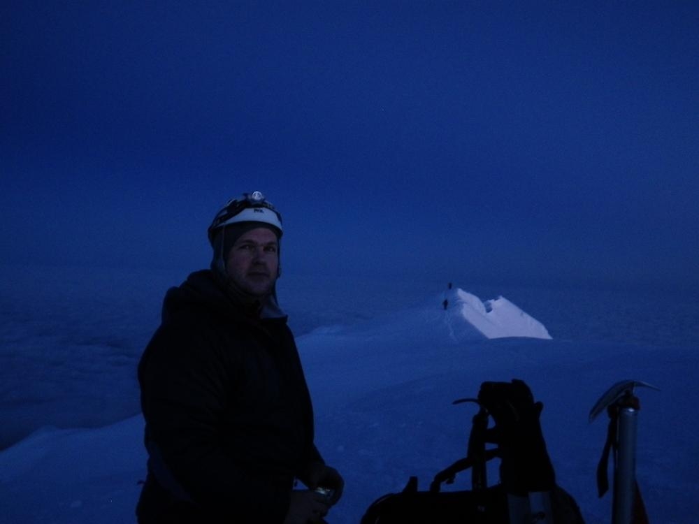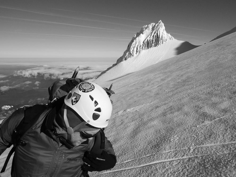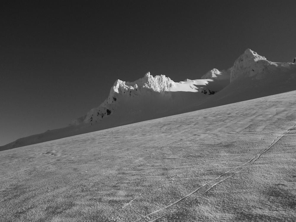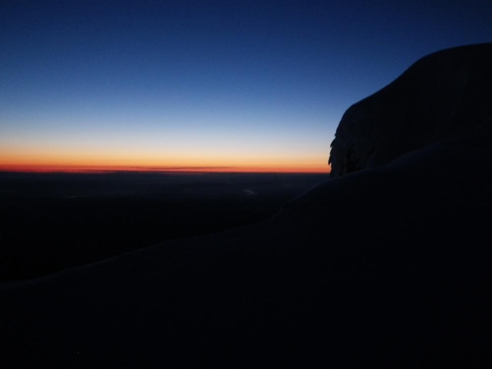 It was still dark when we roped up on the Hogsback and had to use our high beams to see the route. We somehow were the first up there, which never happens. I went up the Hogsback walk for a bit and then hooked left to go straight up the old chute. Trey followed the tiny indentations I kicked into the firm snow and we made great time up to the rim of the mountain. We were greeted by an awesome view of Mt. Rainier and Mt. Adams standing in front of the coming orange and red light. Once on the ridge proper we hoofed it over to the summit to enjoy our thermos of half & half hot cocoa. The time was 4:50 and we were the first on the summit and had it all to ourselves for a while.