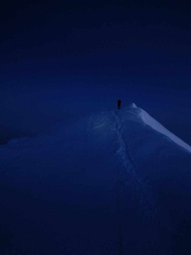 Trey and I went up the Southside (old chute) route on Mt. Hood along with Matt and his friend John. We left the parking lot around 10:20 to help get us to the summit before the sun rose and turned the slopes into slush. I was hoping/planning on us getting to the summit around 4 and off the more avalanche prone slopes by 8. The start of the climb was in the clouds and after an hour or so we cleared them and were treated to the mountain in moonlight and clear skies above. The conditions were about as good as it gets, low wind and firm snow. We made great time all the way up to the Hogsback, making sure to eat and drink along the way (learning from past mistakes). The snow was good right up to the Hogsback (10,300’) where it got really steep and sugary. I think we were a little off route and the slope was steeper than usual because of all the snow this year.