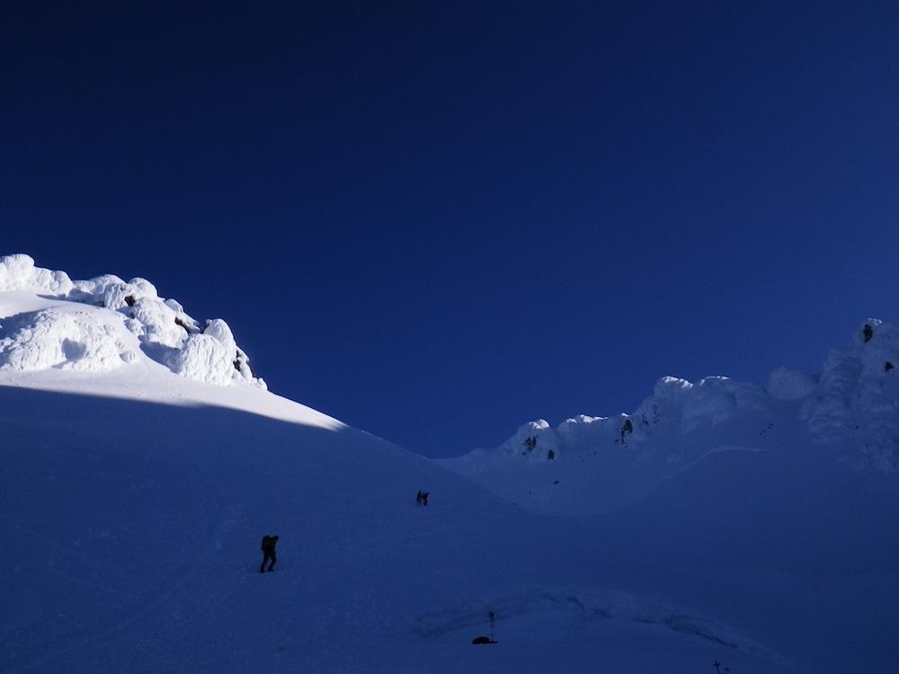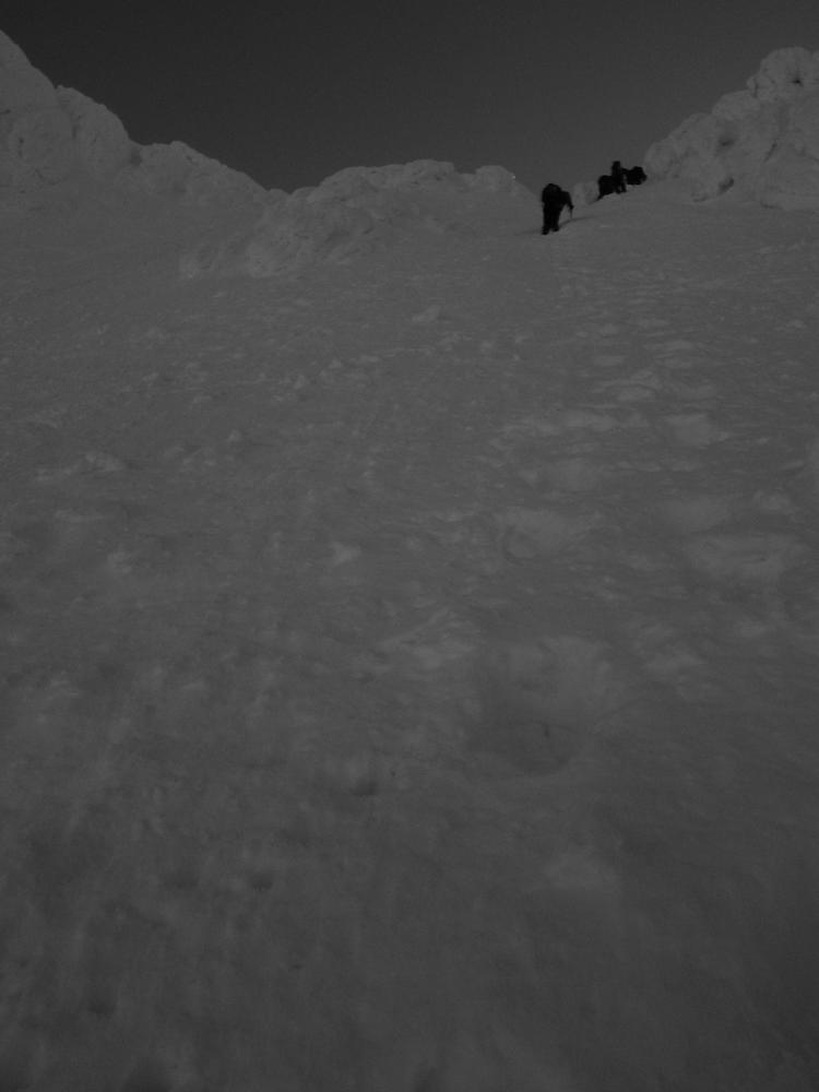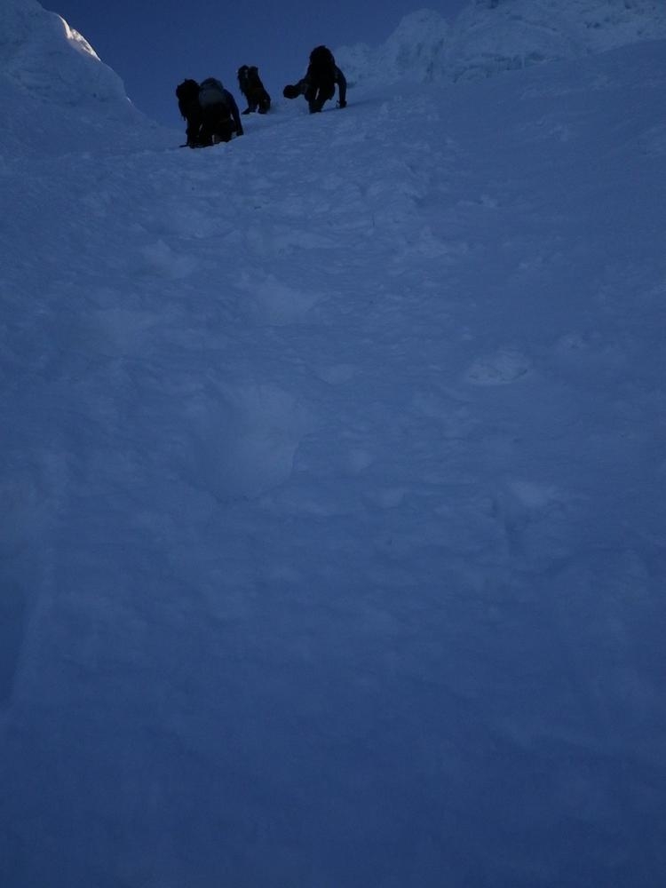 Matt and John soon reached us and we celebrated with the cocoa and taking pictures of the rising sun. There was no wind and the conditions were perfect. It made me think it’d be fun to slog up a tent and stay the night up there. More people started trudging over the ridgeline to the summit proper so we decided it was time to get going down. We reversed our way back over to the chute we had climbed up.