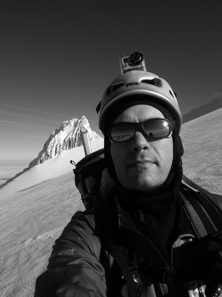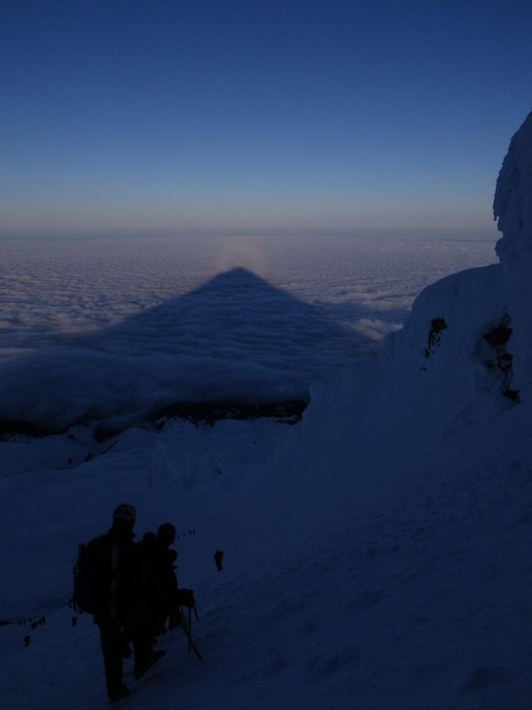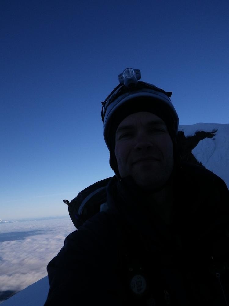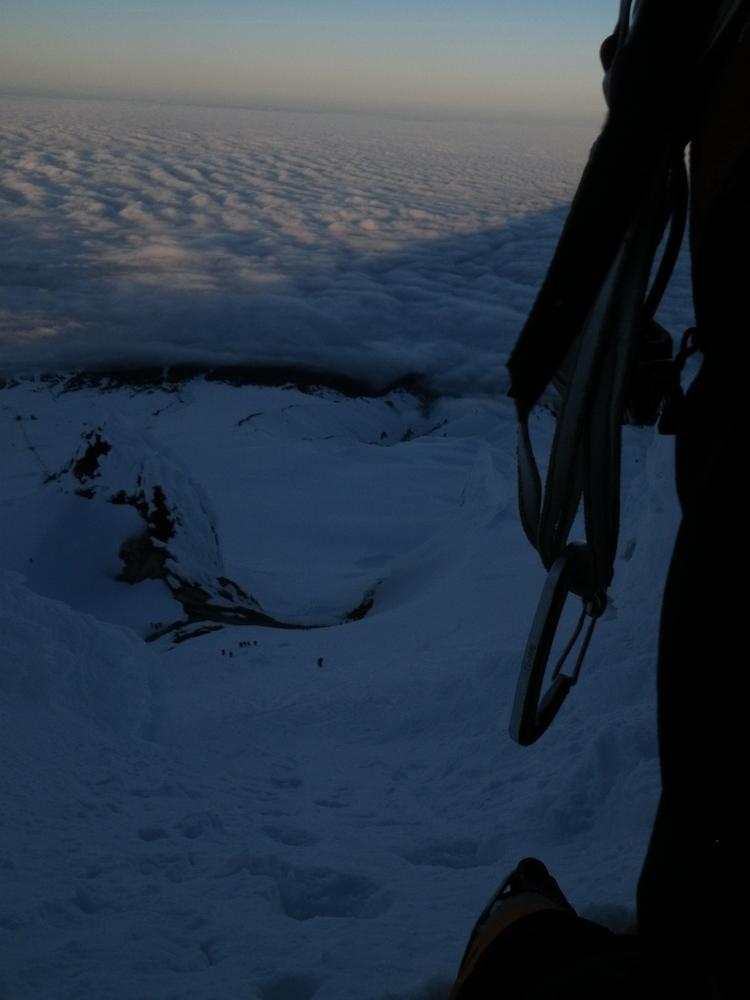 This was probably the best climb I’ve had on Mt. Hood to date. The conditions were perfect and I felt very strong. For me it’s 90% conditions, if the snow is crap then it’s scary, or if it’s solid then you’re able to move quickly and be confident and enjoy it more. A little bit of scary is fun, but pit of stomach dropping out is not so much fun. The view from the summit ridge made all of the training worthwhile. It’s indescribable the feeling of coming out of the darkness on the South side and popping onto the ridge and having the view of Mt. Adams and Rainier with the sunrise behind them.