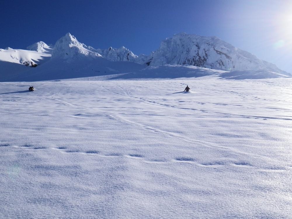 From the ridge we could see the groups of people down at the Hogsback and West Crater Rim route. It made me glad we were on the way down and not up. Trey felt comfortable going ropeless down so we packed up the rope and headed back down the slope. Others had used the steps we kicked and now they were quite large and it was possible to get your entire boot into the steps. Now that it was light out it was possible to see the avalanche debris skirts to the (climbers) left of us on the West Crater route. I pointed them out to Trey to reinforce why we didn’t do that route.