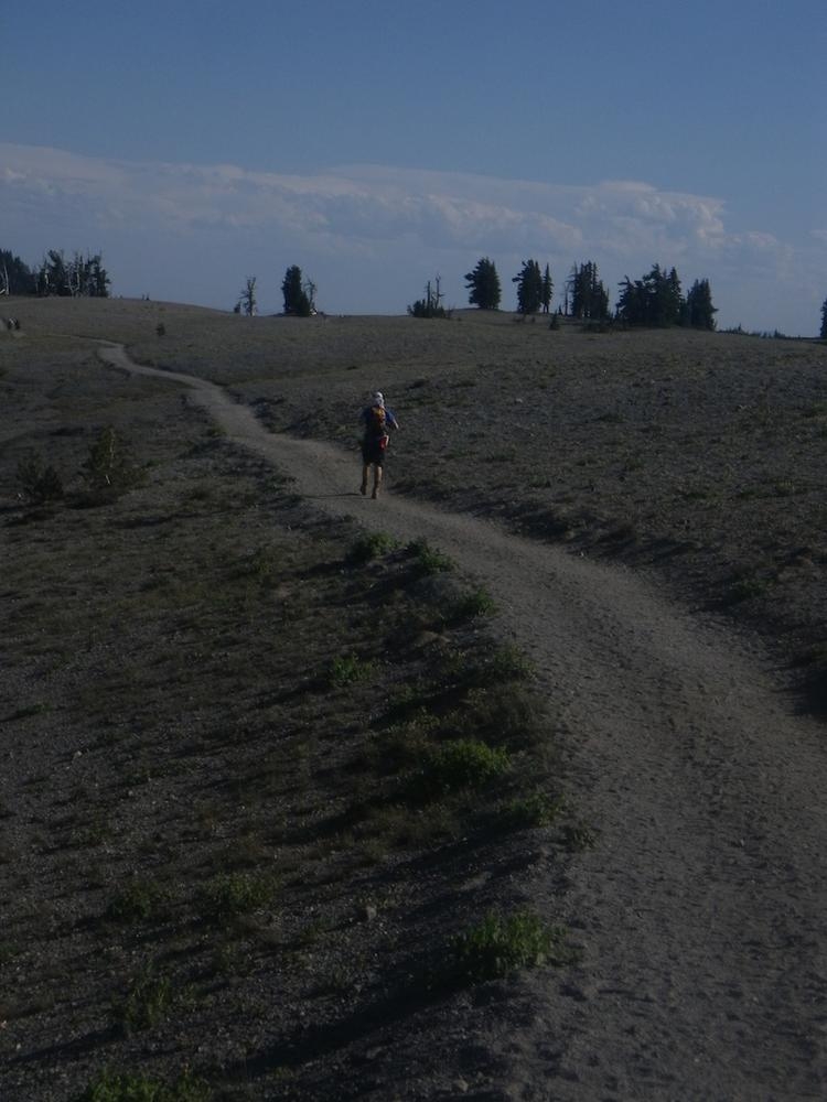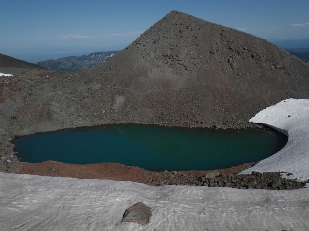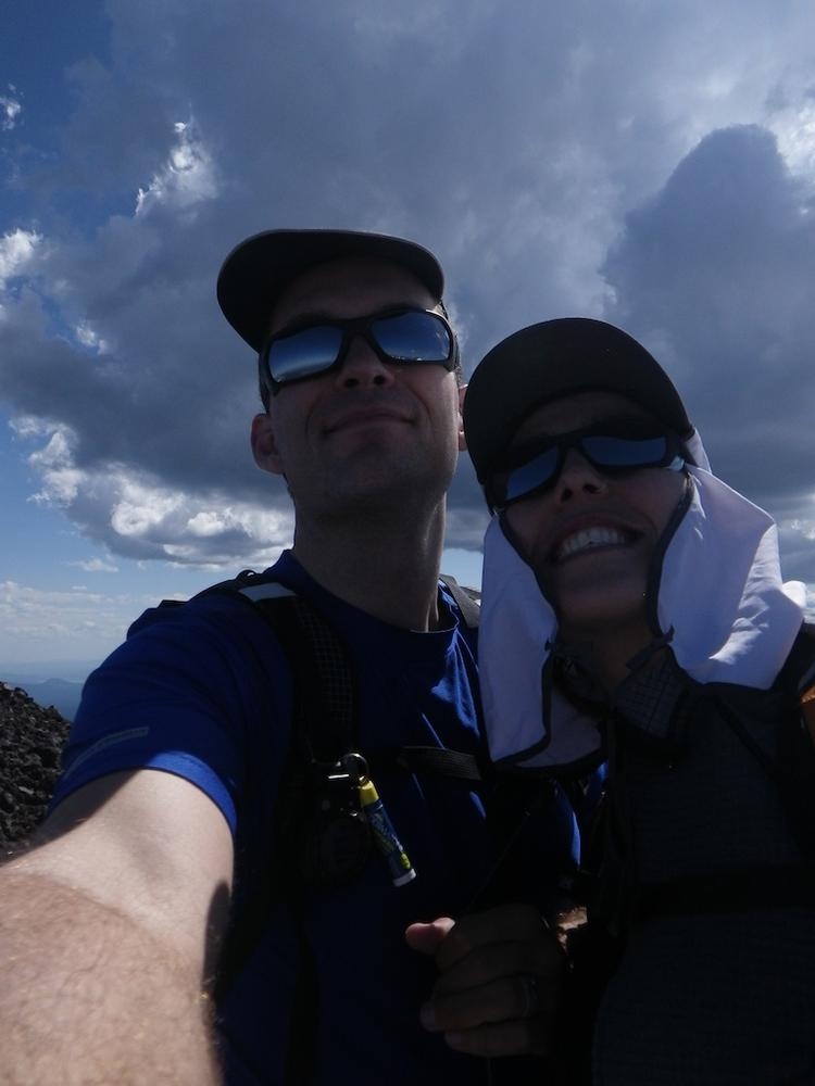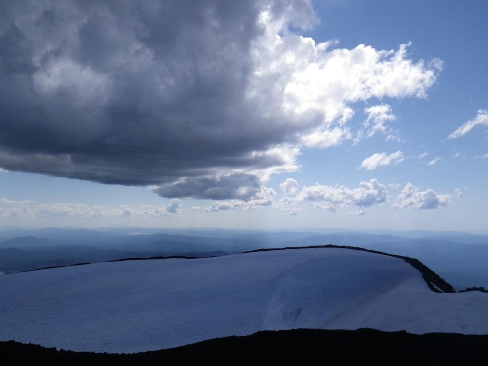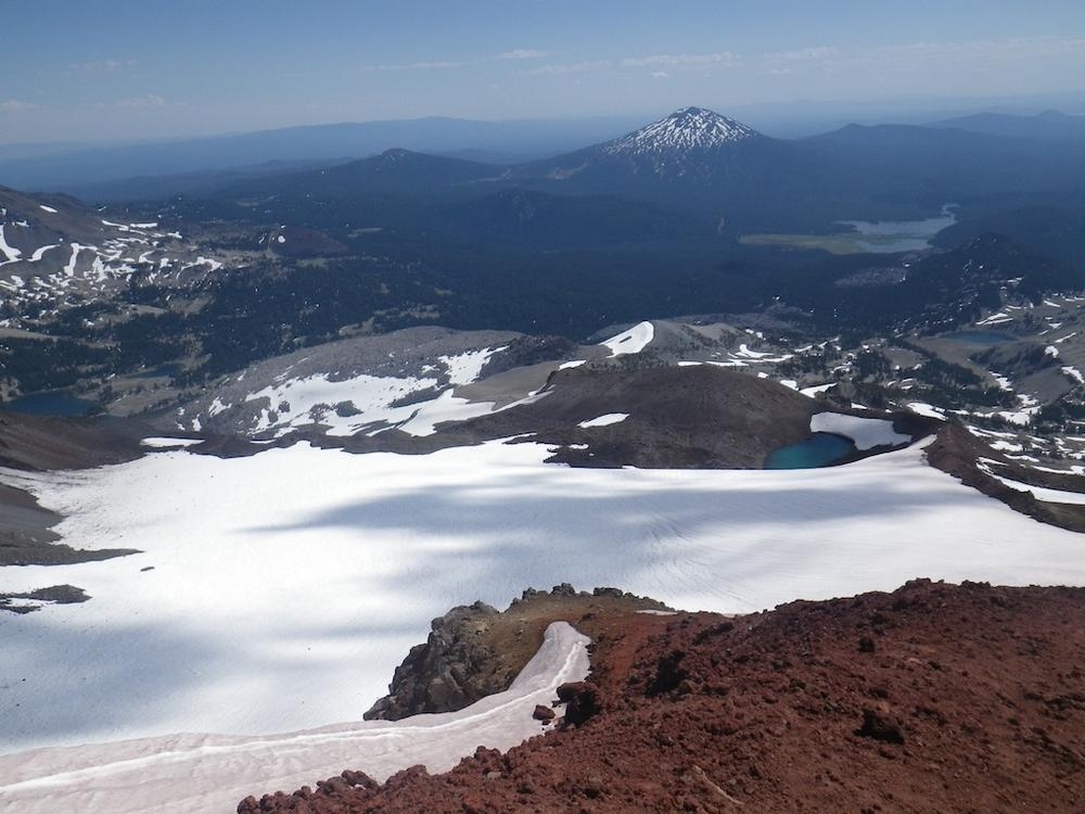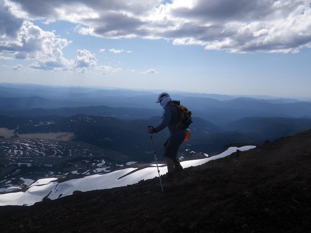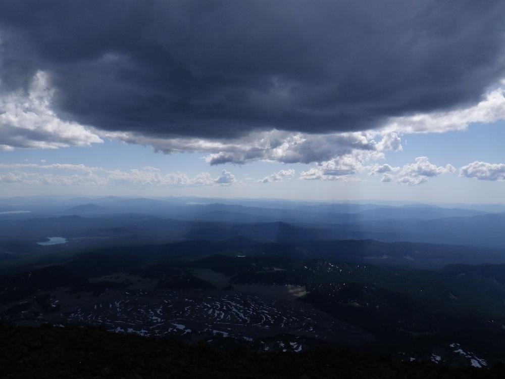 We ate our squished sandwiches and put more duct tape while enjoying the views that stretched North to Mt. Adams and South to Mt. Shasta. A cloud formed over us, providing nice shade and a little cooling. Under the cover of the cloud we bombed down the cinder dust.