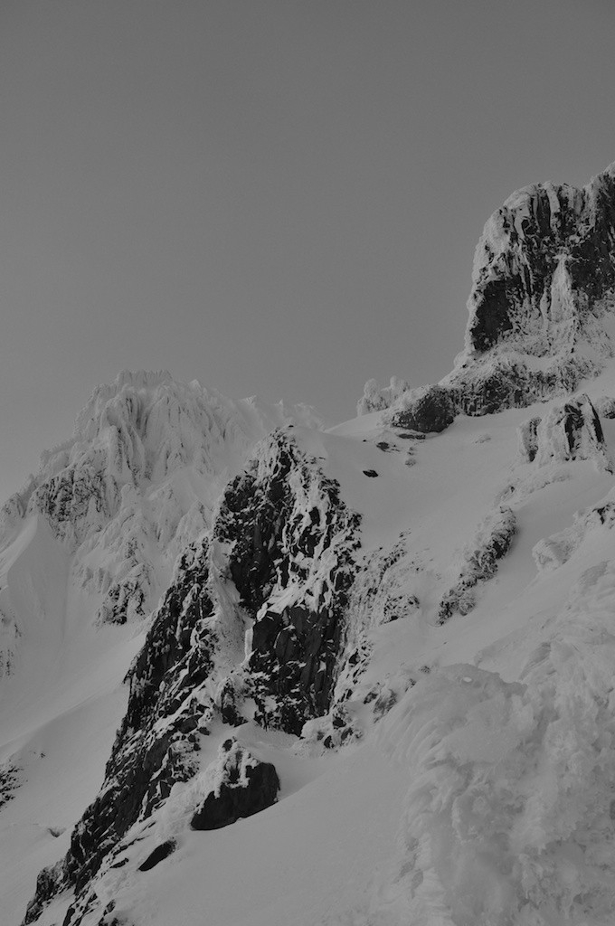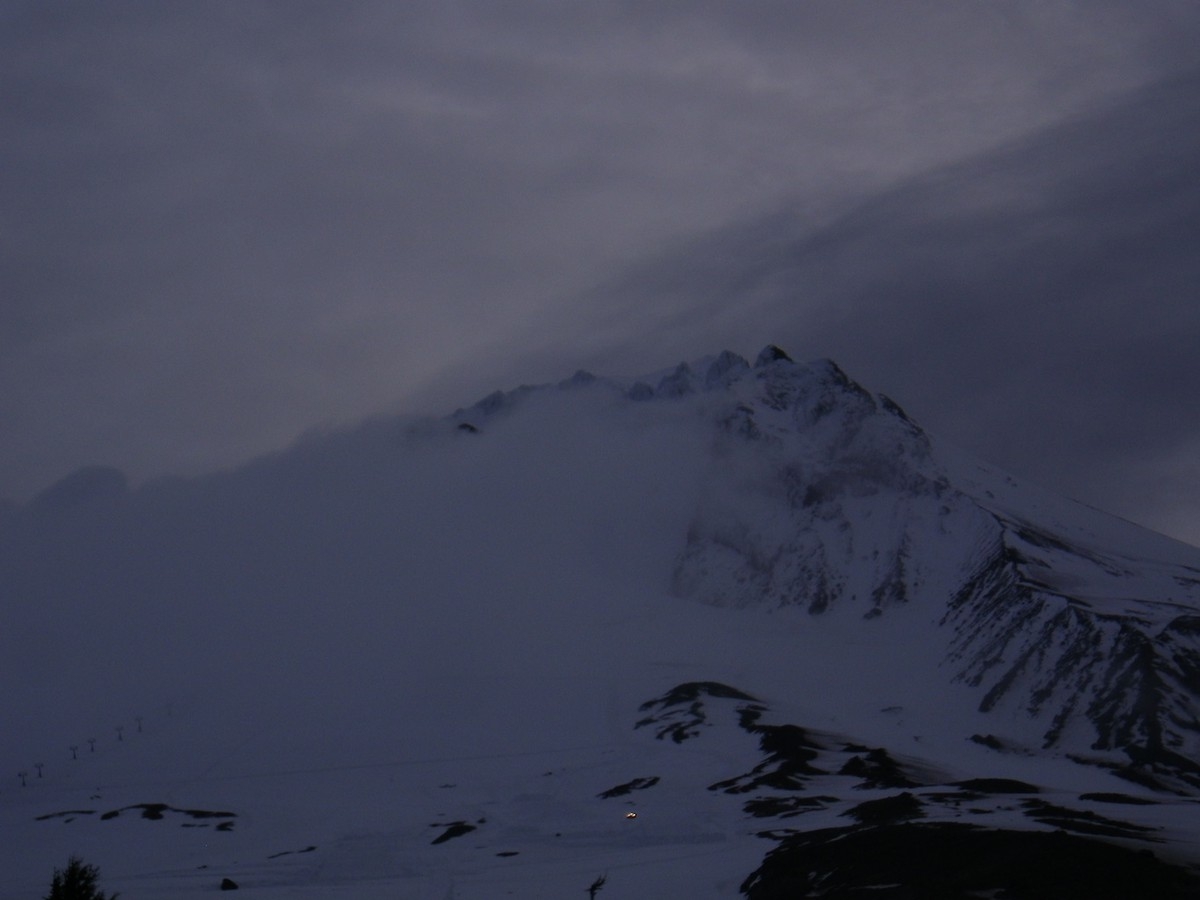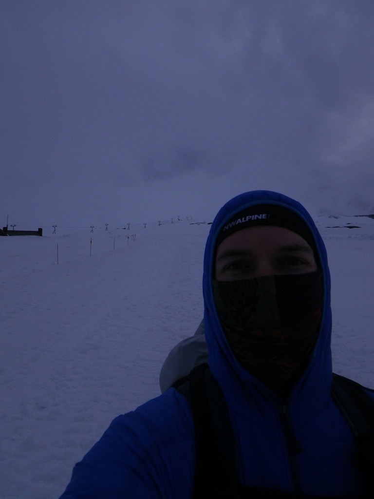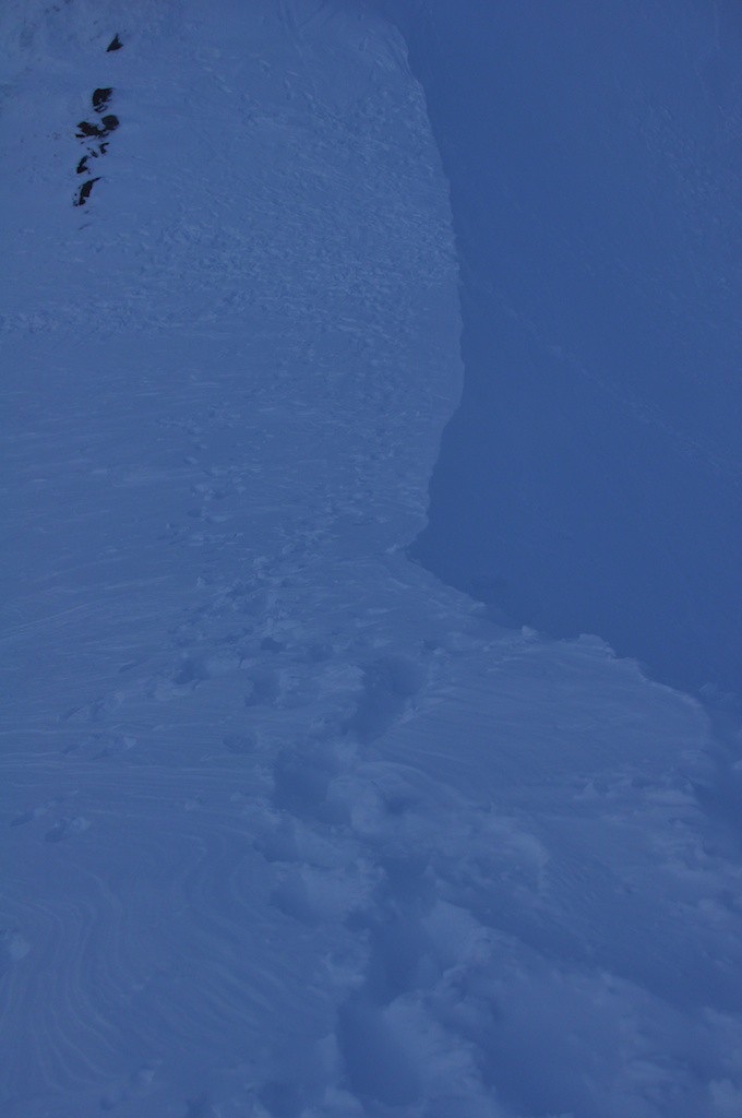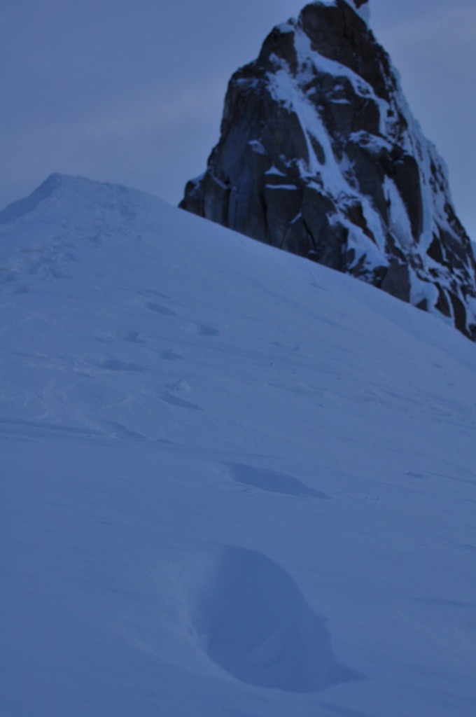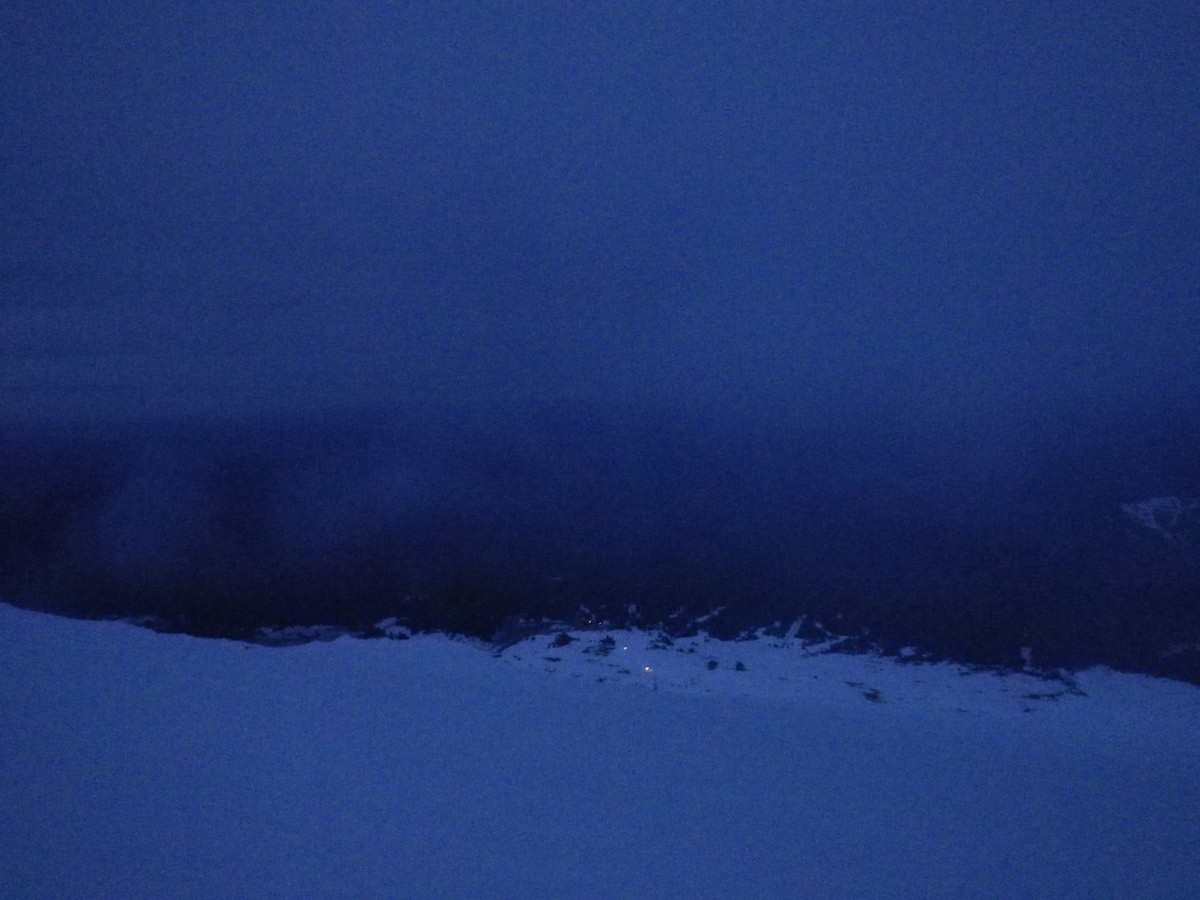 I woke up early in order to get back to town for work, only to see a near white out. Maybe a slight exaggeration, but I was unable to see down the mountain with visibility at around 20 feet. I took out my map and compass, realizing I should take a navigation course. Luckily the tracks from the previous day were still usable and I followed them down to the top of the Palmer where it was visible again.