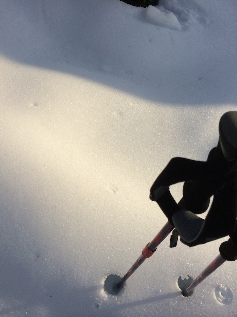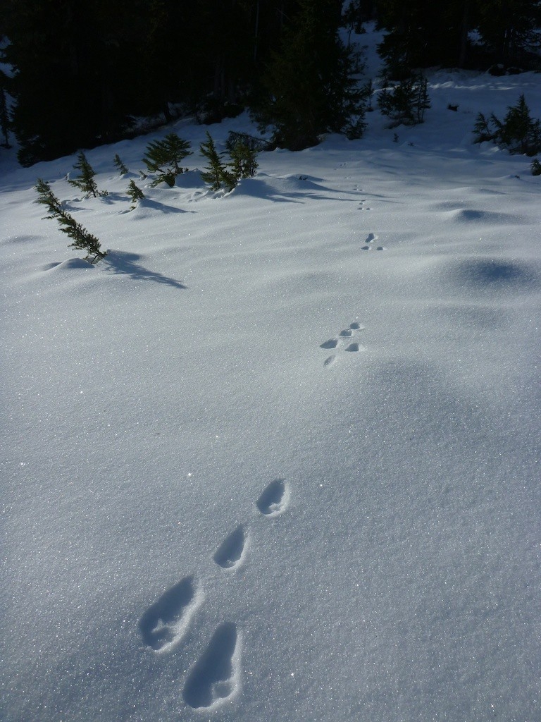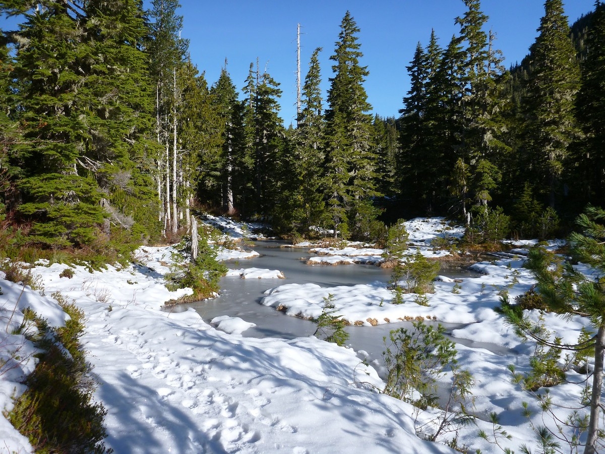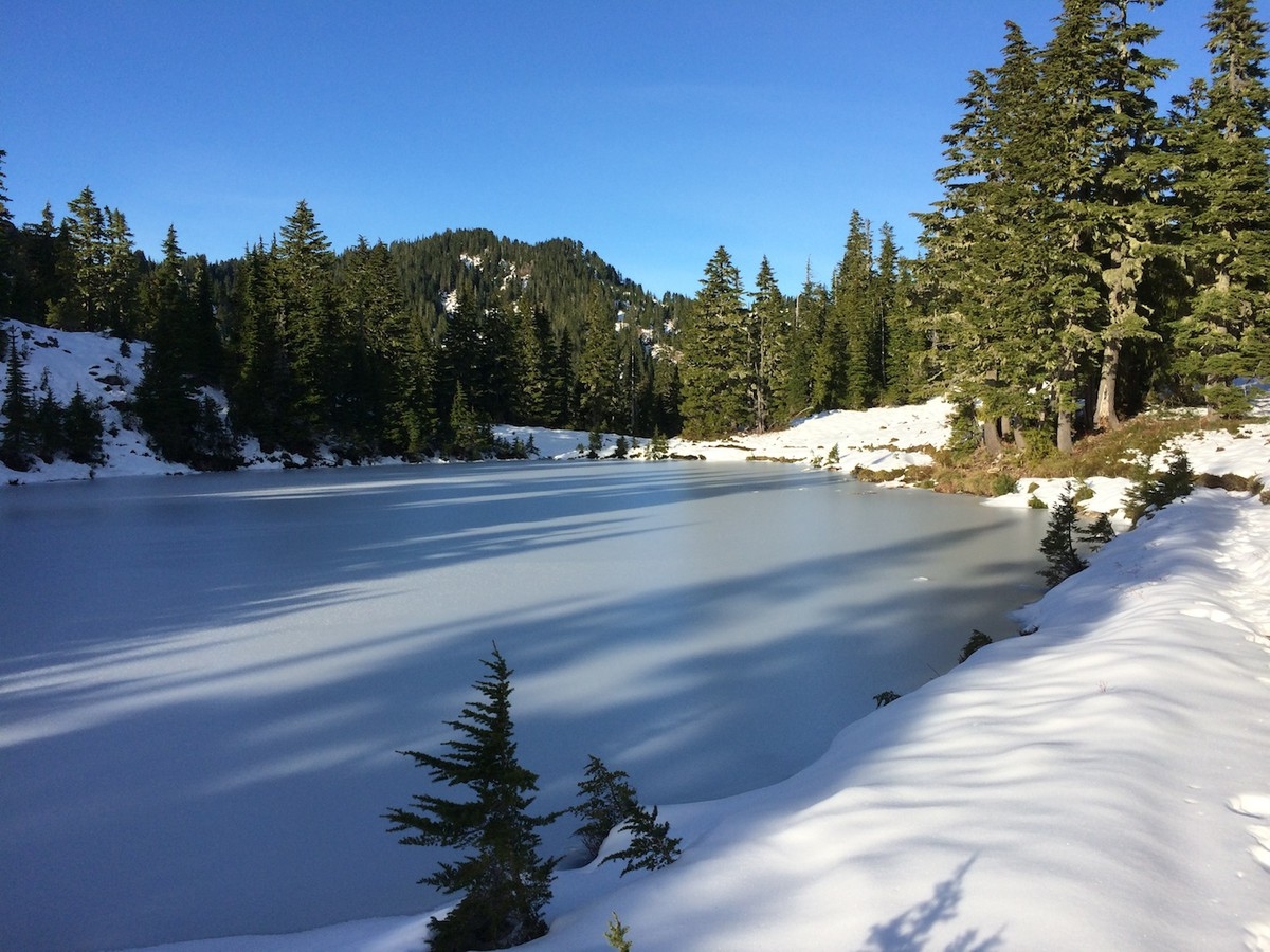 There were some animal tracks that crossed back and forth the trail, some looked like bunny tracks, while another set looked like cat tracks. Probably too small to be cougar but I put my sunglasses on the back of my head nonetheless. I hoofed it past the frozen lakes and finally down to the snow free trail. I rolled my ankle on a dumb rock and my hoofing turned into a limping gait back to the truck.