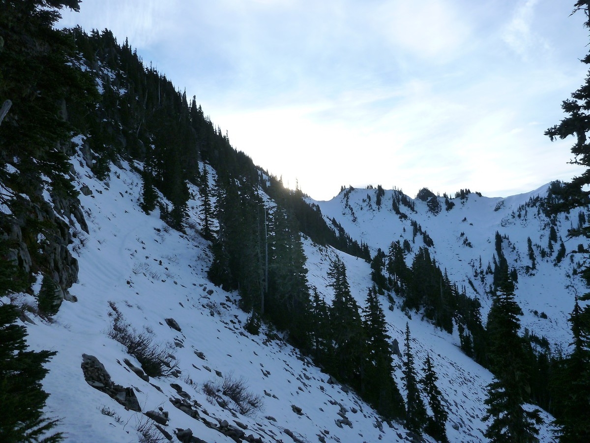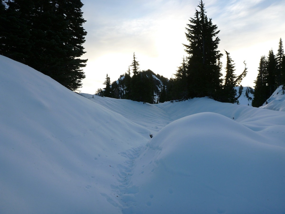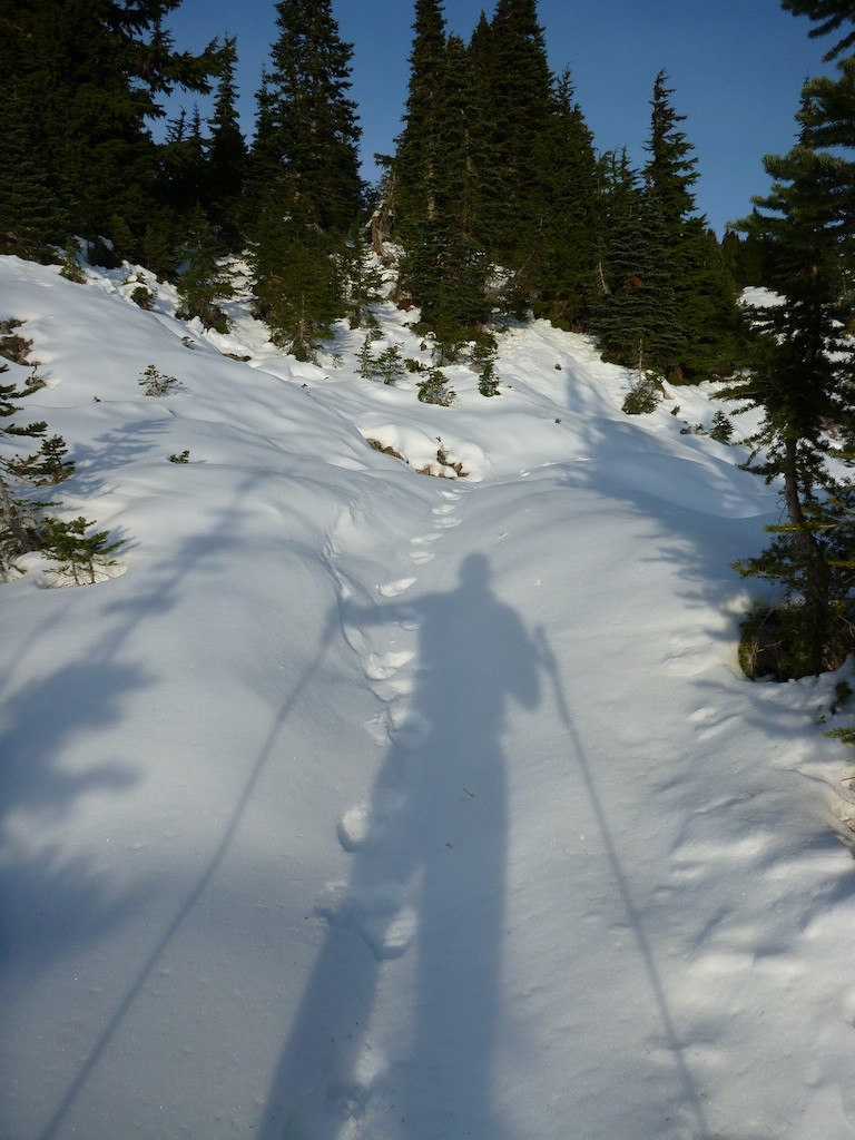 I had checked snow reports and web cams from a neighbouring (Hurricane) ridge and it looked like there would just be a few inches of snow and thus doable in trail runners. This ridge and trail had much more than a dusting, and turned into postholing a thousand feet below the high point of the hike. Someone had gone up the previous day so I followed his boot tracks until they stopped and turned around. I used my GPS to follow the hidden trail for another mile in an attempt to get a view of the Olympic Range itself. I made it to within a quarter mile but turned around myself as the snow and hill angles got iffy.