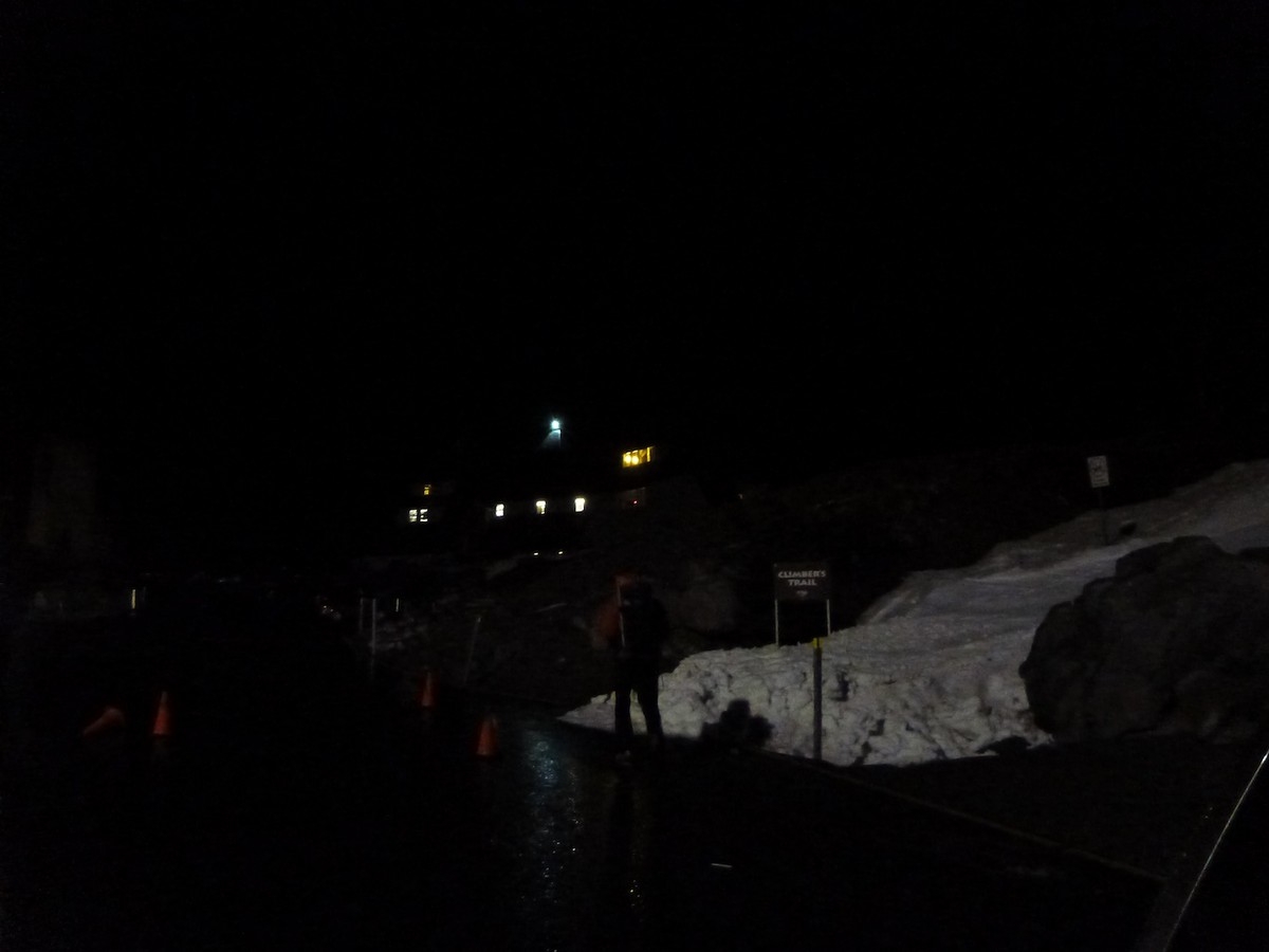 At about 8200’ we got above the clouds and were able to see the stars framing Mt. Hood. Keevin pulled up and said he was done as he had just flown from Italy and was beat. It was still uber windy and I asked Paul what he thought and he said something along the lines of ‘meh’, so we took off the man pants, turned around and stomped down through the fog back to the car. I split our summit cookies between the three of us and we drove back to town through the persistent rain.