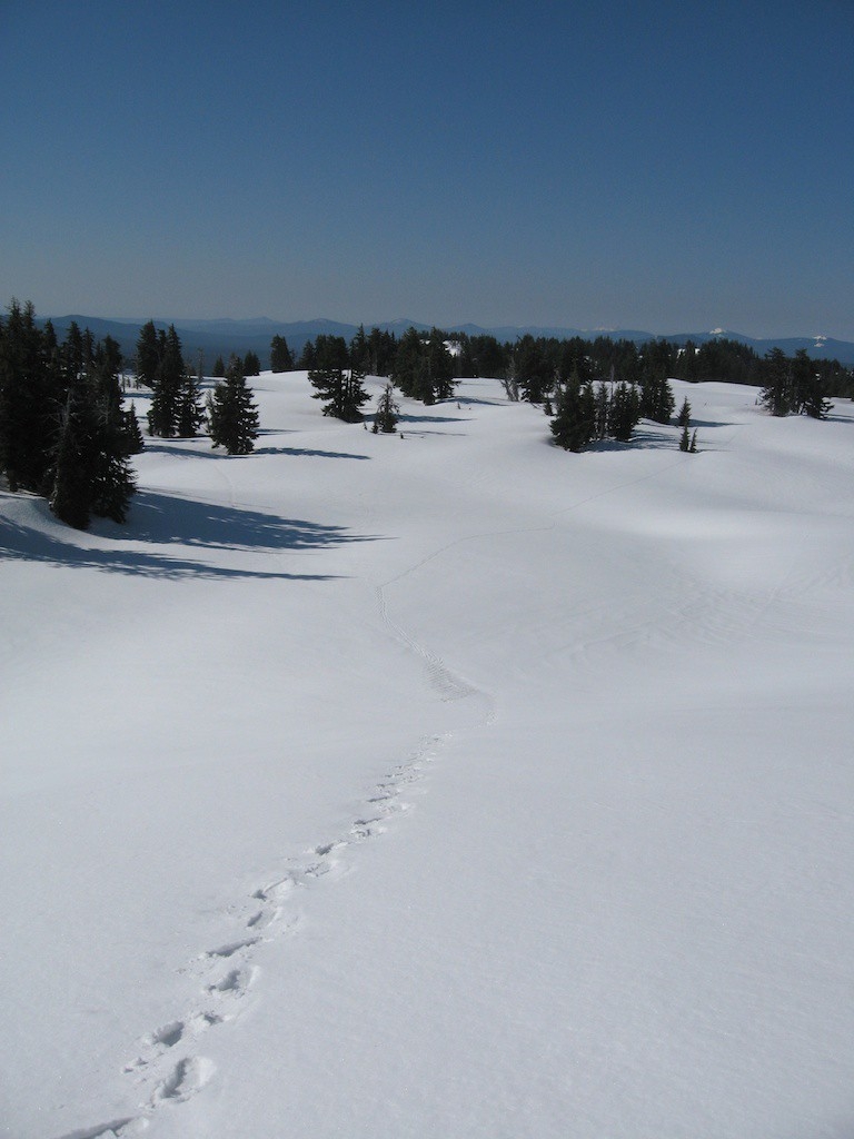 After skiing the flats towards the trailhead it was mainly by hoof until I was in sight of Mt. Bachelor where I was able to ski a few miles to the car.