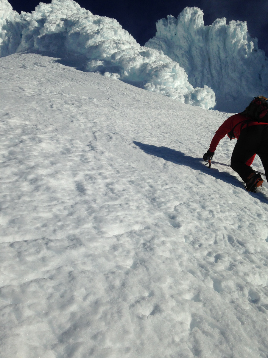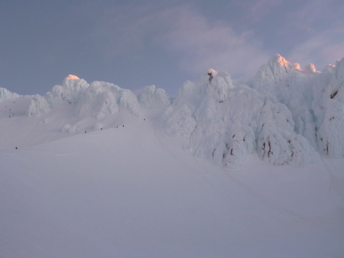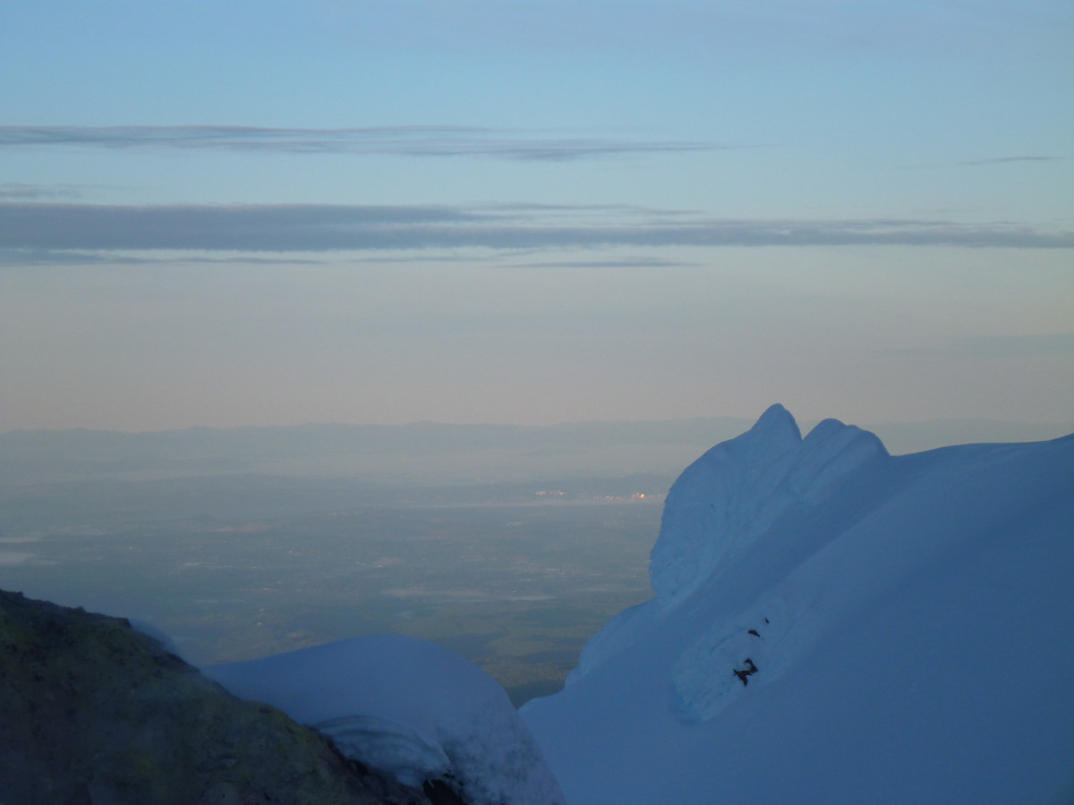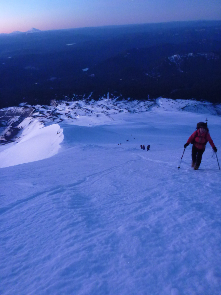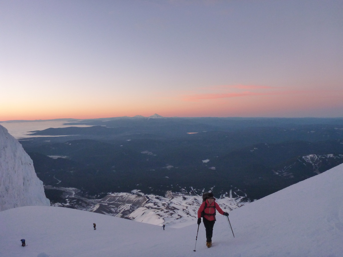 My buddy Kari and I went up to Mt. Hood to try and get in a winter ascent. As this was ‘winter’, we purposefully left late at 4am so we could enjoy some sunshine during the climb. A thick ream of climber registrations showed we would not be alone on the hill. On the slog up we commiserated about how packing for a climb always takes 3 hours, regardless of how much goes into the pack. The moon lit the way for an hour or so until it dropped below the ocean and we were left with our headlamps. Despite the top of the Palmer having been moved further north we made good progress up the glacier. We stopped to eat and put on crampons while listening to others plan for their respective climbs. While strapping on the crampons I realized they were adjusted for my ski boots and were a little loose and one of the heel straps was broken. Lame. At about 9500’ our stoke started to run out. The diagnosis was a case of I-don’t-wannas combined with feeling out of shape. This was Kari’s second outing on her newly repaired knee so she was deciding to top out at Hogsback. I really wanted to top out ten feet below us. We decided to keep going to Hogsback and make another call up there. Just as the sun poked over the rimed cliffs we got to the Hogsback. Kari called it for herself and offered to schlep the rope back down to the car. The summit was right there so I decided to keep going up, sans rope weight. The Pearly Gates looked pretty easy, even though another guy said it was icy and bailed back over to the Old Chute. I climbed up nice steps to the left chute of the Gates to see how it was. The right chute looked more promising until a barrage of large ice chunks flew down said chute. I kept going up the left one and talked to a dude ahead of me who was in the steps. About then a large chunk of ice came down and crashed in front of me, breaking into a lot of pieces and bouncing off of my helmet. He said that was it for him and downclimbed to me and on down to the Hogsback. I went up a little further to see how hard it was. It looked super cool, but after seeing my left crampon move around a bit and more ice coming down, I decided it was time to head back down as well. Rime ice continued to fall as I downclimbed to the Hogsback. Nothing terribly large was dropping so I finally felt comfortable. I saw one piece dropping and thought ‘That looks tiny, no biggie’ as it slammed into my right arm, causing me to scream like a child. That ended my thought of going up the Old Chute as I didn’t want any part of more falling ice. I stood on the Hogsback listening to others discuss the conditions and whether it was good to bail or not. There were at least 40 people on the Old Chute face, which further sealed the deal. I adjusted my malcontent crampon and headed down. A few hours of trudging got me to the top of the Palmer, where I wished I magically had my skis, or at least my sled that I left at home. Another hour of hiking got me back to the car, where Kari was hanging out with a cider for us to split. I offered up some chocolate and we had a ghetto picnic in the parking lot before driving back home.