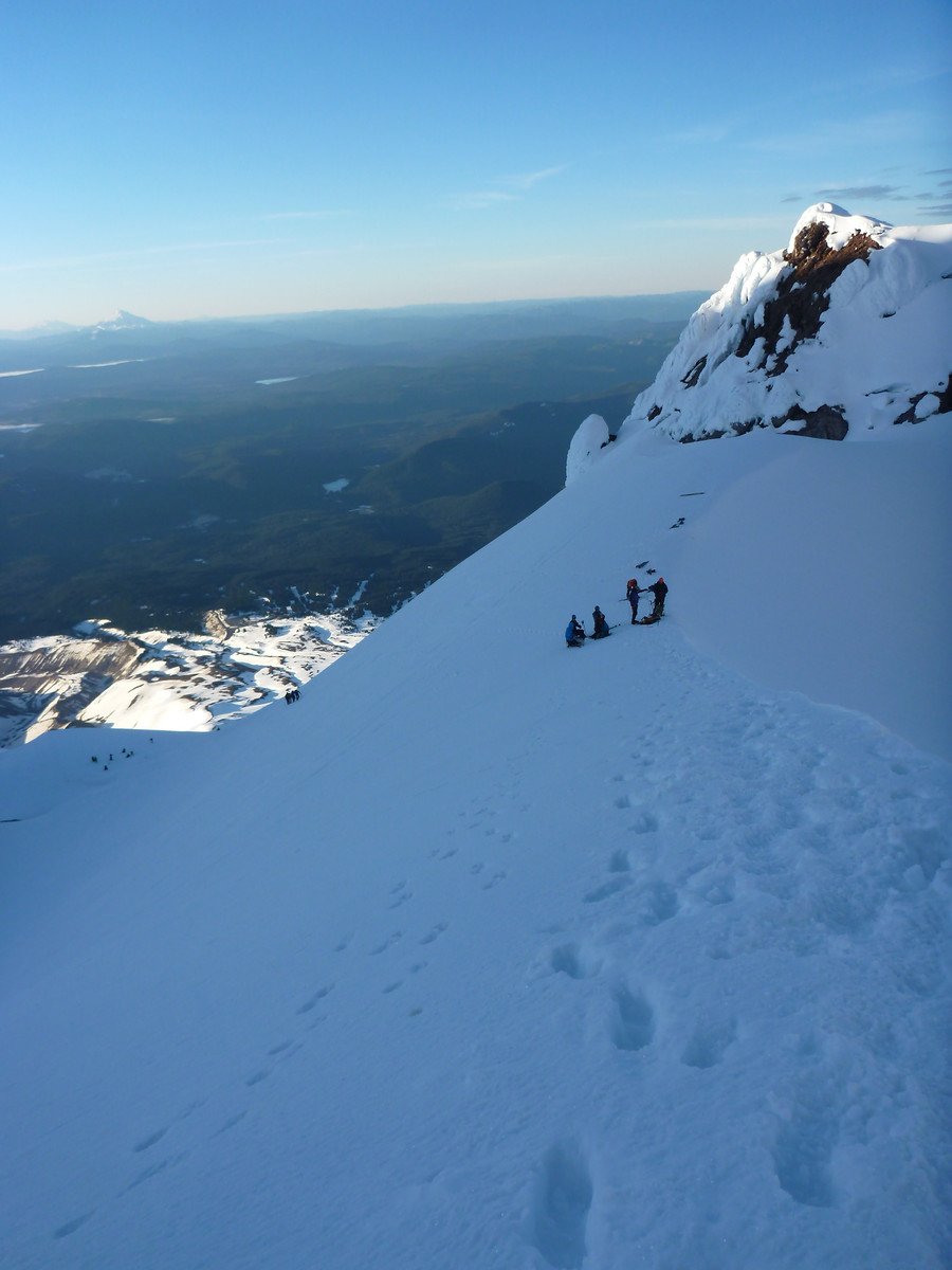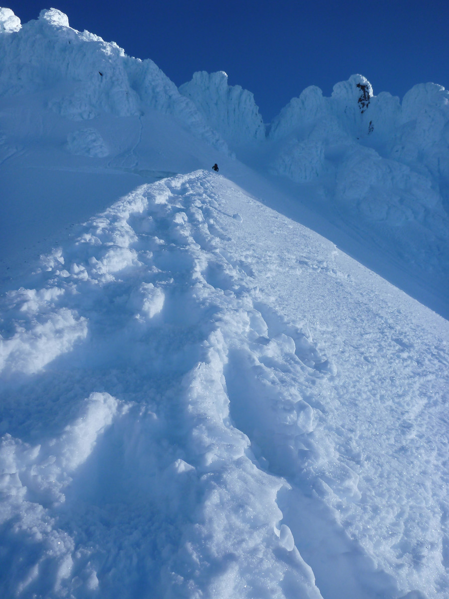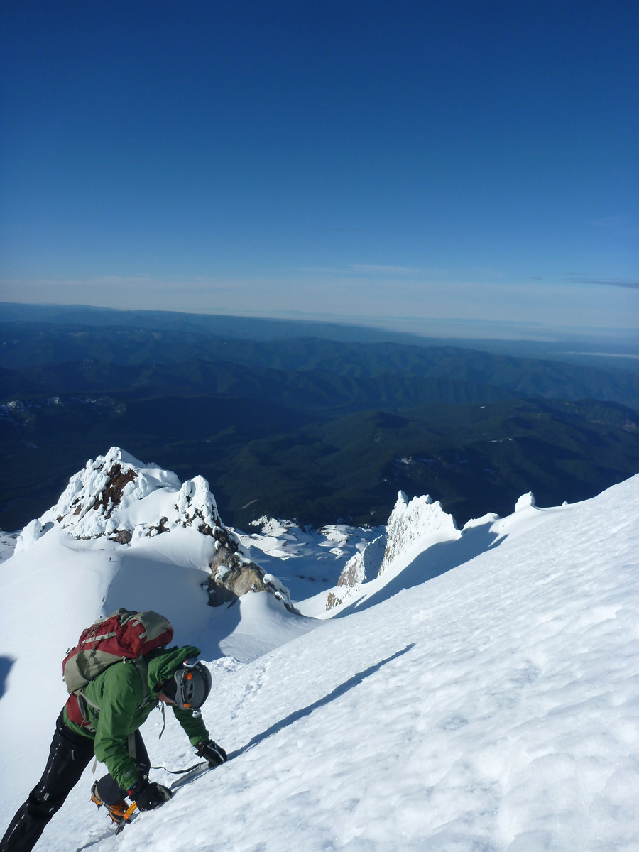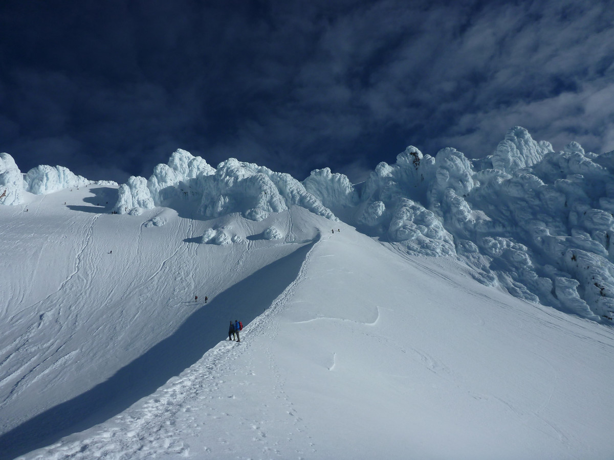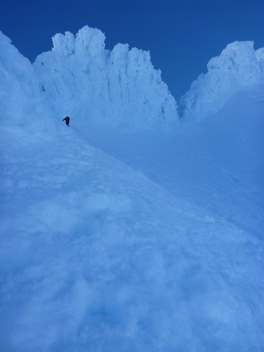 My buddy Kari and I went up to Mt. Hood to try and get in a winter ascent. As this was ‘winter’, we purposefully left late at 4am so we could enjoy some sunshine during the climb. A thick ream of climber registrations showed we would not be alone on the hill. On the slog up we commiserated about how packing for a climb always takes 3 hours, regardless of how much goes into the pack. The moon lit the way for an hour or so until it dropped below the ocean and we were left with our headlamps. Despite the top of the Palmer having been moved further north we made good progress up the glacier. We stopped to eat and put on crampons while listening to others plan for their respective climbs. While strapping on the crampons I realized they were adjusted for my ski boots and were a little loose and one of the heel straps was broken. Lame. At about 9500’ our stoke started to run out. The diagnosis was a case of I-don’t-wannas combined with feeling out of shape. This was Kari’s second outing on her newly repaired knee so she was deciding to top out at Hogsback. I really wanted to top out ten feet below us. We decided to keep going to Hogsback and make another call up there. Just as the sun poked over the rimed cliffs we got to the Hogsback. Kari called it for herself and offered to schlep the rope back down to the car. The summit was right there so I decided to keep going up, sans rope weight. The Pearly Gates looked pretty easy, even though another guy said it was icy and bailed back over to the Old Chute. I climbed up nice steps to the left chute of the Gates to see how it was. The right chute looked more promising until a barrage of large ice chunks flew down said chute. I kept going up the left one and talked to a dude ahead of me who was in the steps. About then a large chunk of ice came down and crashed in front of me, breaking into a lot of pieces and bouncing off of my helmet. He said that was it for him and downclimbed to me and on down to the Hogsback. I went up a little further to see how hard it was. It looked super cool, but after seeing my left crampon move around a bit and more ice coming down, I decided it was time to head back down as well. Rime ice continued to fall as I downclimbed to the Hogsback. Nothing terribly large was dropping so I finally felt comfortable. I saw one piece dropping and thought ‘That looks tiny, no biggie’ as it slammed into my right arm, causing me to scream like a child. That ended my thought of going up the Old Chute as I didn’t want any part of more falling ice. I stood on the Hogsback listening to others discuss the conditions and whether it was good to bail or not. There were at least 40 people on the Old Chute face, which further sealed the deal. I adjusted my malcontent crampon and headed down. A few hours of trudging got me to the top of the Palmer, where I wished I magically had my skis, or at least my sled that I left at home. Another hour of hiking got me back to the car, where Kari was hanging out with a cider for us to split. I offered up some chocolate and we had a ghetto picnic in the parking lot before driving back home.