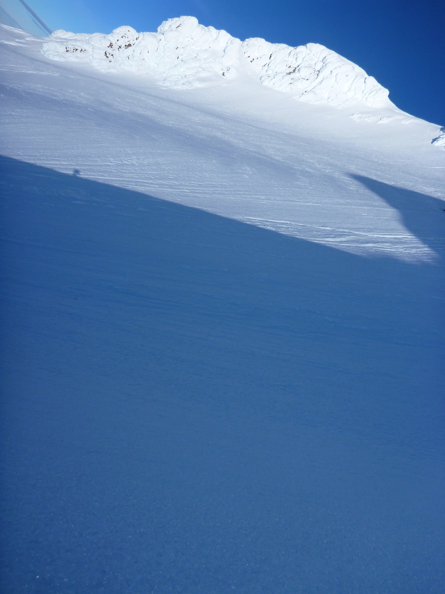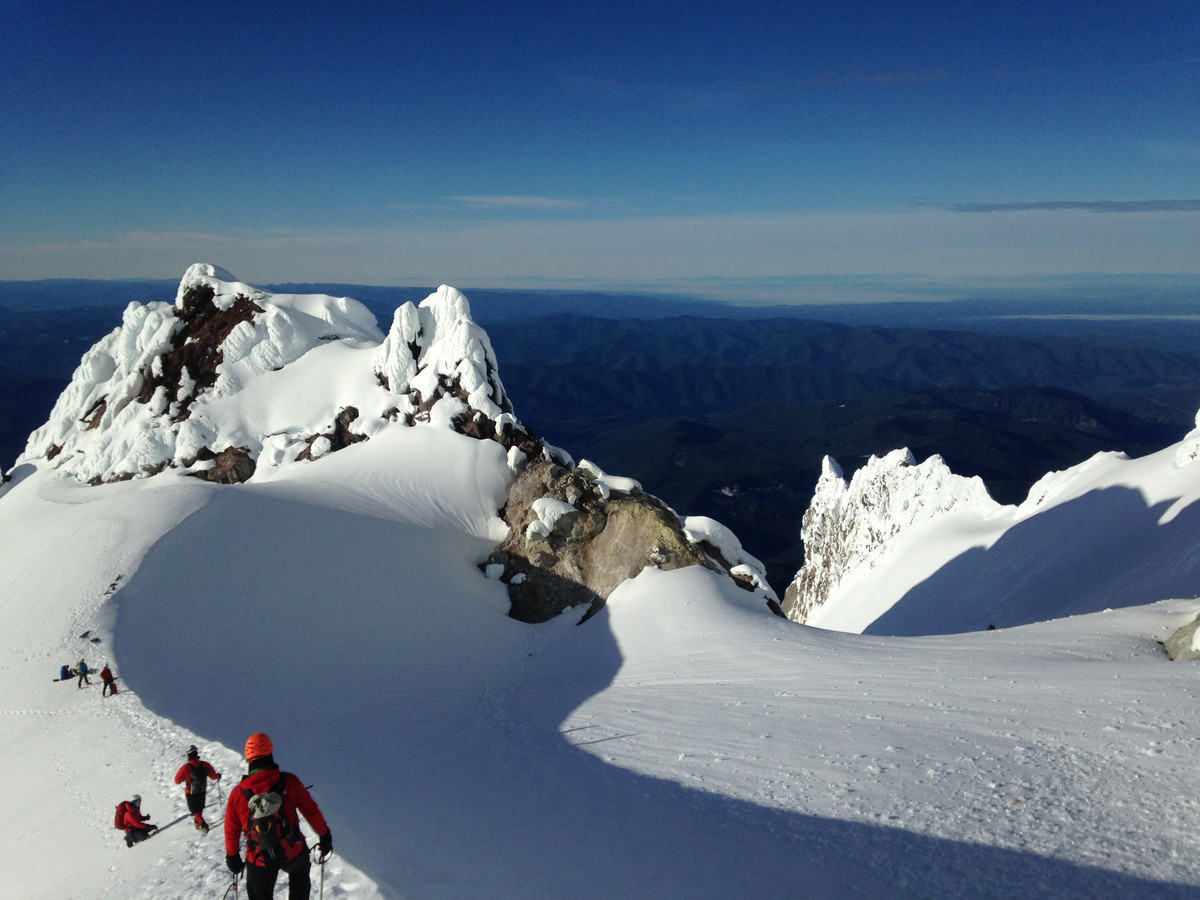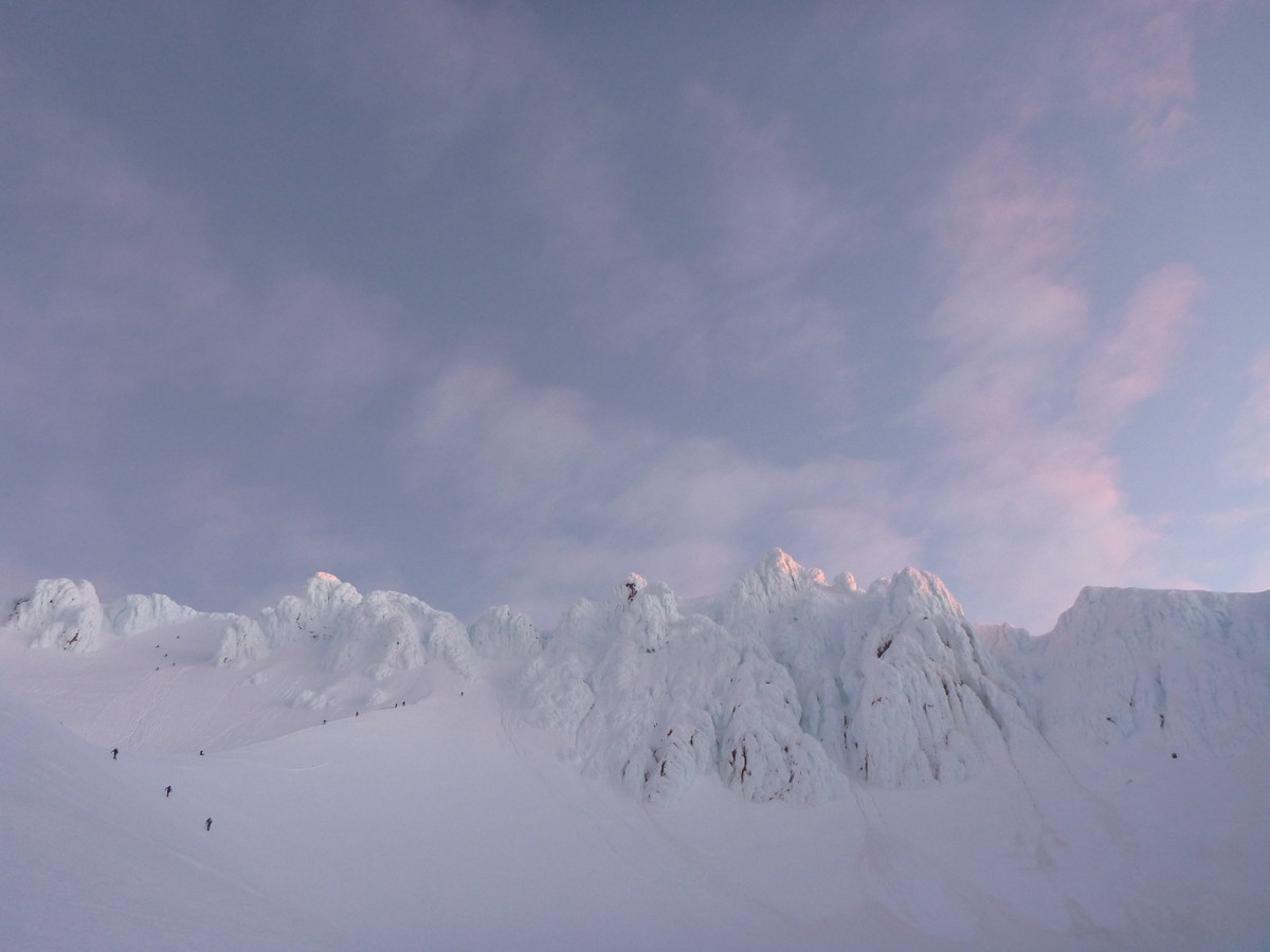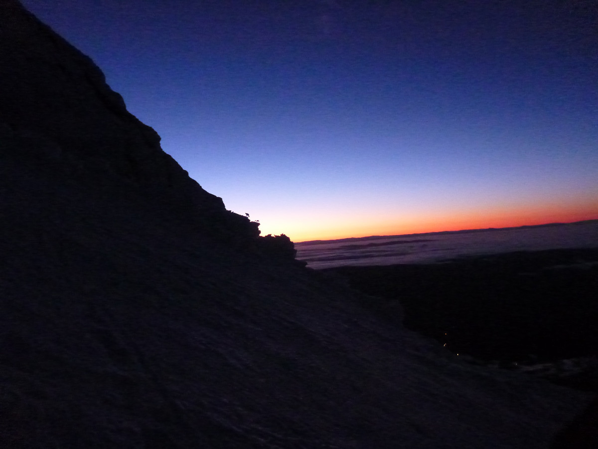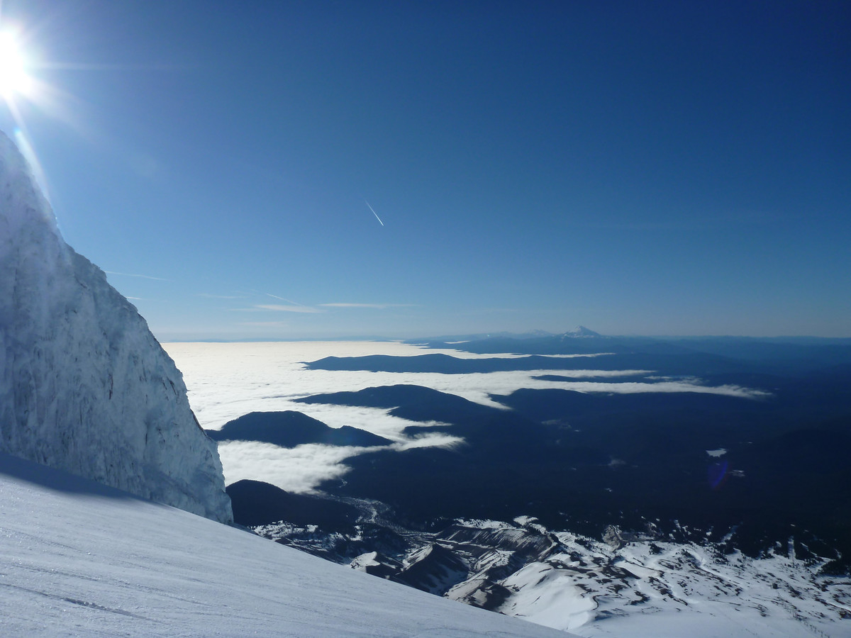 My buddy Kari and I went up to Mt. Hood to try and get in a winter ascent. As this was ‘winter’, we purposefully left late at 4am so we could enjoy some sunshine during the climb. A thick ream of climber registrations showed we would not be alone on the hill. On the slog up we commiserated about how packing for a climb always takes 3 hours, regardless of how much goes into the pack. The moon lit the way for an hour or so until it dropped below the ocean and we were left with our headlamps. Despite the top of the Palmer having been moved further north we made good progress up the glacier. We stopped to eat and put on crampons while listening to others plan for their respective climbs. While strapping on the crampons I realized they were adjusted for my ski boots and were a little loose and one of the heel straps was broken. Lame. At about 9500’ our stoke started to run out. The diagnosis was a case of I-don’t-wannas combined with feeling out of shape. This was Kari’s second outing on her newly repaired knee so she was deciding to top out at Hogsback. I really wanted to top out ten feet below us. We decided to keep going to Hogsback and make another call up there. Just as the sun poked over the rimed cliffs we got to the Hogsback. Kari called it for herself and offered to schlep the rope back down to the car. The summit was right there so I decided to keep going up, sans rope weight. The Pearly Gates looked pretty easy, even though another guy said it was icy and bailed back over to the Old Chute. I climbed up nice steps to the left chute of the Gates to see how it was. The right chute looked more promising until a barrage of large ice chunks flew down said chute. I kept going up the left one and talked to a dude ahead of me who was in the steps. About then a large chunk of ice came down and crashed in front of me, breaking into a lot of pieces and bouncing off of my helmet. He said that was it for him and downclimbed to me and on down to the Hogsback. I went up a little further to see how hard it was. It looked super cool, but after seeing my left crampon move around a bit and more ice coming down, I decided it was time to head back down as well. Rime ice continued to fall as I downclimbed to the Hogsback. Nothing terribly large was dropping so I finally felt comfortable. I saw one piece dropping and thought ‘That looks tiny, no biggie’ as it slammed into my right arm, causing me to scream like a child. That ended my thought of going up the Old Chute as I didn’t want any part of more falling ice. I stood on the Hogsback listening to others discuss the conditions and whether it was good to bail or not. There were at least 40 people on the Old Chute face, which further sealed the deal. I adjusted my malcontent crampon and headed down. A few hours of trudging got me to the top of the Palmer, where I wished I magically had my skis, or at least my sled that I left at home. Another hour of hiking got me back to the car, where Kari was hanging out with a cider for us to split. I offered up some chocolate and we had a ghetto picnic in the parking lot before driving back home.