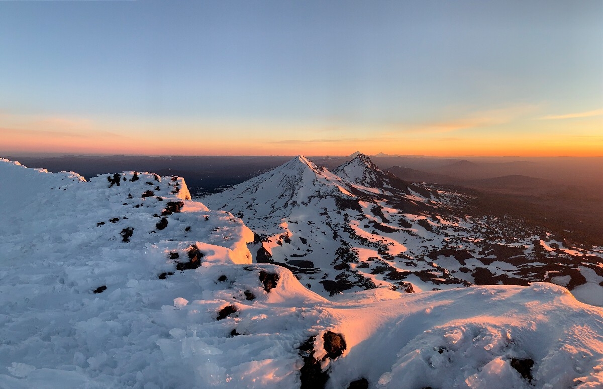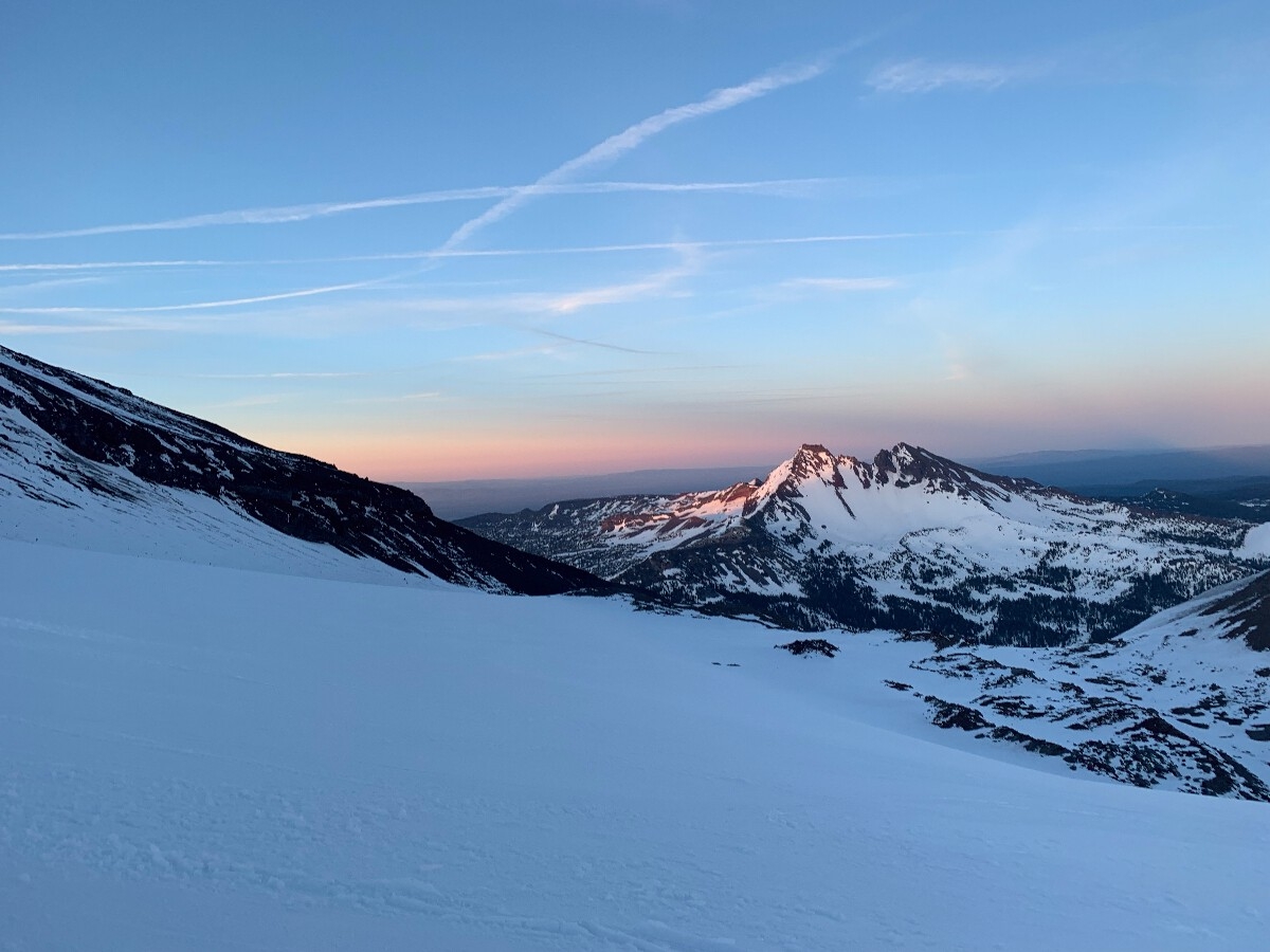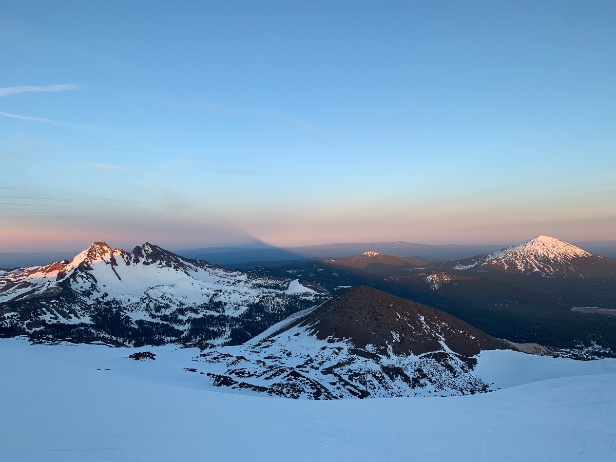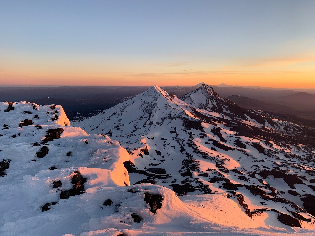 Trey and I trudged up South Sister to bivy on the summit. We got there way past dark and it was chilly as I saved 6oz by leaving the tent fly in the car. I might’ve burned a hole in my sock trying to dry it out, so I stole Trey’s socks for the next day. The summit sunrise was spectacular as expected and requested.