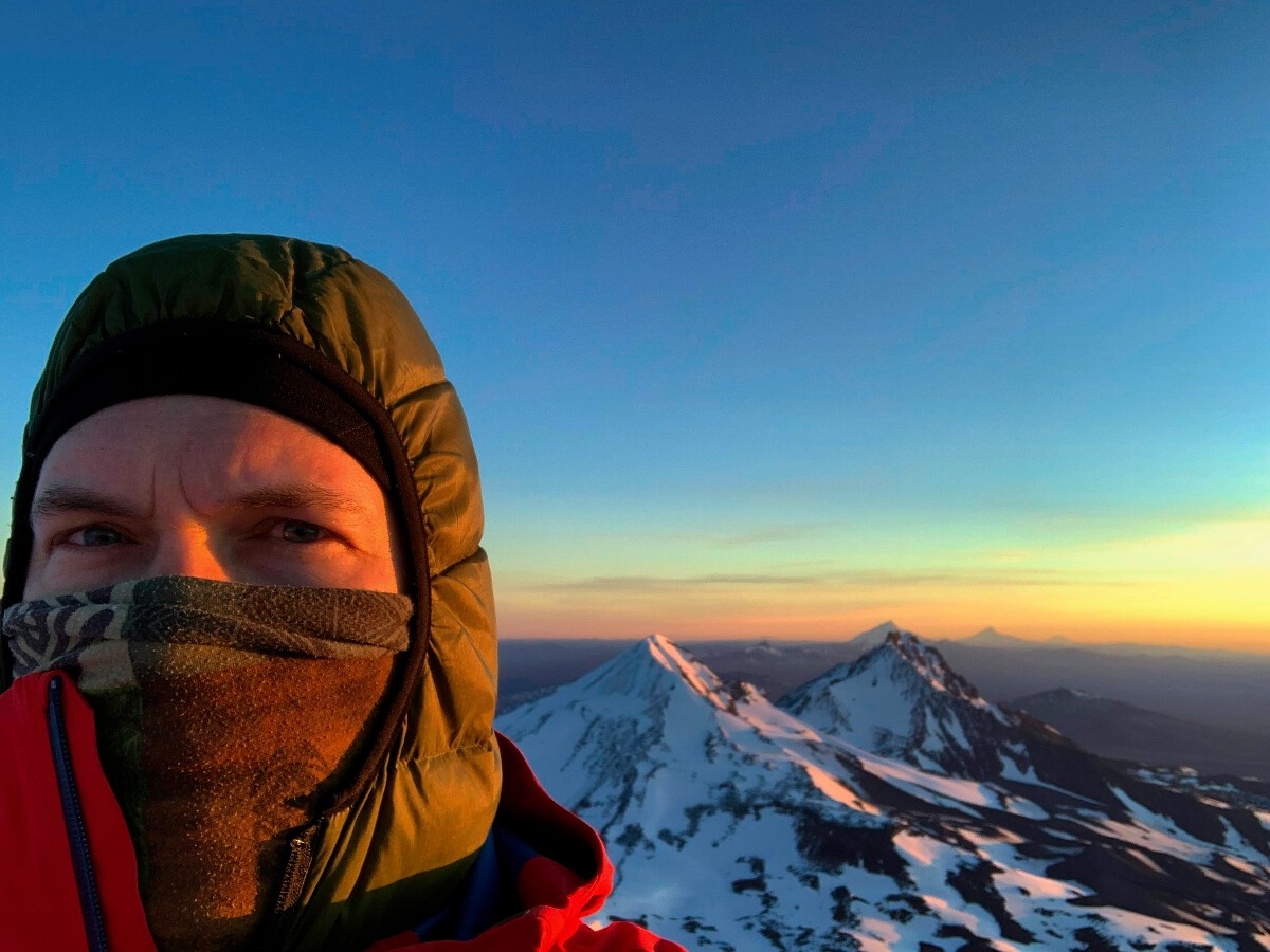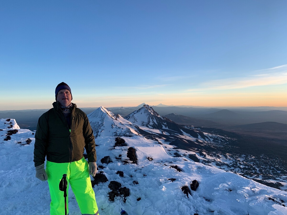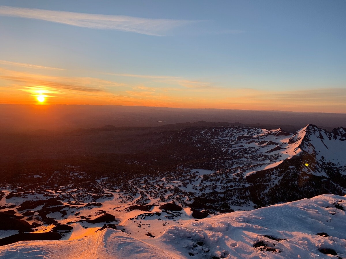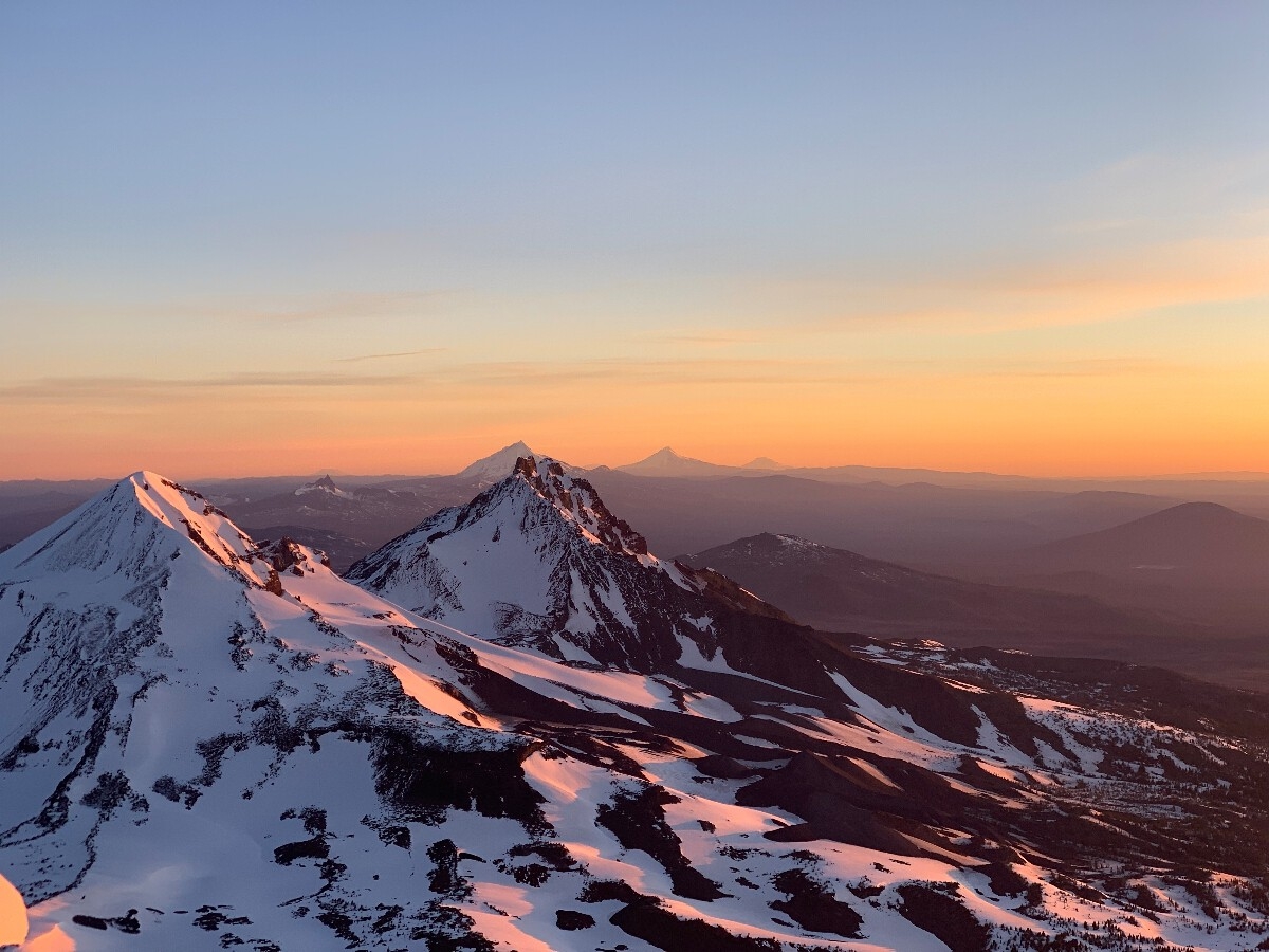 Trey and I trudged up South Sister to bivy on the summit. We got there way past dark and it was chilly as I saved 6oz by leaving the tent fly in the car. I might’ve burned a hole in my sock trying to dry it out, so I stole Trey’s socks for the next day. The summit sunrise was spectacular as expected and requested.