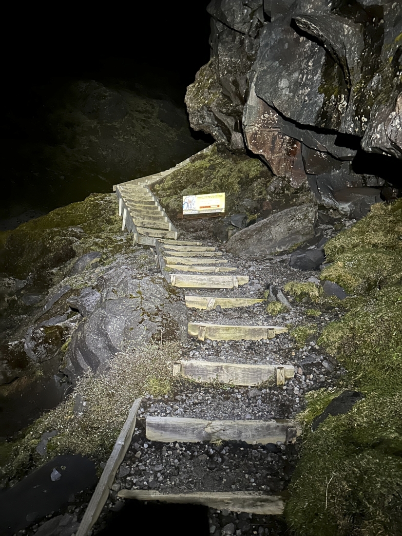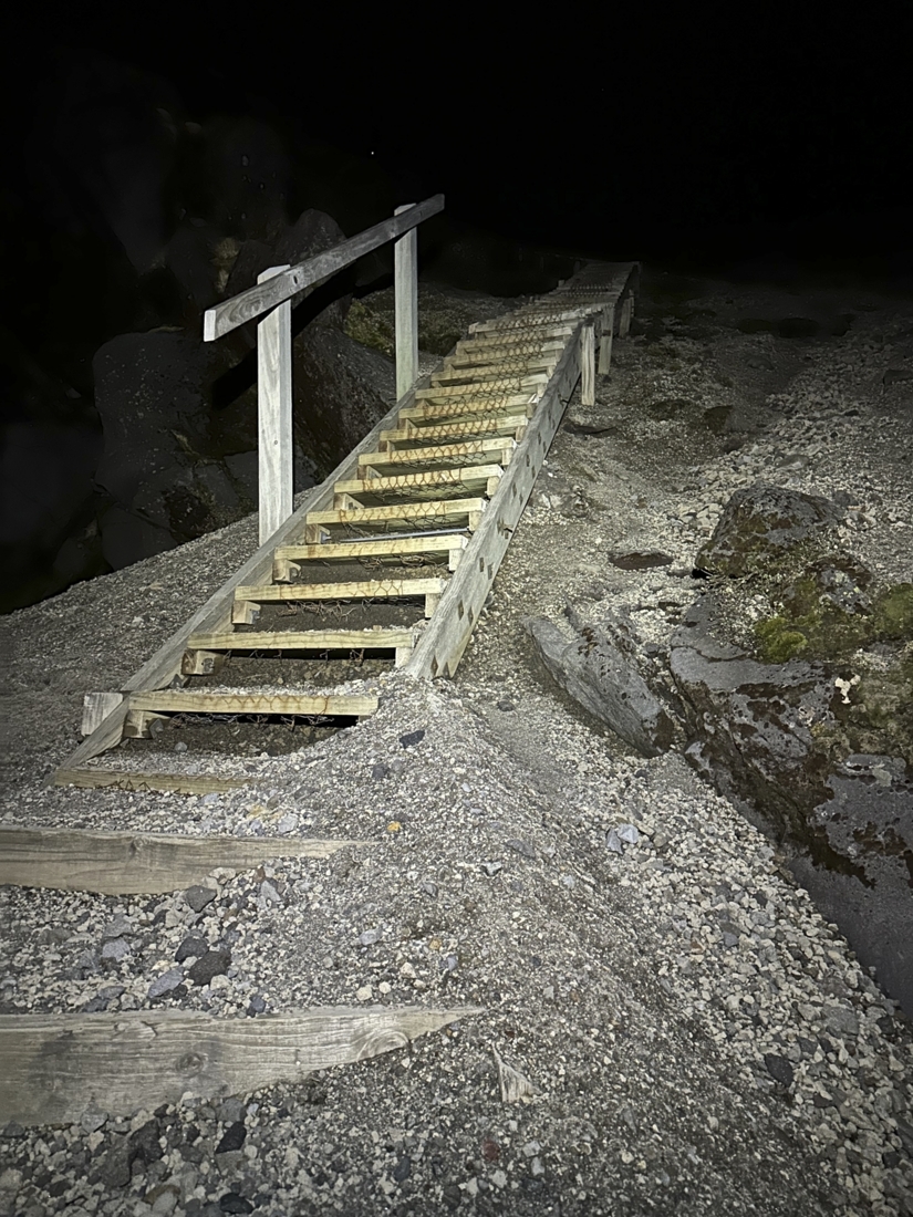 A 3am wakeup had me on the trail at 3:45. There was a large section with stairs, to get around erosion of the choss. After the stairs there was more choss and then a bunch of boulders to climb around and over.