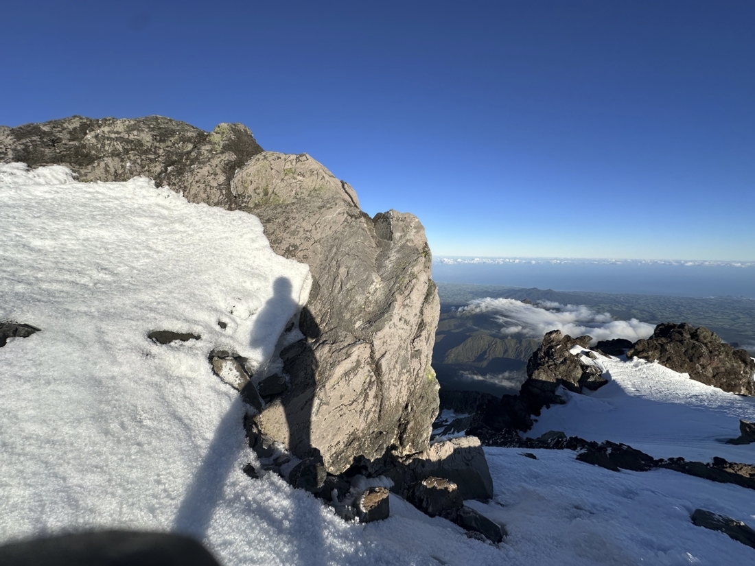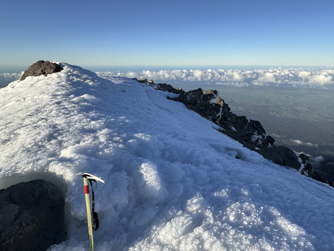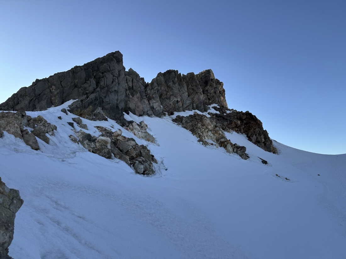 I made pretty good time to the crater rim and then donned crampons and walked under the Sharks Fin. AFter going under the Fin I realized I should’ve just gone straight right up to the summit. So I slowly made way over to base of proper summit and went up the icy snow. Spent twenty minutes on top looking around and then downclimbed to the trail and hiked out.